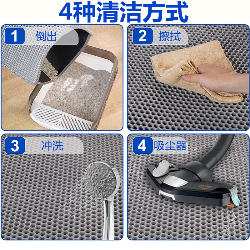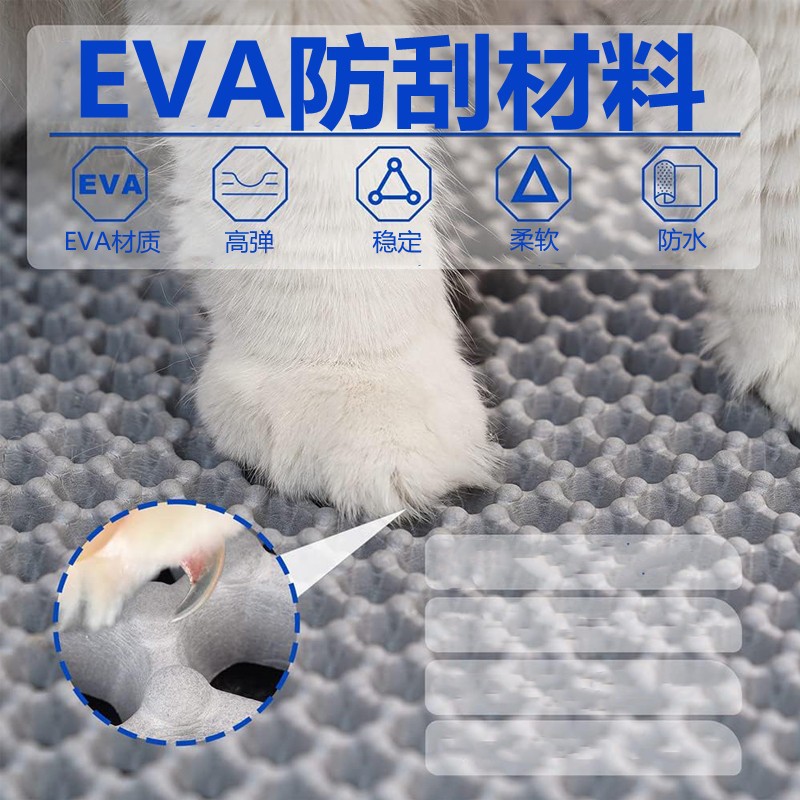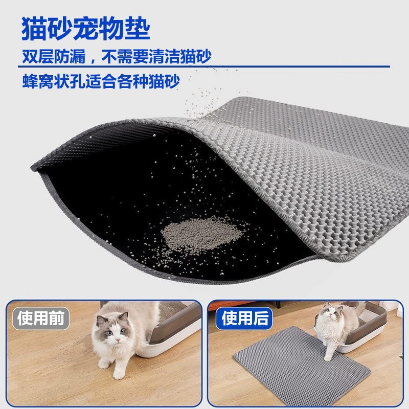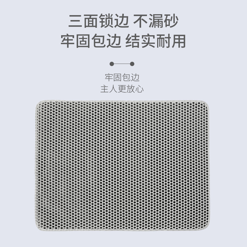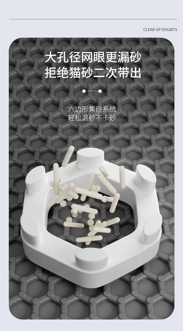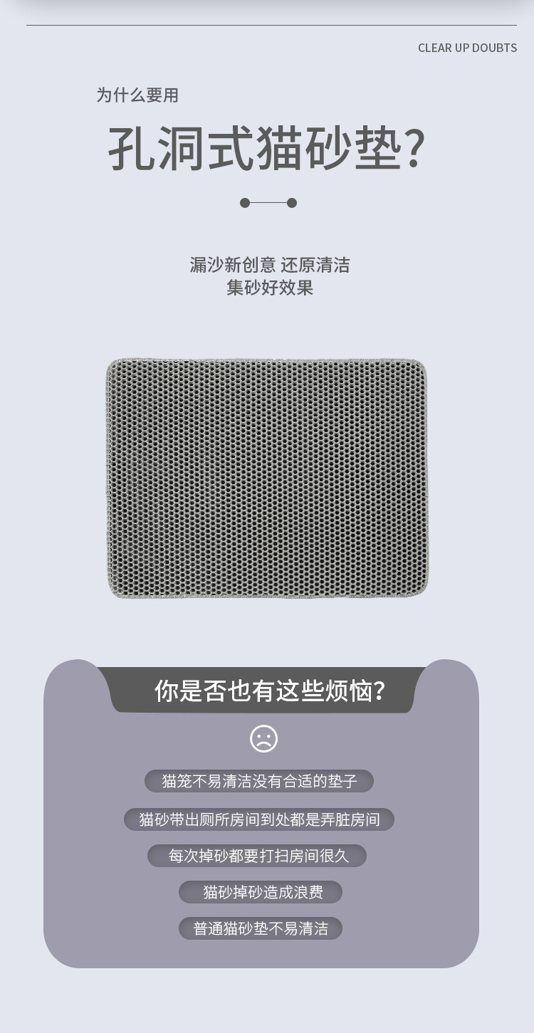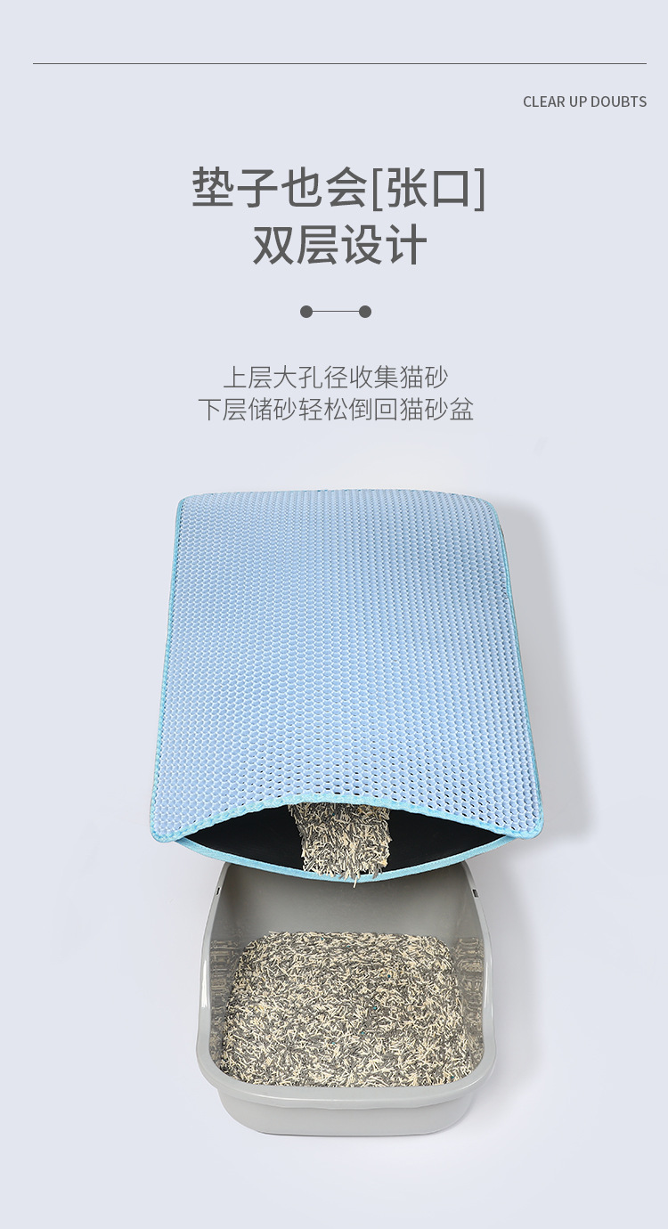产品功能:适用95%以上种类的猫砂,上层通孔材料,猫砂可轻易通过,下层防水材质,猫砂、小便等脏物可聚集于此。猫砂垫为上下双层设计:上层采用六角形的洞孔凹凸设计,除了让猫砂落入后不再溅出外,圆球型的柔滑触感也可以避免猫咪抓坏,下层垫密封专门存放猫砂,底部设计成规则性的圆孔,有效防滑避免横冲直撞的猫咪滑到受伤。