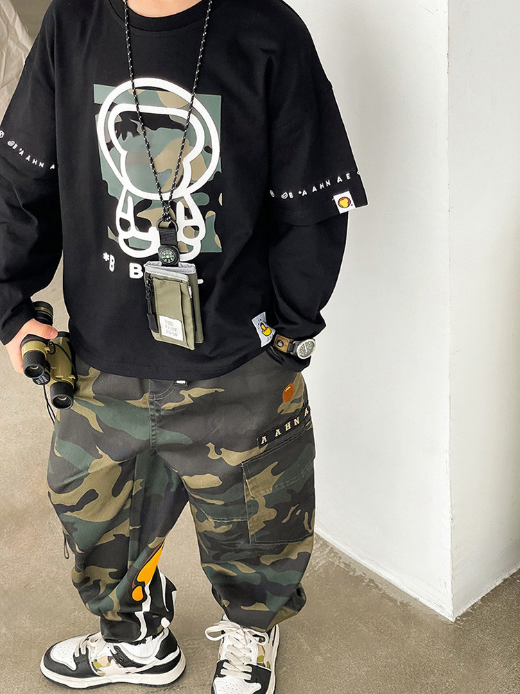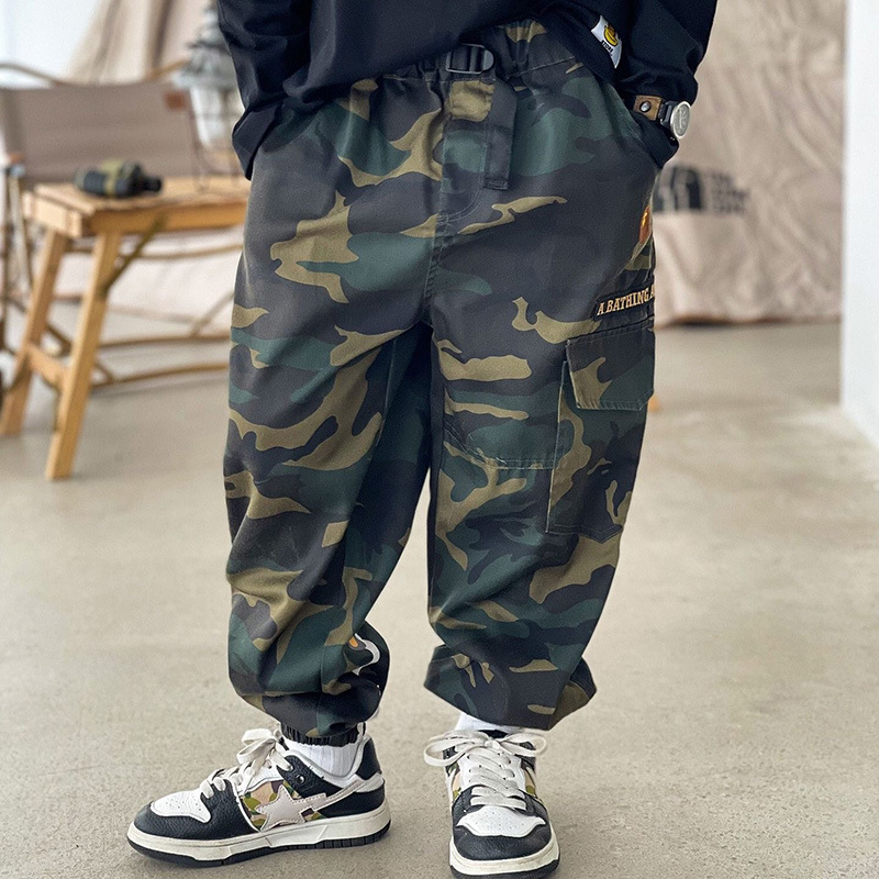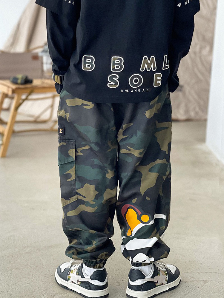 가을 아동복 일본 스타일 트렌드 브랜드 2025 신상 아동 작업복 바지 만화 원숭이 남아용 큰 주머니 카모플라주 조거 팬츠