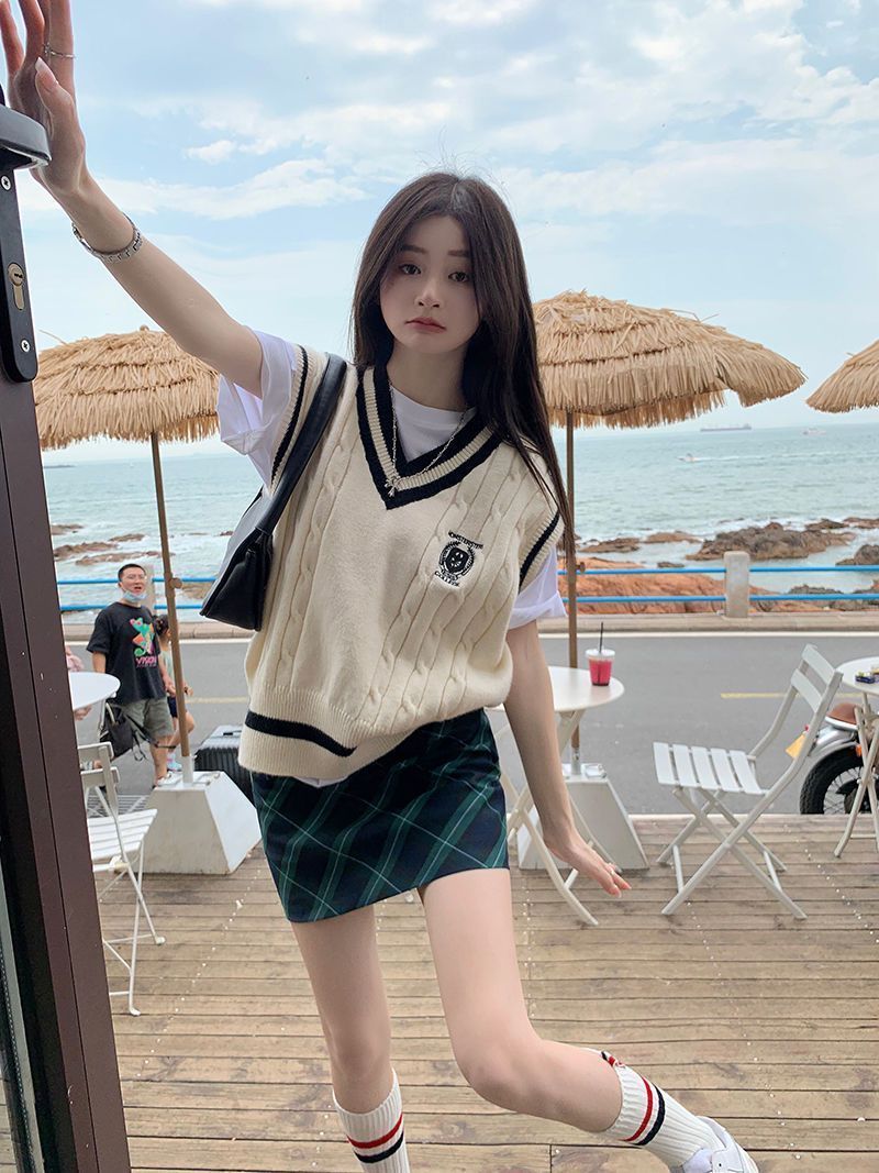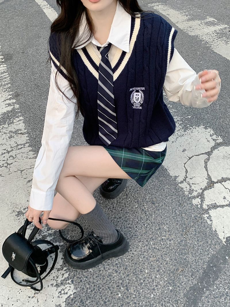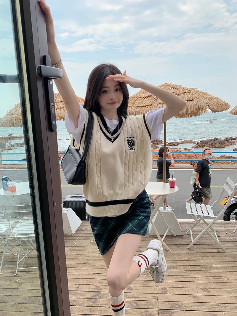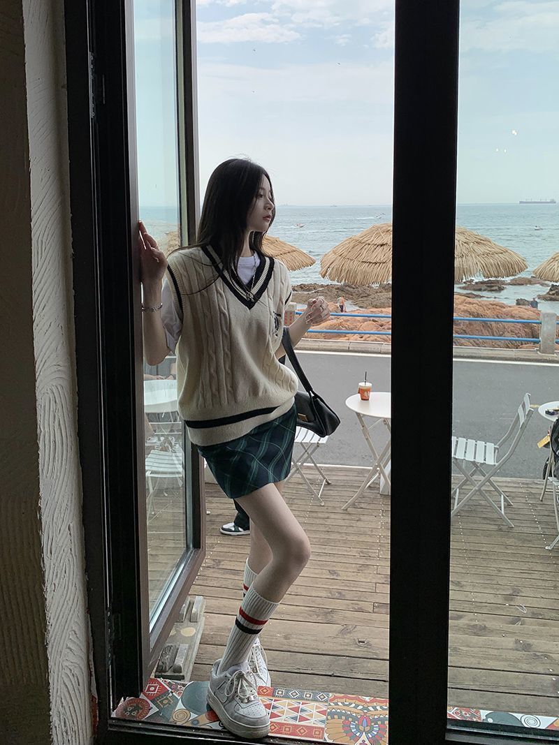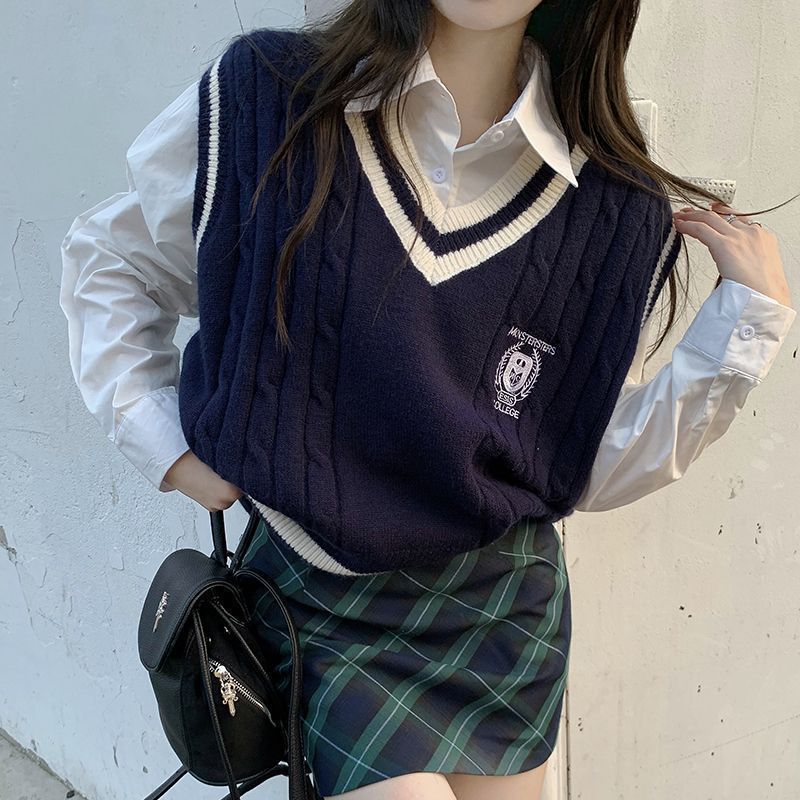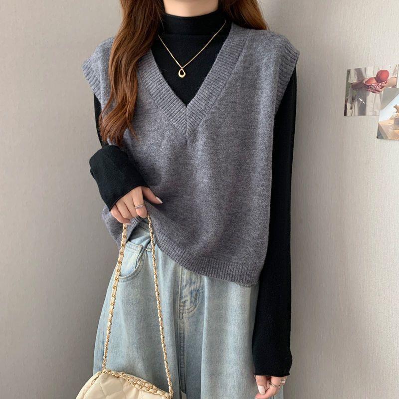 가을과 겨울 한국 스타일 프레피 V-넥 니트 조끼 여성용 느슨한 모든 매치 이너베이스 스택 스웨터 조끼스토어 가기