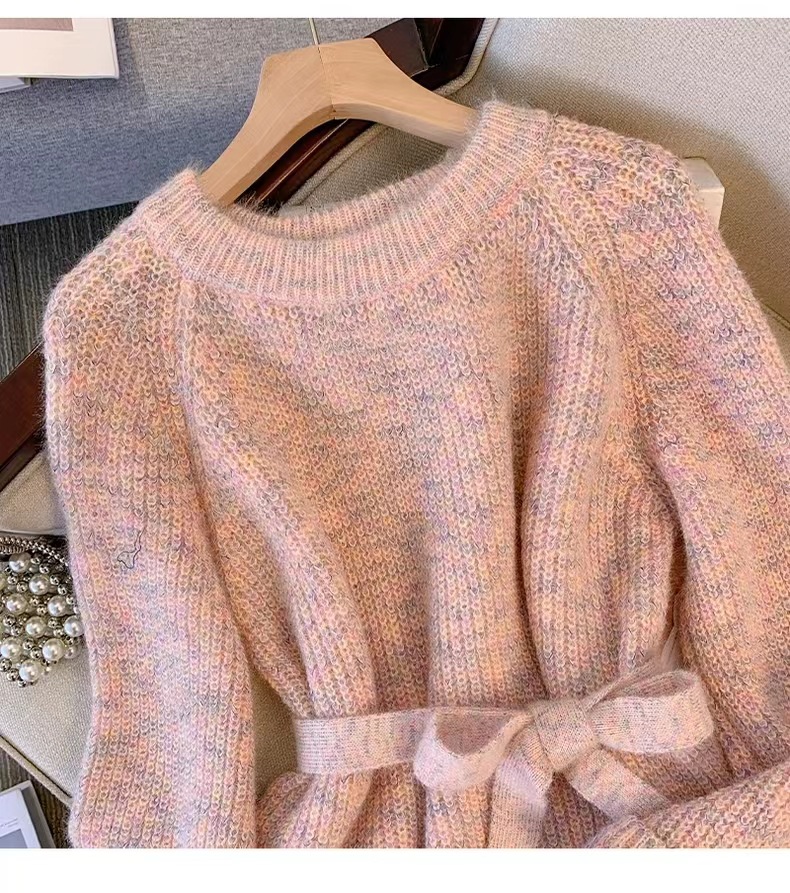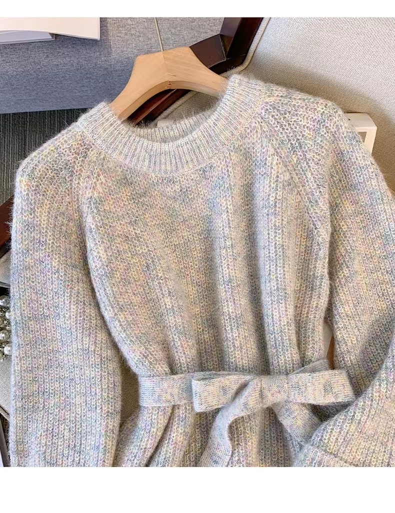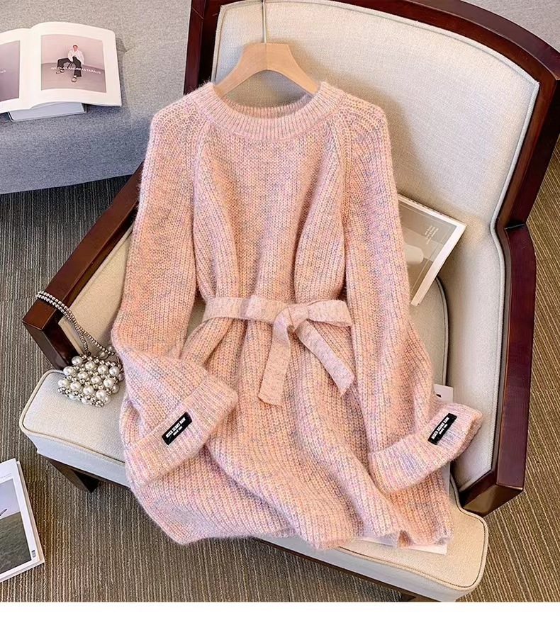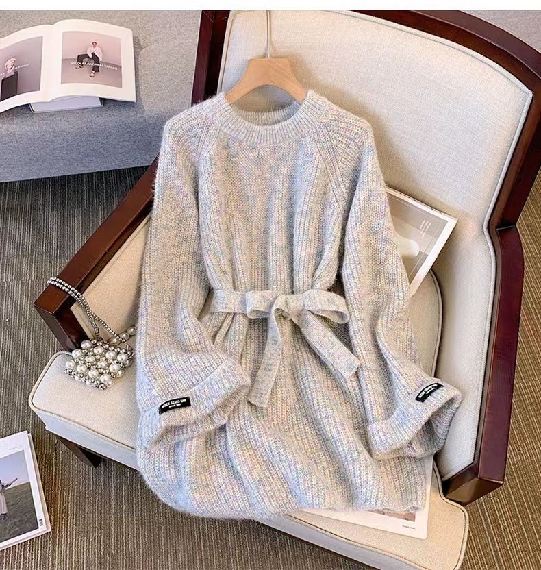 한국식 플러스 사이즈 라운드 넥 니트 스웨터 가을 의류 여성의 게으른 스타일 슬리밍 중간 길이 슬림 핏 풀오버 스웨터