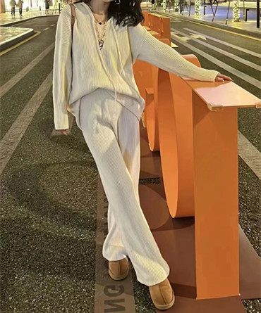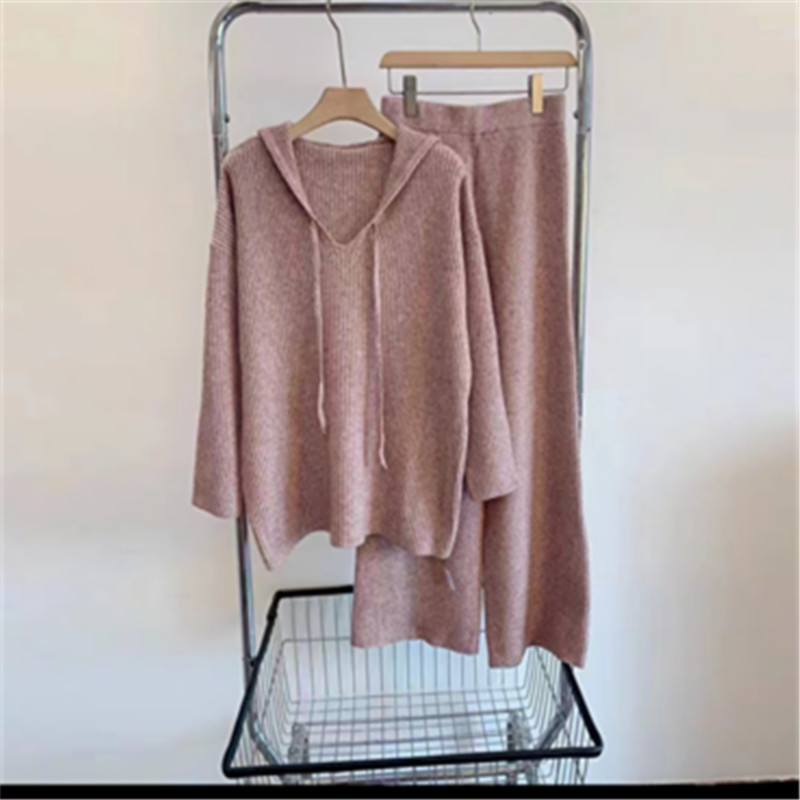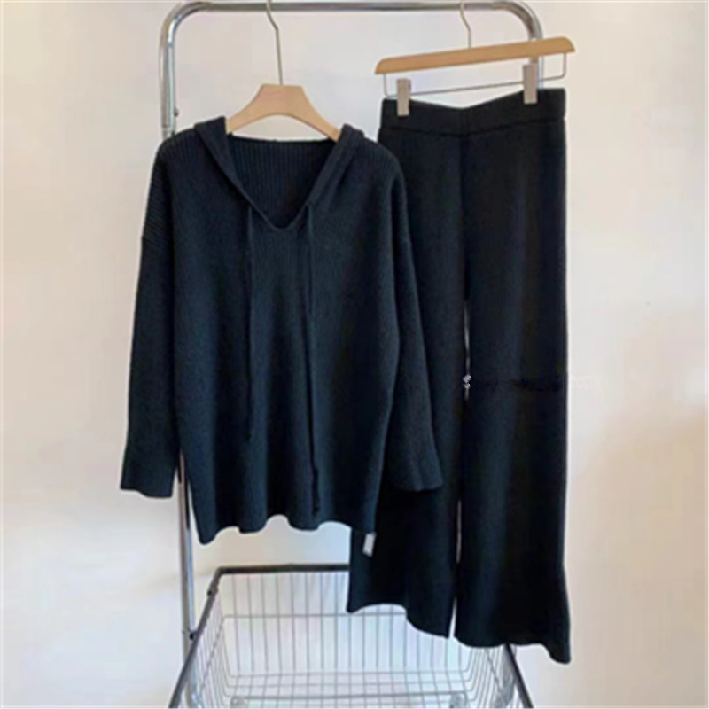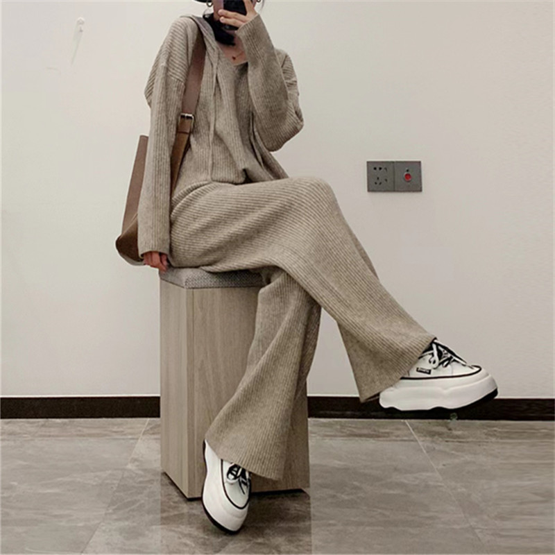 패션 니트 세트 여성의 유럽 2023 가을/겨울 새로운 후드 느슨한 캐주얼 스웨터 와이드 레그 팬츠 여성용 투피스 세트