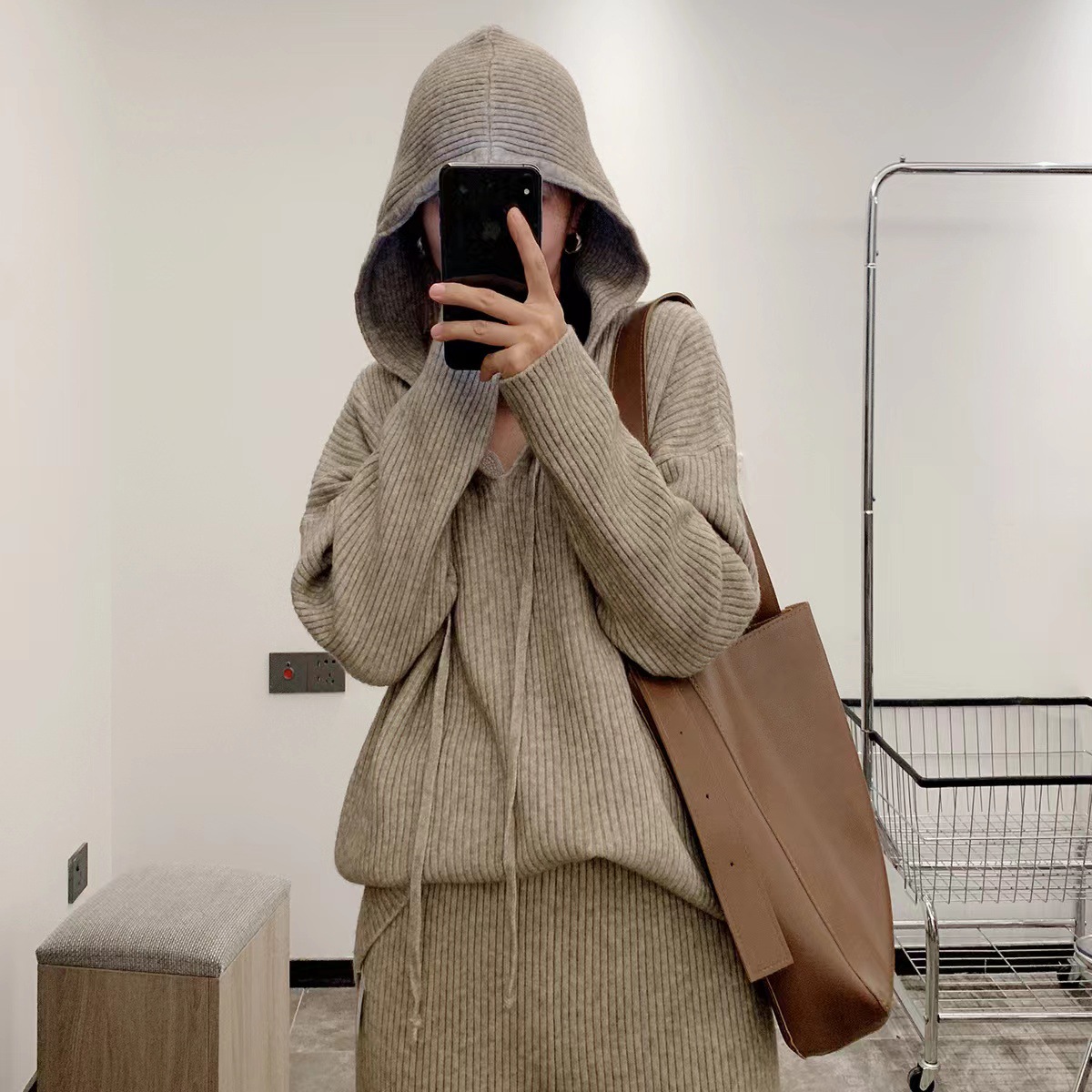 패션 니트 세트 여성의 유럽 2023 가을/겨울 새로운 후드 느슨한 캐주얼 스웨터 와이드 레그 팬츠 여성용 투피스 세트스토어 가기