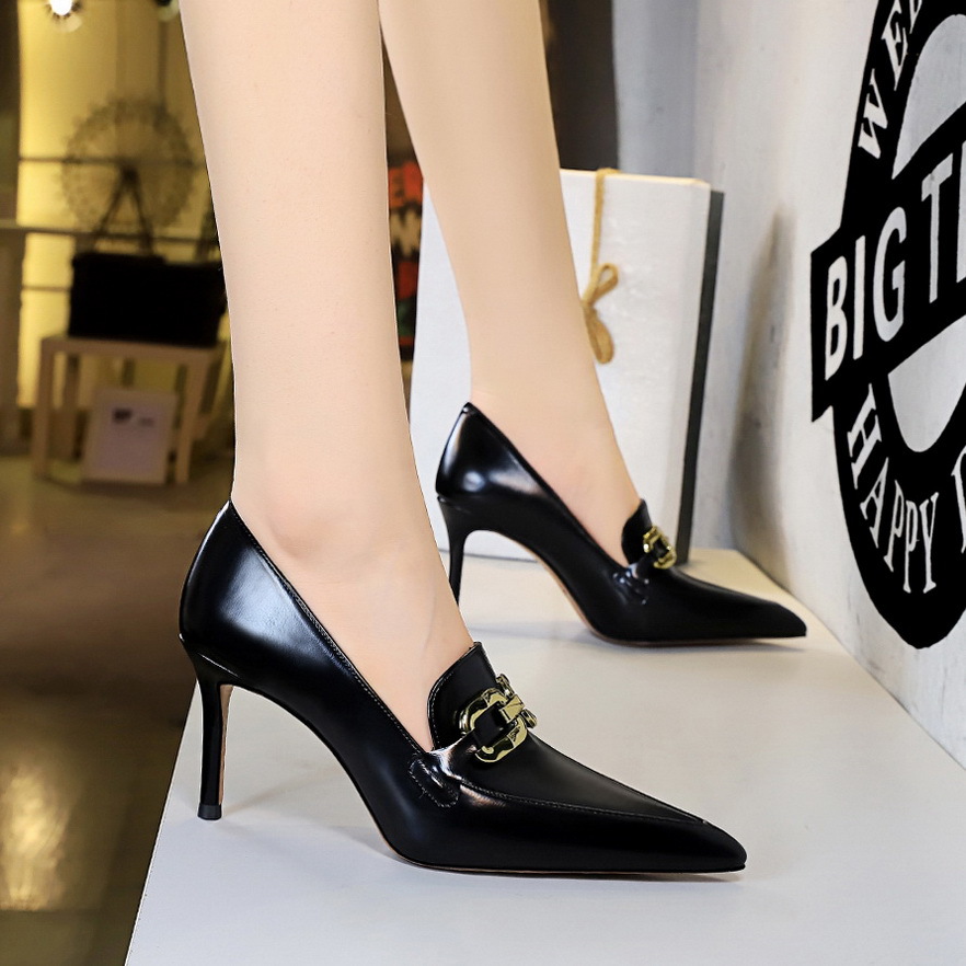 837-3 레트로 유럽과 미국 스타일 패션 깊은 입 신발 여성 신발 고급 굽 하이힐 뾰족한 금속 벨트 버클 깊은 입 싱글 신발스토어 가기