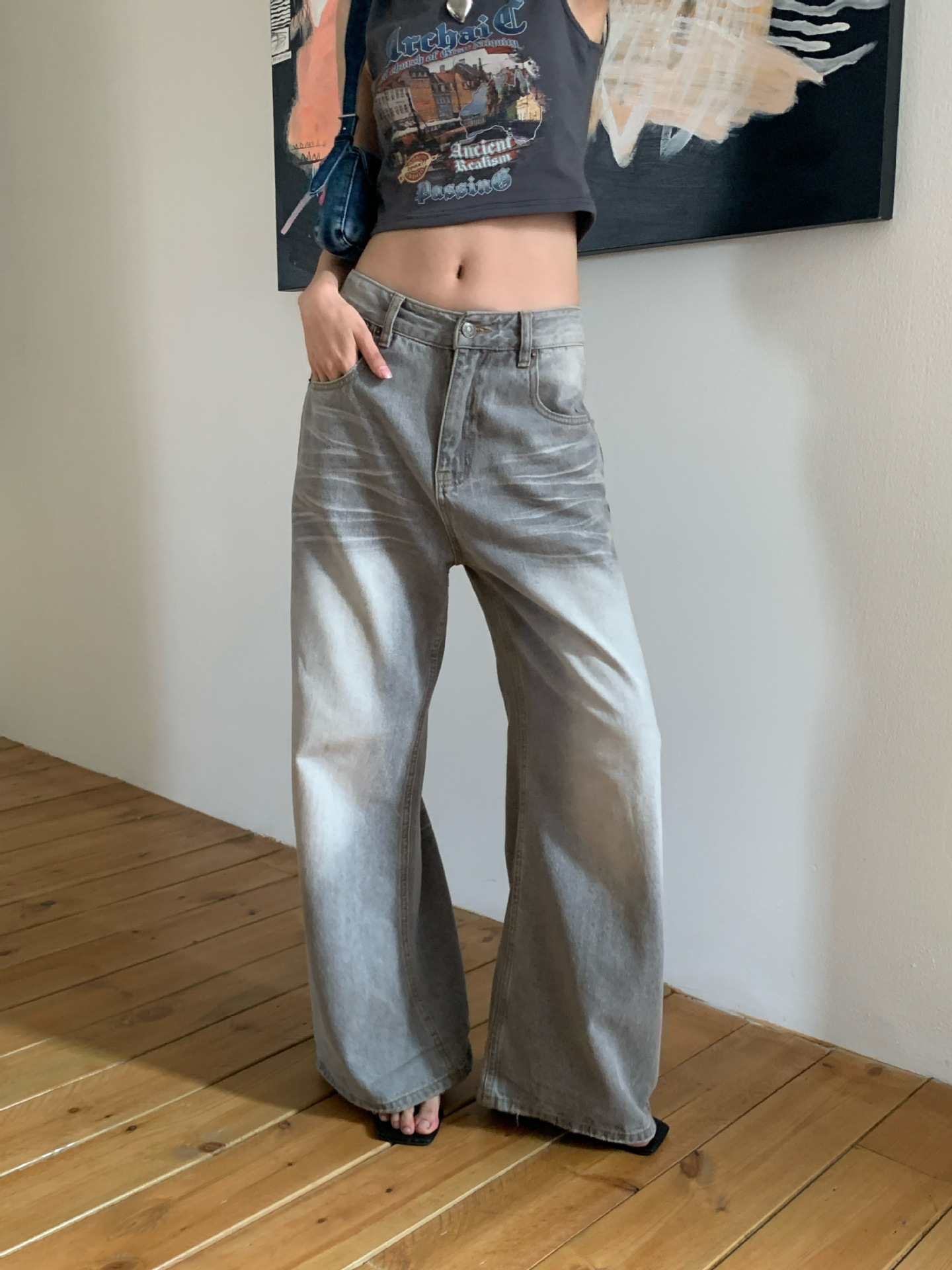 MMFISH 레트로 유행 캐주얼 세척 물 오래 된 느슨한 복용량 스트레이트 슬림 룩 고양이 수염 데님 넓은 다리 바지 K787
