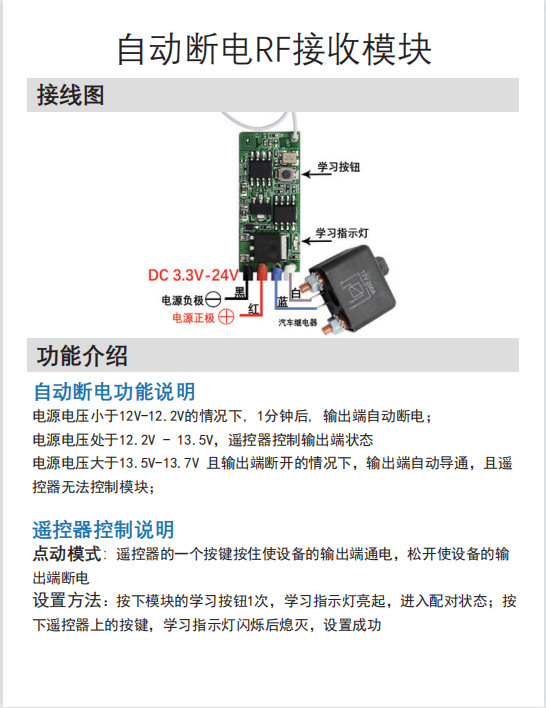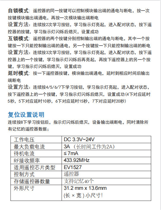 6)设为延时15秒:按接收模块对码键6次(约2秒)这时蓝灯亮起8秒内按遥控器任意按键一下即对码成功.