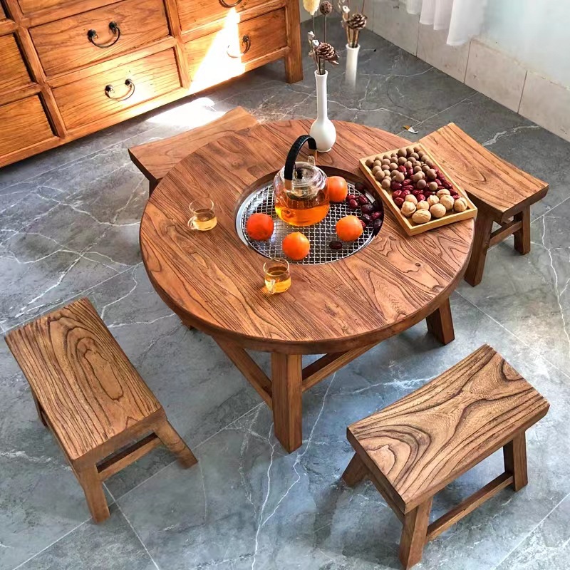 오래된 느릅 나무 스토브 티 테이블 바베큐 탄소 전기 이중 사용 티 테이블 발코니 야외 바베큐 작은 라운드 테이블 홈 차 요리스토어 가기