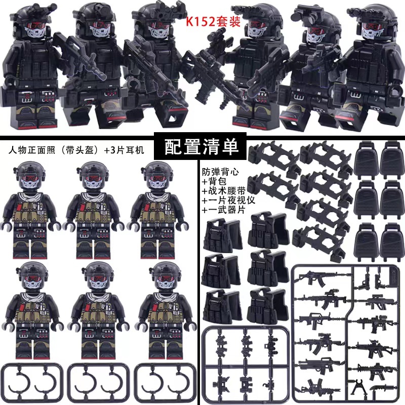 • K108 고스트 특수부대 미니피겨 6개 + 장비가 가방에 들어있습니다.