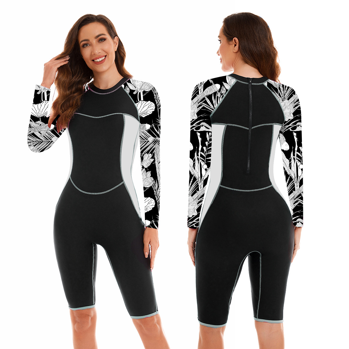 유럽과 미국 스포츠 대외 무역 원피스 세트 긴팔 서핑 세트 여성용 수영복 플랫 앵글 다이빙 세트 수영복 Oni Flower 28007