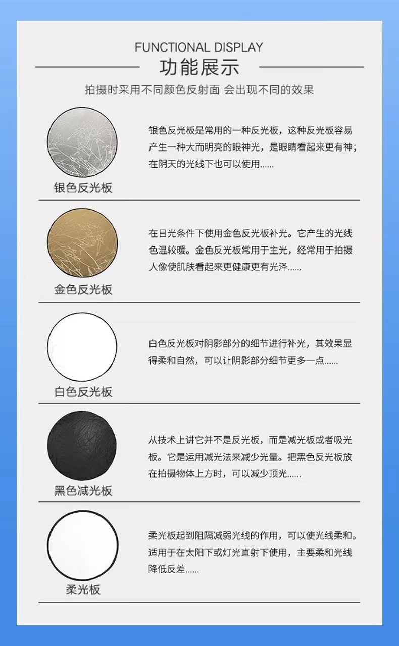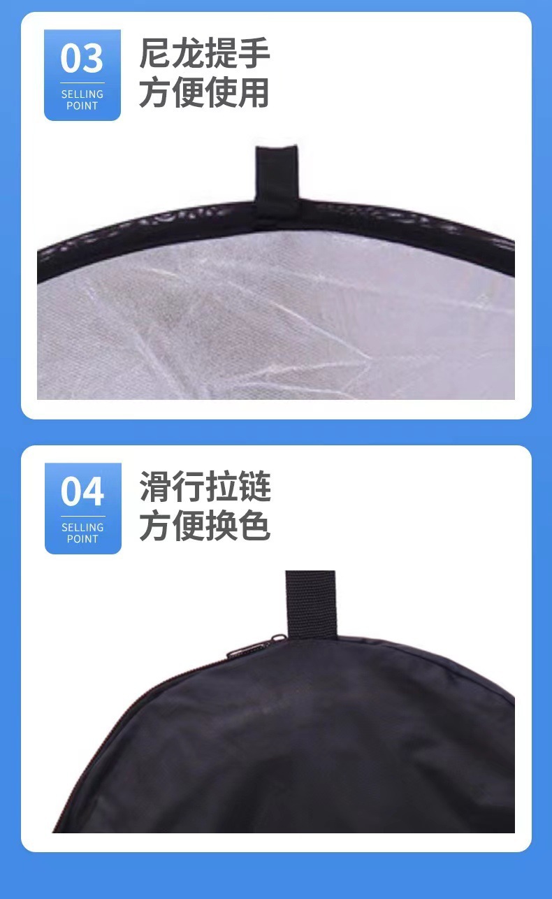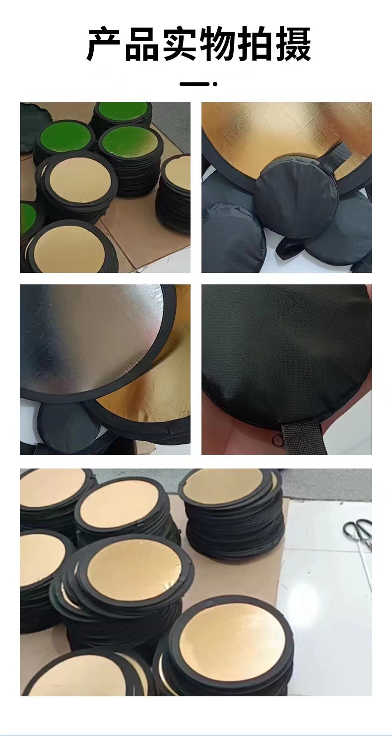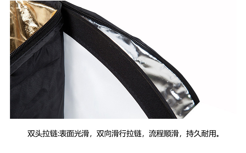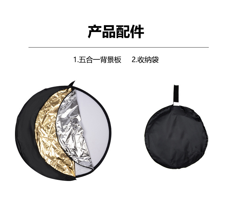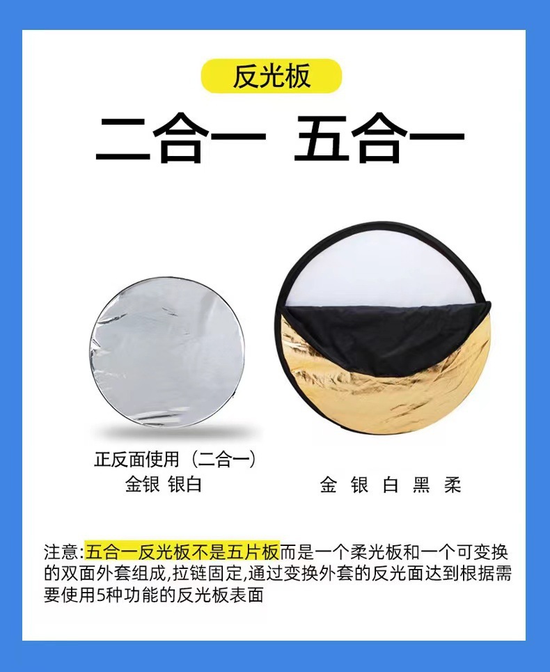注意:五合一反光板不是五片板,而是一个柔光板和一个可变换的双面外套组成,拉链固定,通过变换外套的反光面达到根据需要使用5种功能的反光板表面。