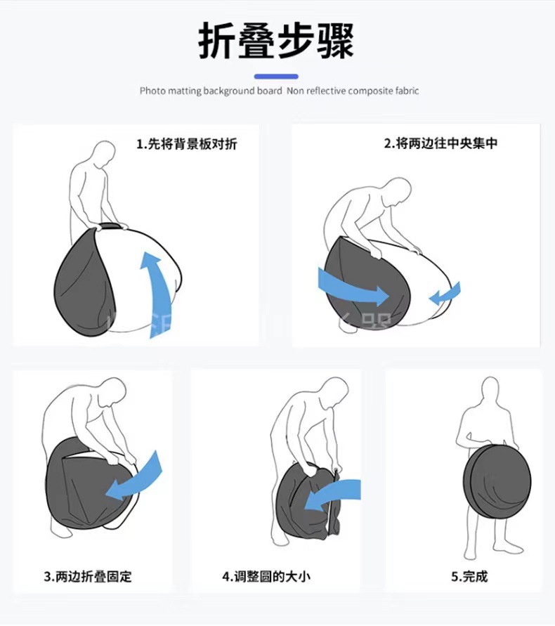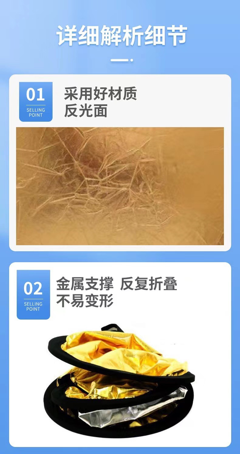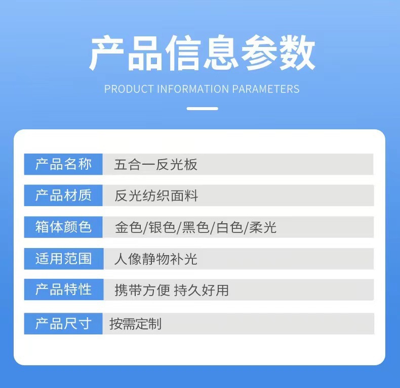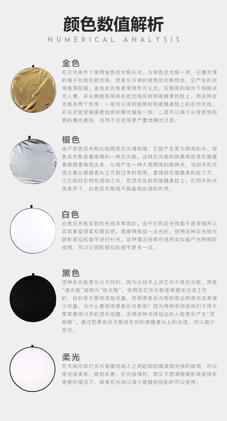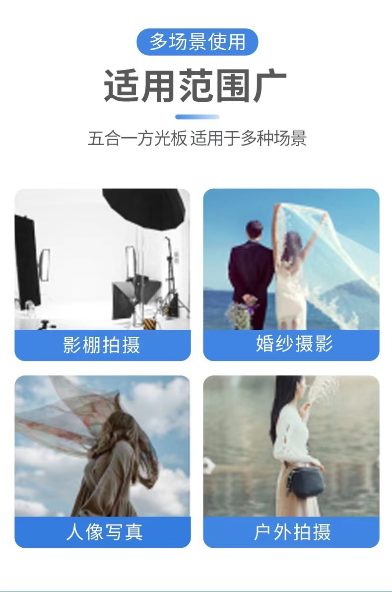 注意:五合一反光板不是五片板,而是一个柔光板和一个可变换的双面外套组成,拉链固定,通过变换外套的反光面达到根据需要使用5种功能的反光板表面。