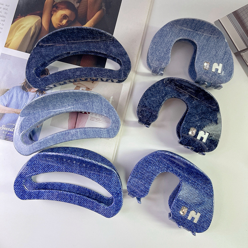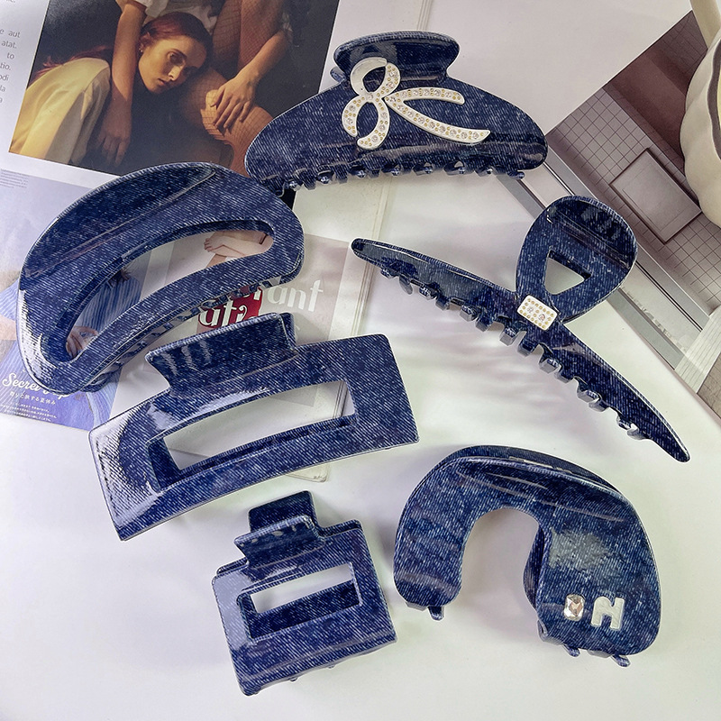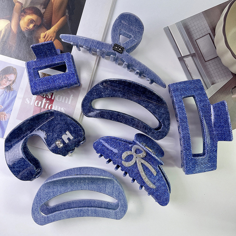새로운 Y2K 밀레니엄 스타일 데님 클립 독특한 블루 아세트산 머리핀 우아한 라인 석 상어 클립 여성용 헤어 액세서리스토어 가기