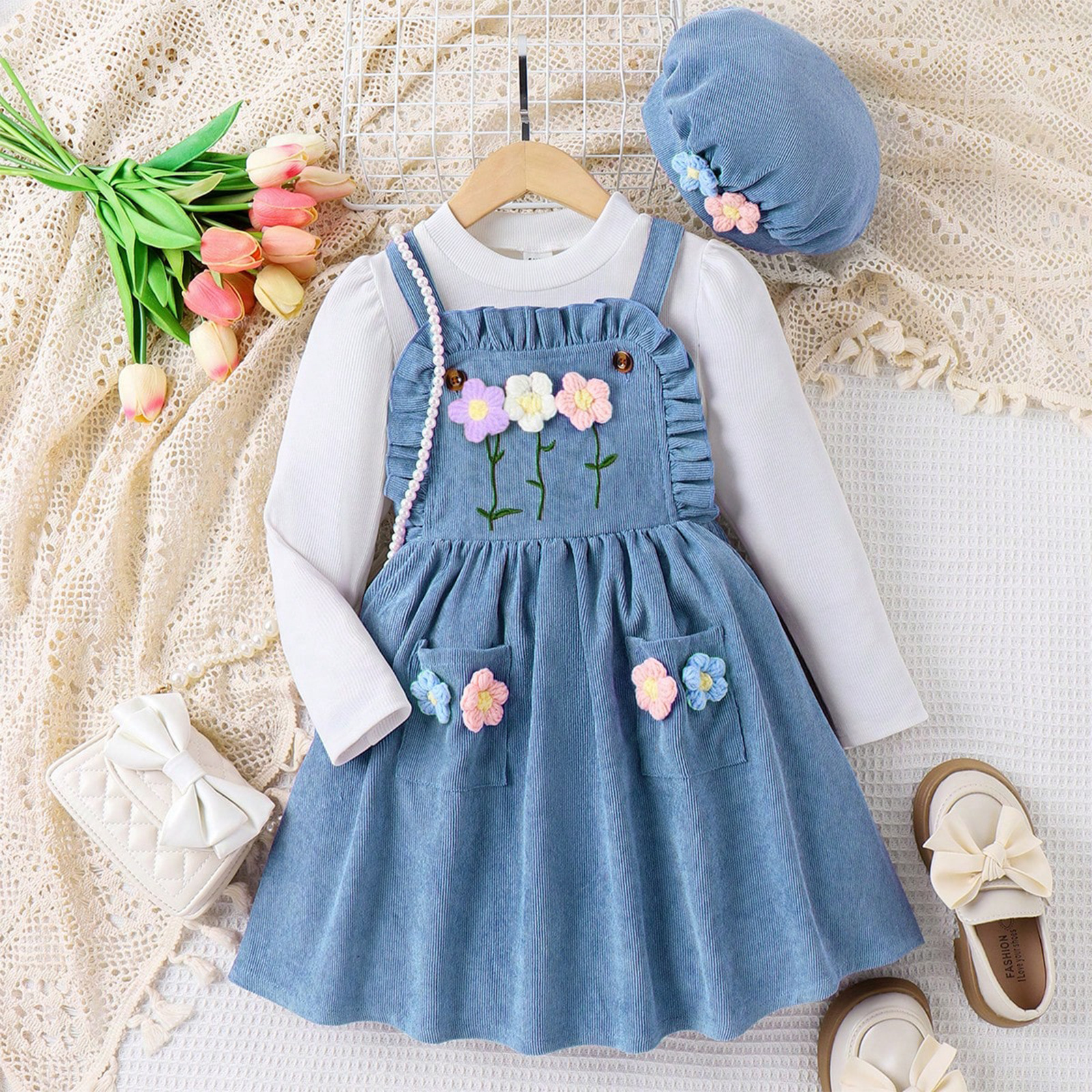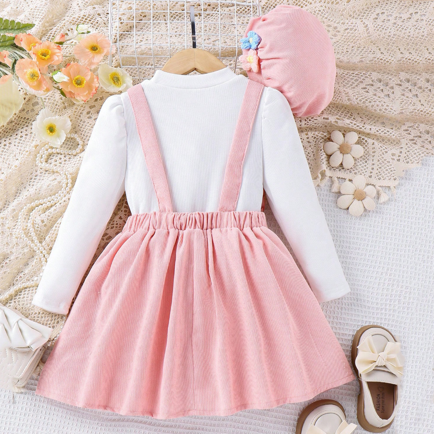 Baopai 아동복 크로스 보더 달콤한 소녀 가을과 겨울 새로운 풀오버 긴 소매 귀여운 꽃 멜빵 치마 모자 세트스토어 가기
