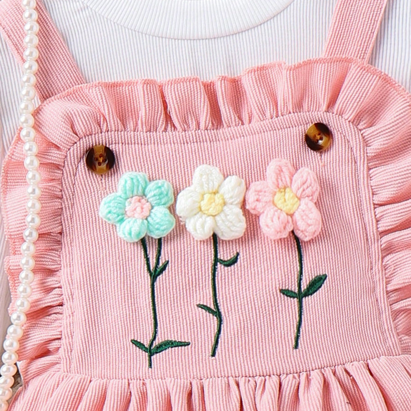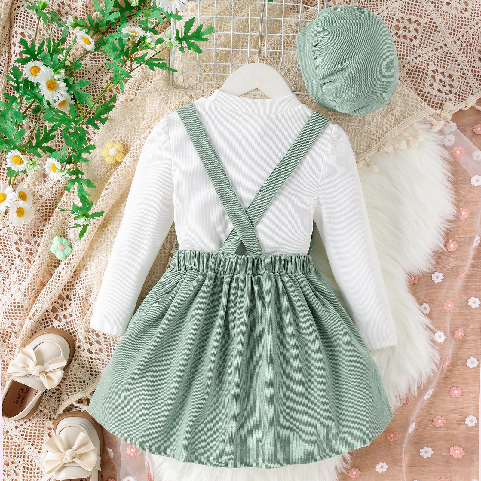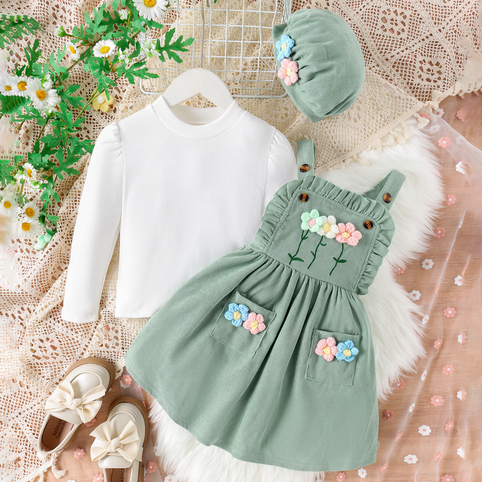 Baopai 아동복 크로스 보더 달콤한 소녀 가을과 겨울 새로운 풀오버 긴 소매 귀여운 꽃 멜빵 치마 모자 세트