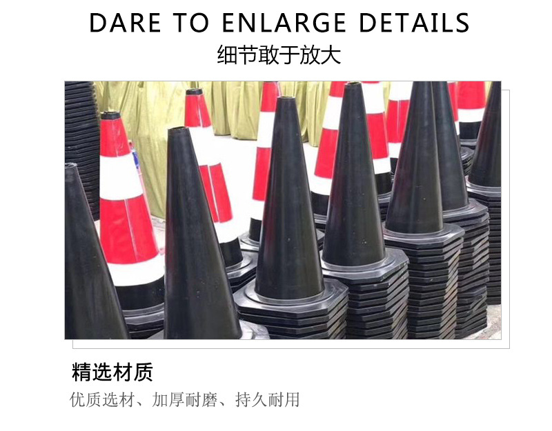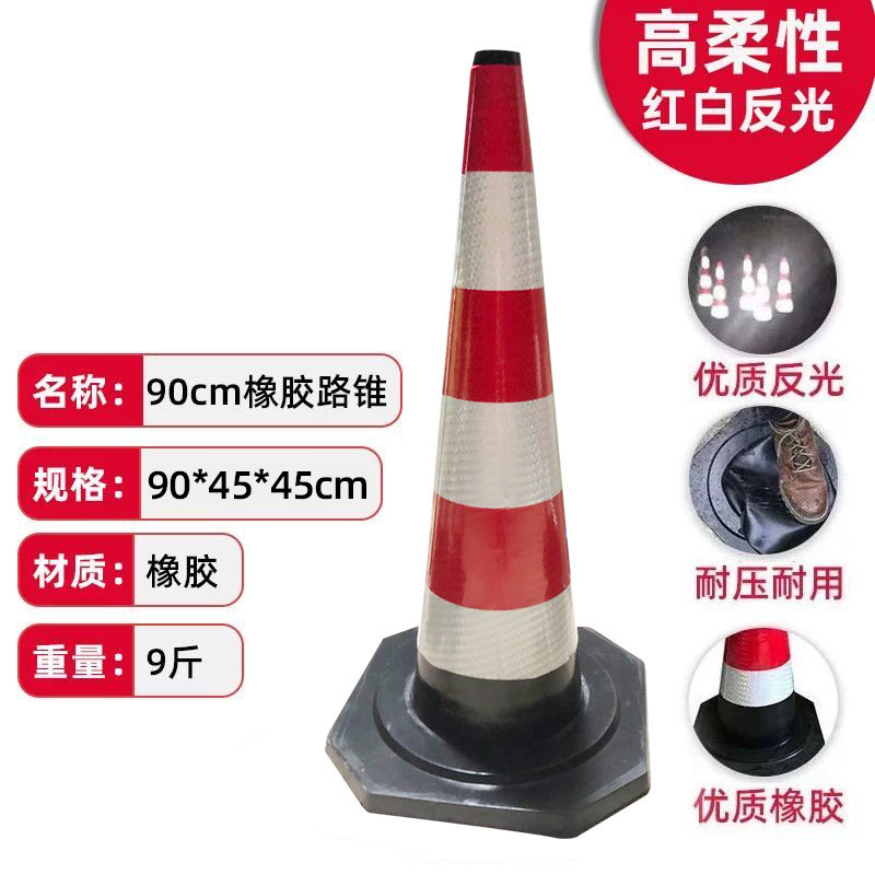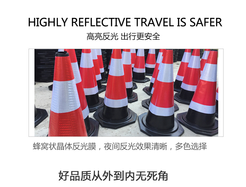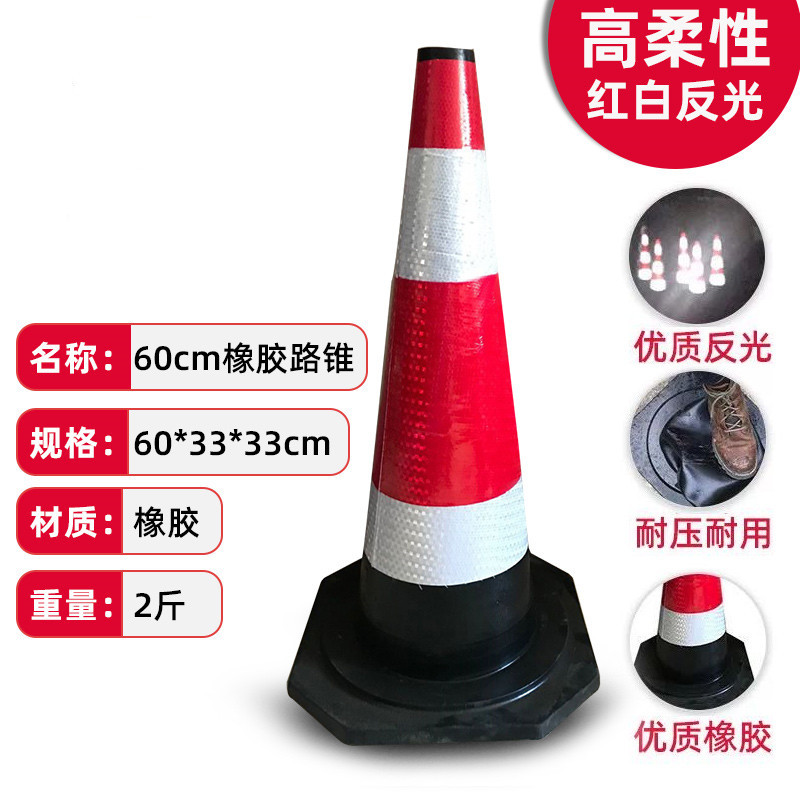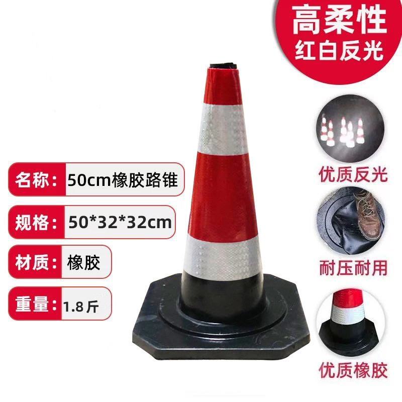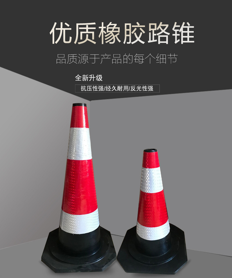 产品特点:橡胶路锥采用橡胶经蒸汽高温硫化整体模压而成,集橡胶的韧性于一身,具有耐老化、耐压、耐摔、轻便耐用。再配以高反光材料,反光效果好,适于城市路口车道,人行道,建筑物之间的隔离警示。