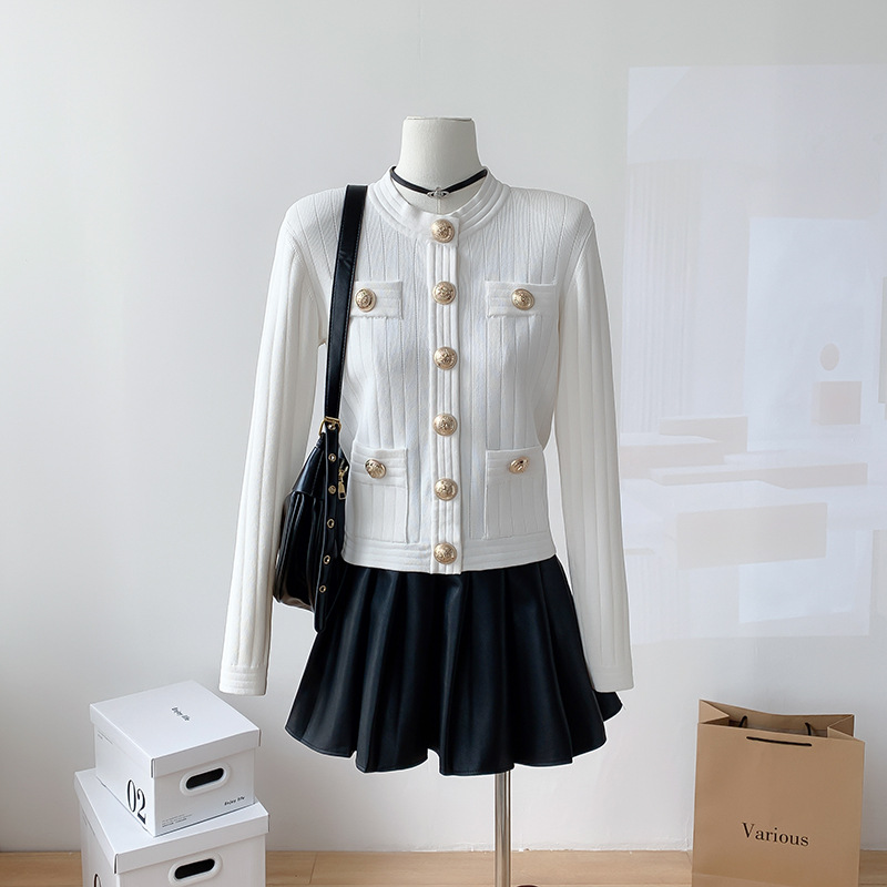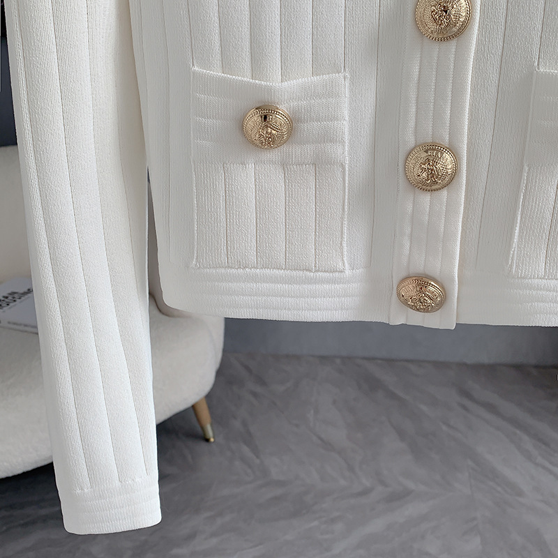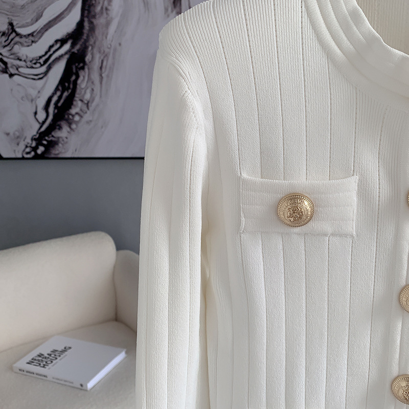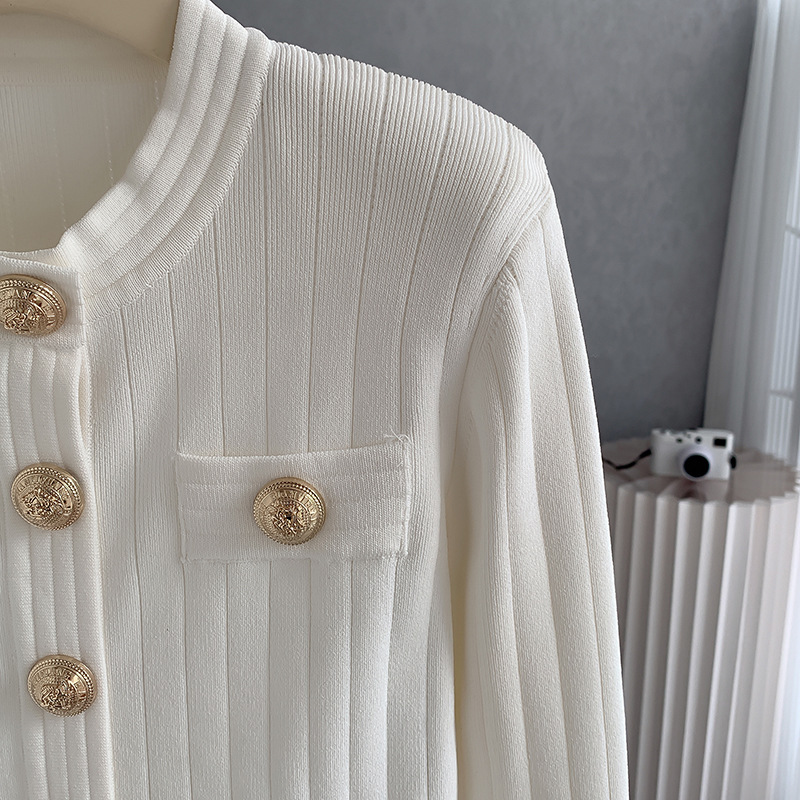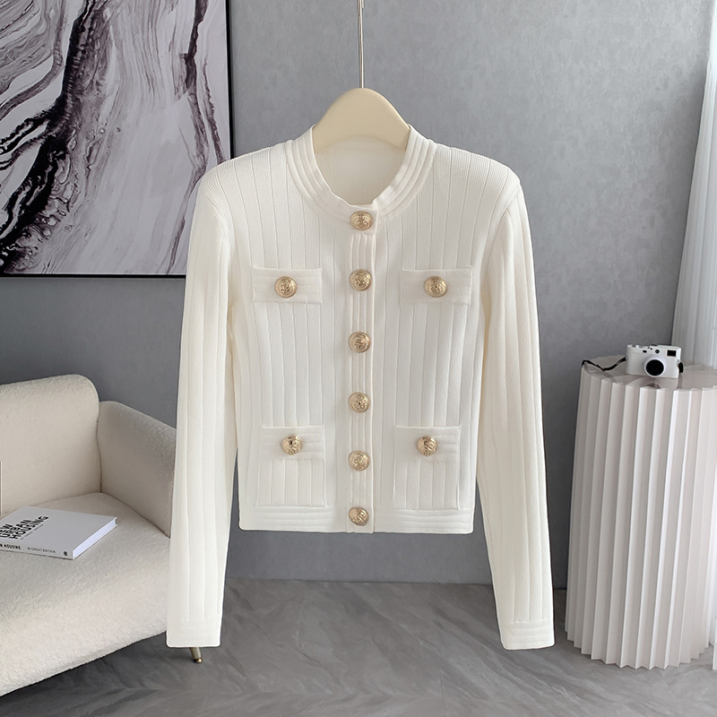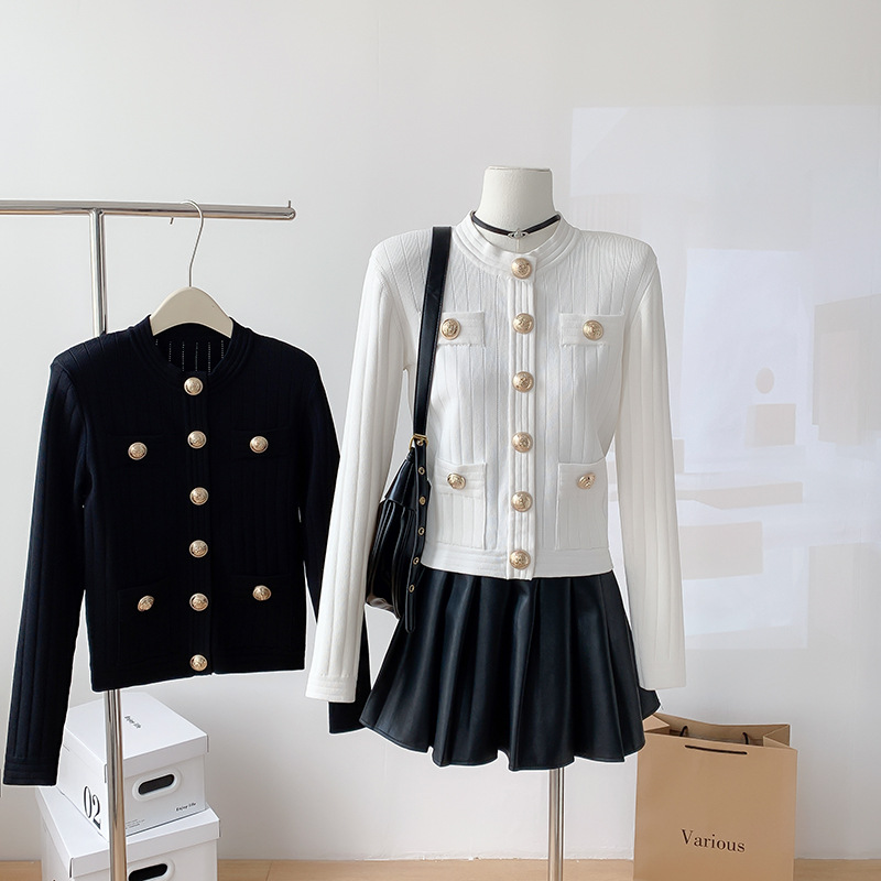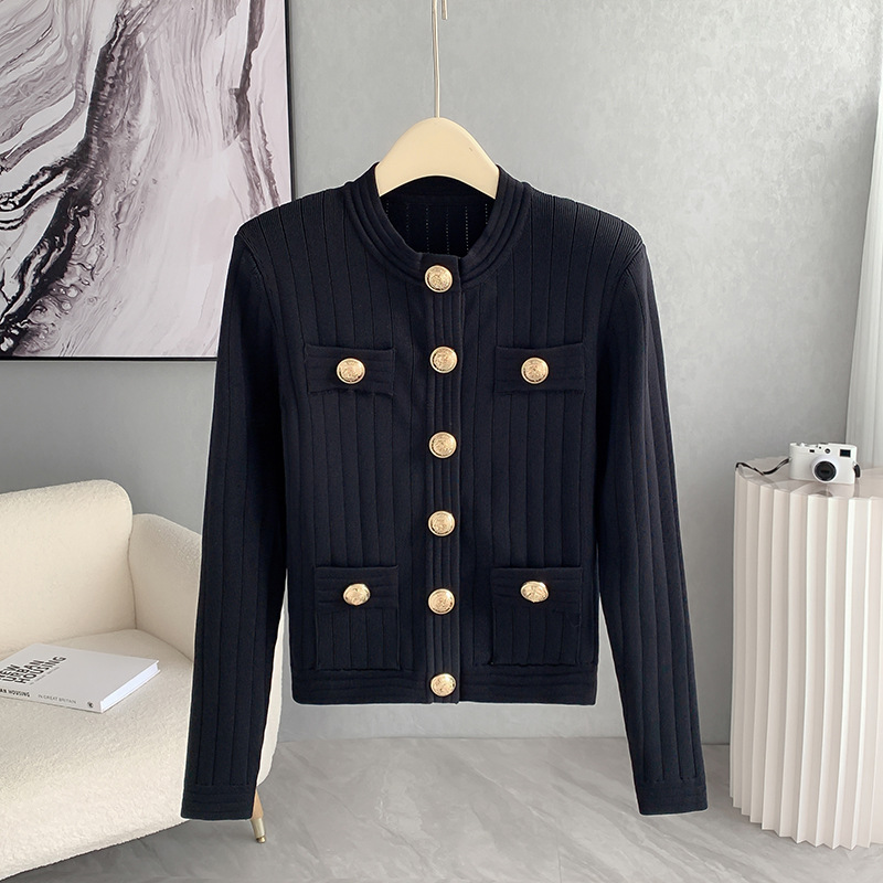 바자26 가을 겨울 신상품 작은 향수풍 메탈 버클 니트 가디건, 명사 스타일의 더블 포켓 디자인 여성용 상의