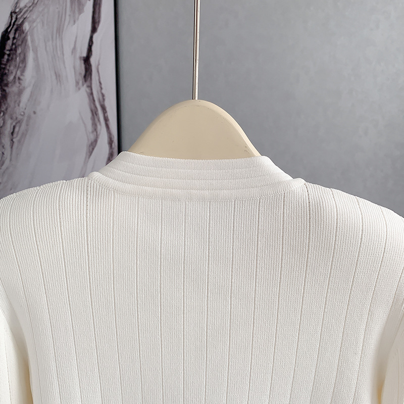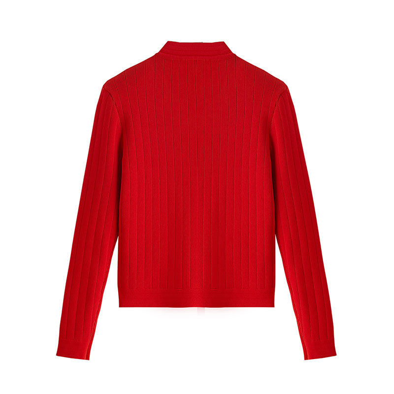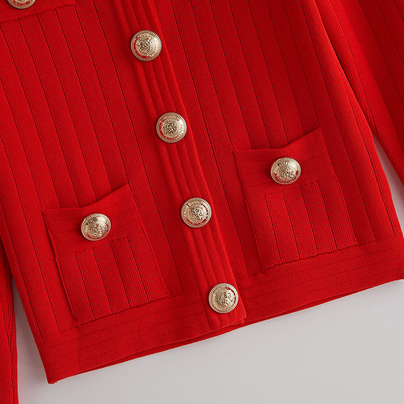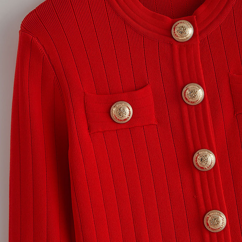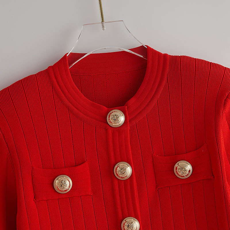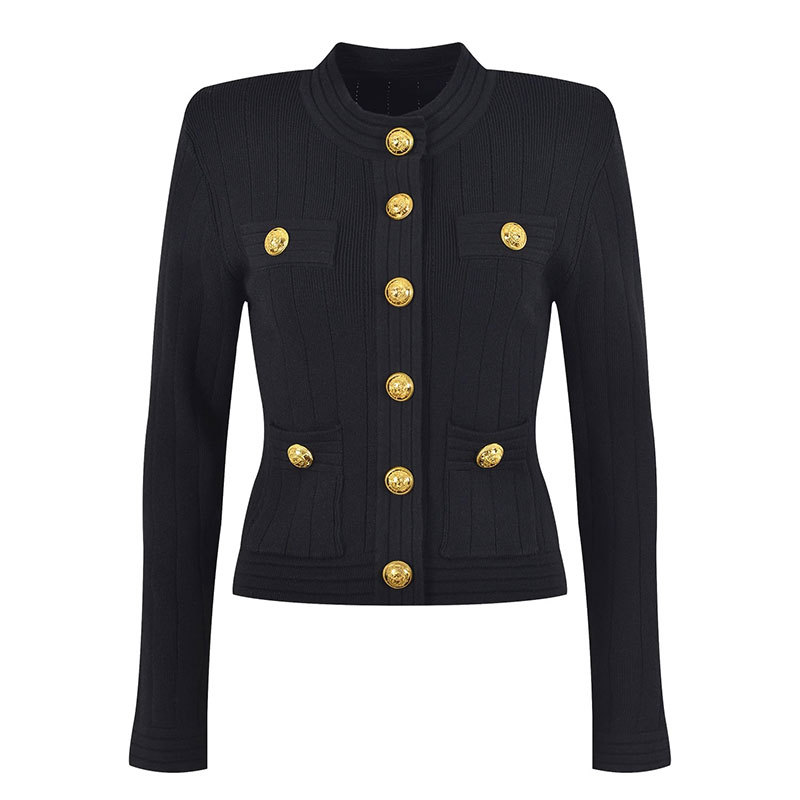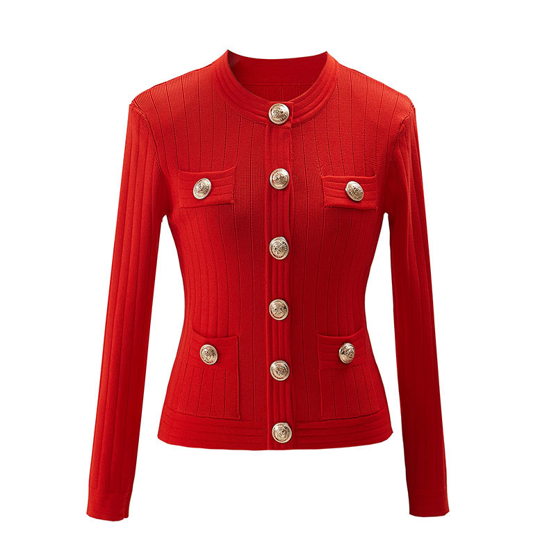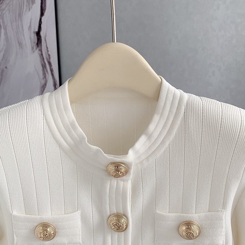바자26 가을 겨울 신상품 작은 향수풍 메탈 버클 니트 가디건, 명사 스타일의 더블 포켓 디자인 여성용 상의