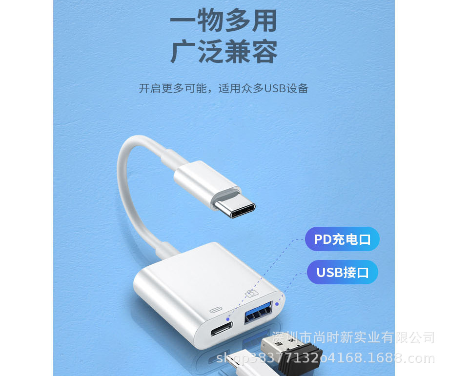 애플 휴대 전화 컴퓨터에 적합 USB + TYPE-C 충전 PD OTG 변환 라인 투인원 다기능