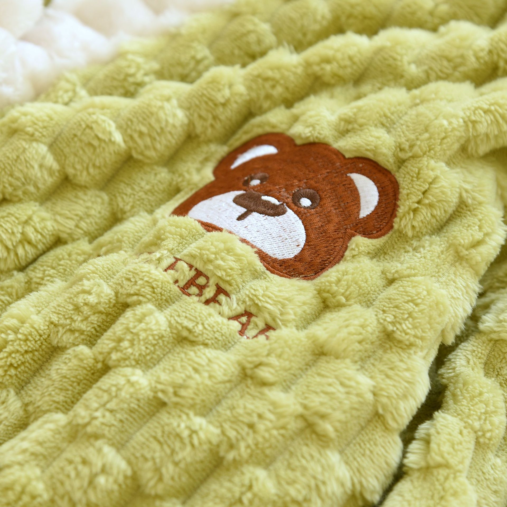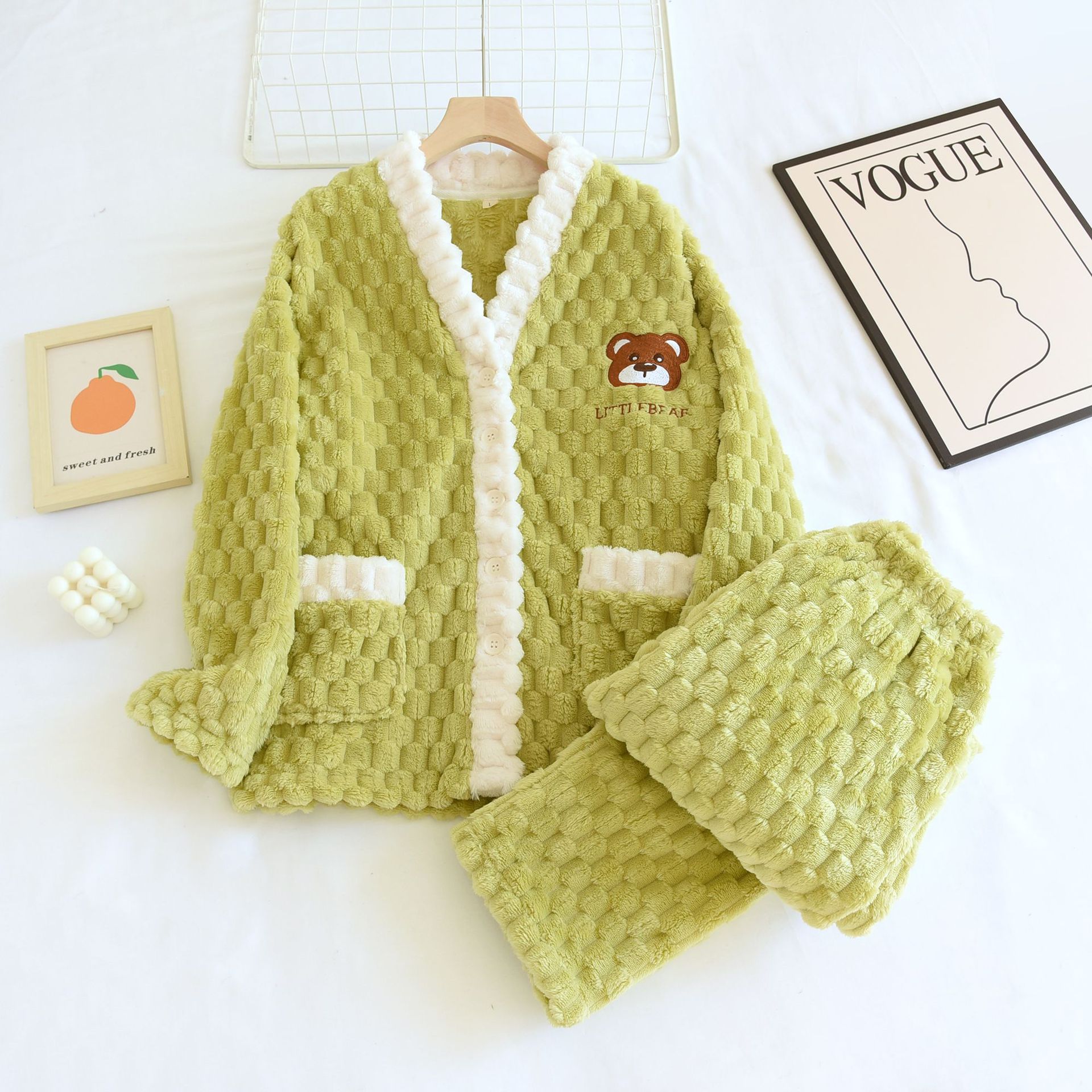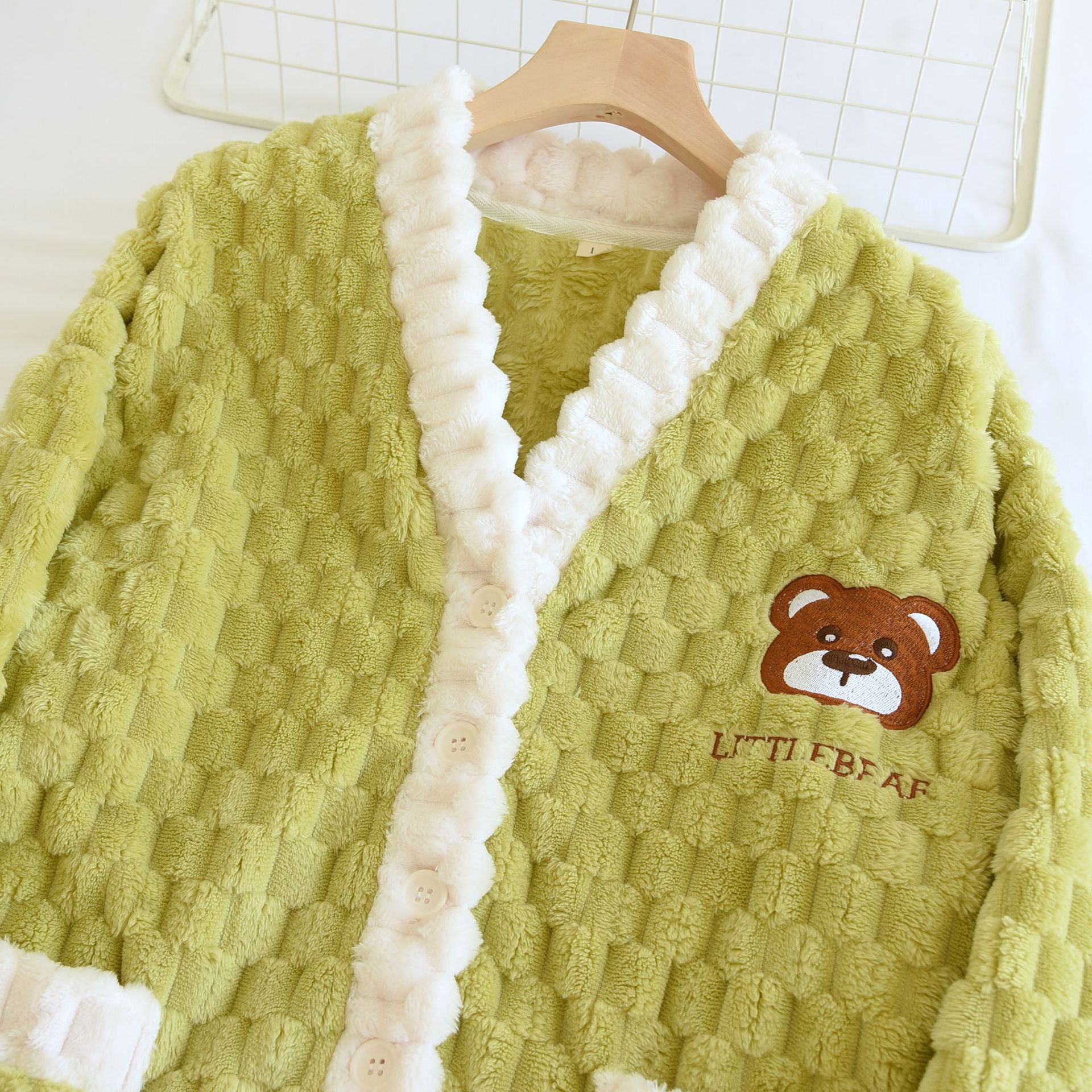 • LYZ V-넥 자수 곰 플란넬 여성 그린