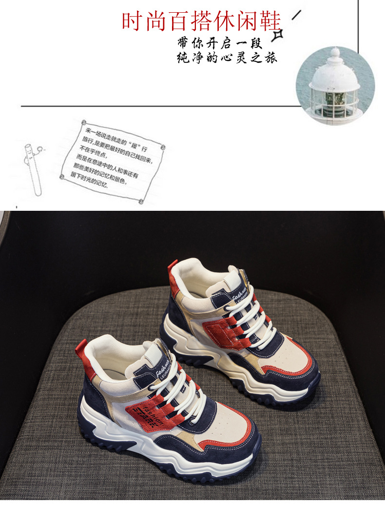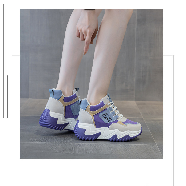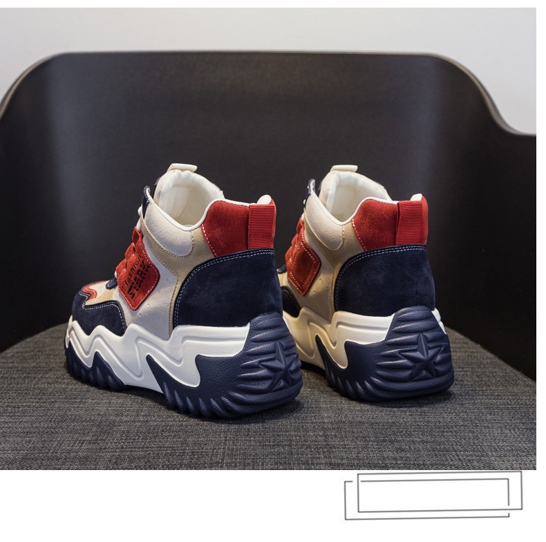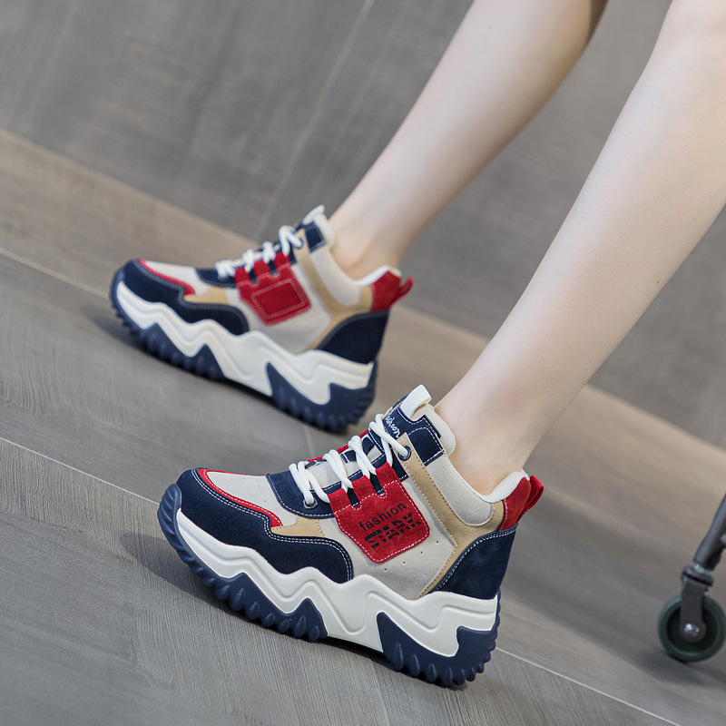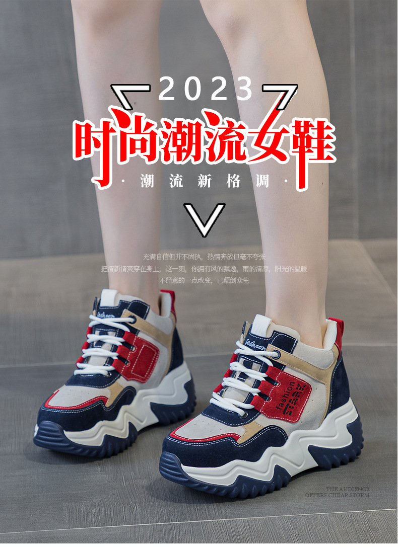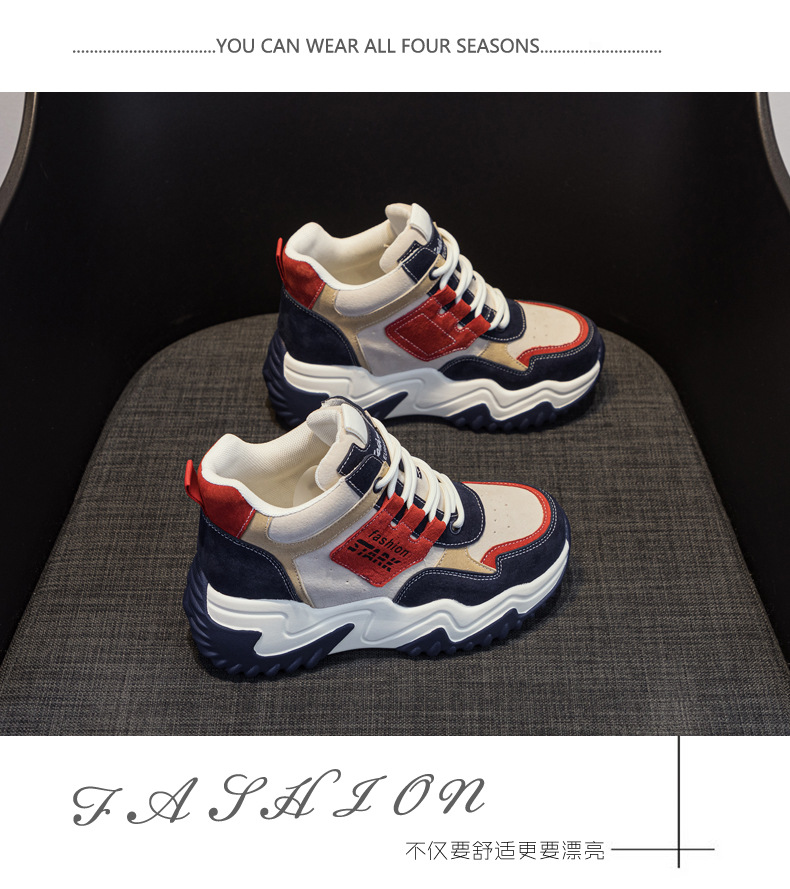 2023 가을 신상 키높이 한국 스타일 아빠 신발 두꺼운 밑창 배색 캐주얼 하이탑 슈즈 웨지힐 패션 여성화스토어 가기