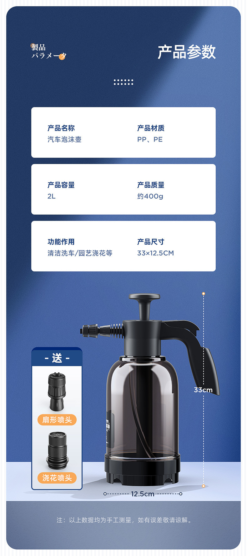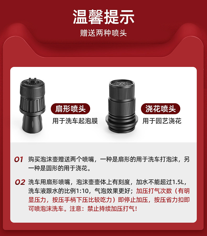 注:泡沫壶壶体有刻度线,加水不能超1.5L,洗车液和水比列1:50,气泡效果更佳。