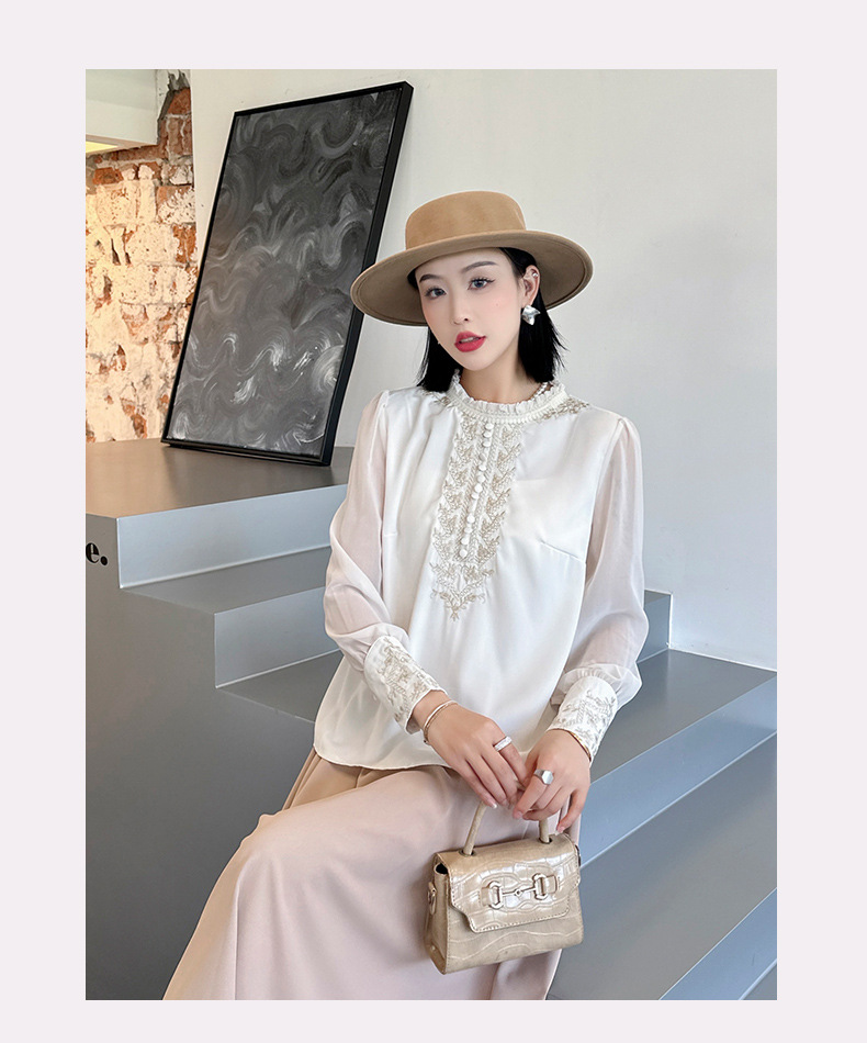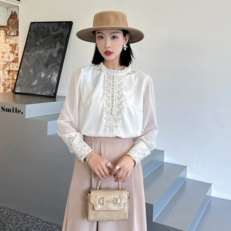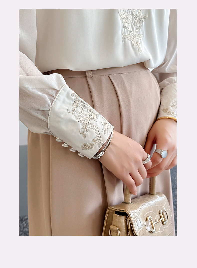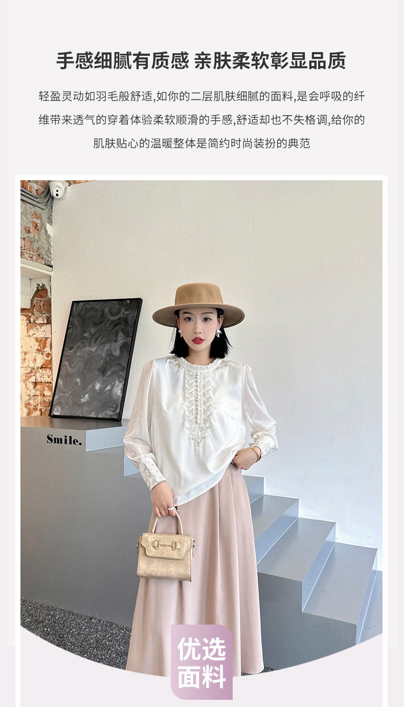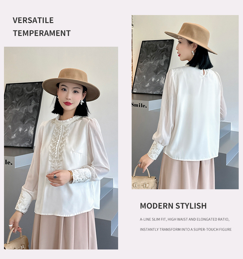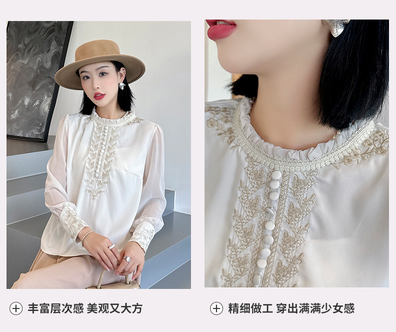리얼 샷 자수 셔츠 여자의 가을 2023 새로운 나무 귀 풀오버 모조 뽕나무 실크 긴 소매 탑