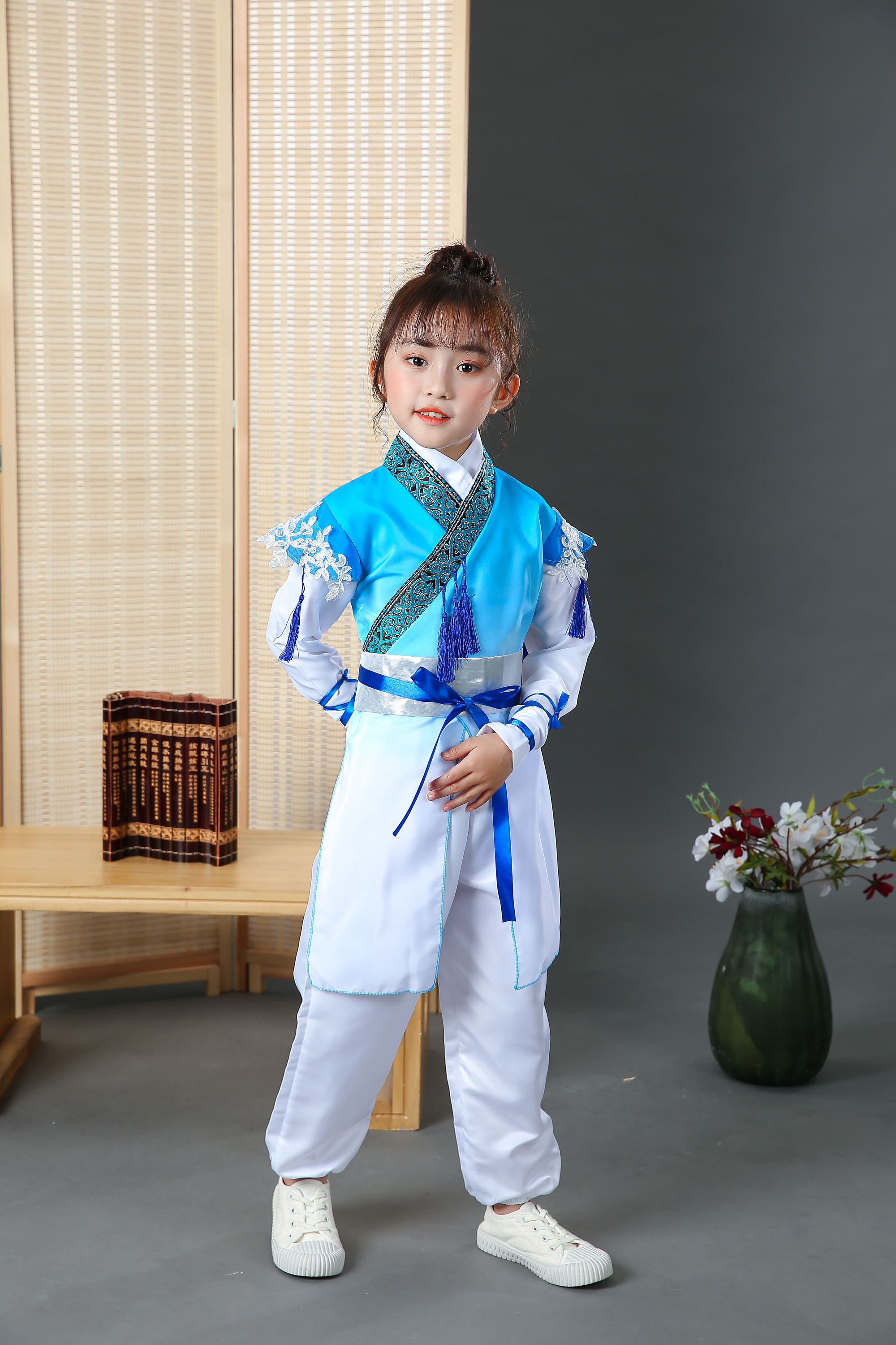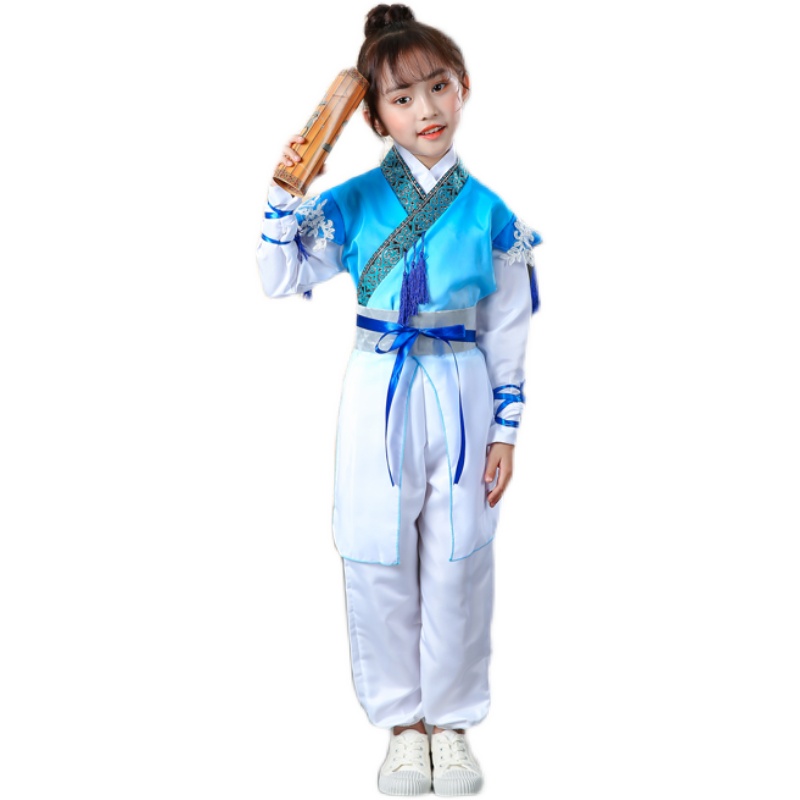 중국 효도 고대 의상 한푸 어린이 제자 규칙 블루 중립 새 책 어린이 춤 세트 3 자 세트 Guoxue 세트
