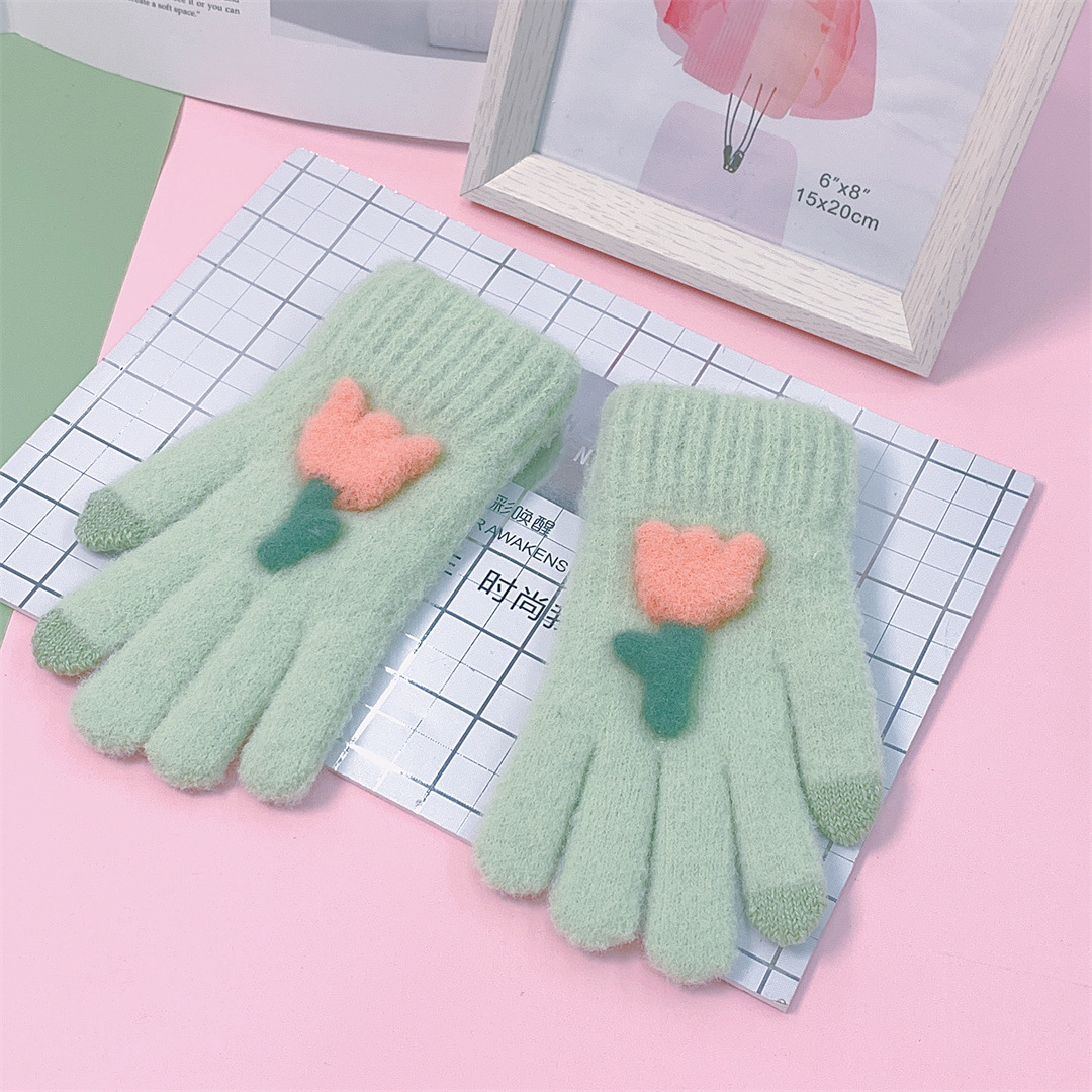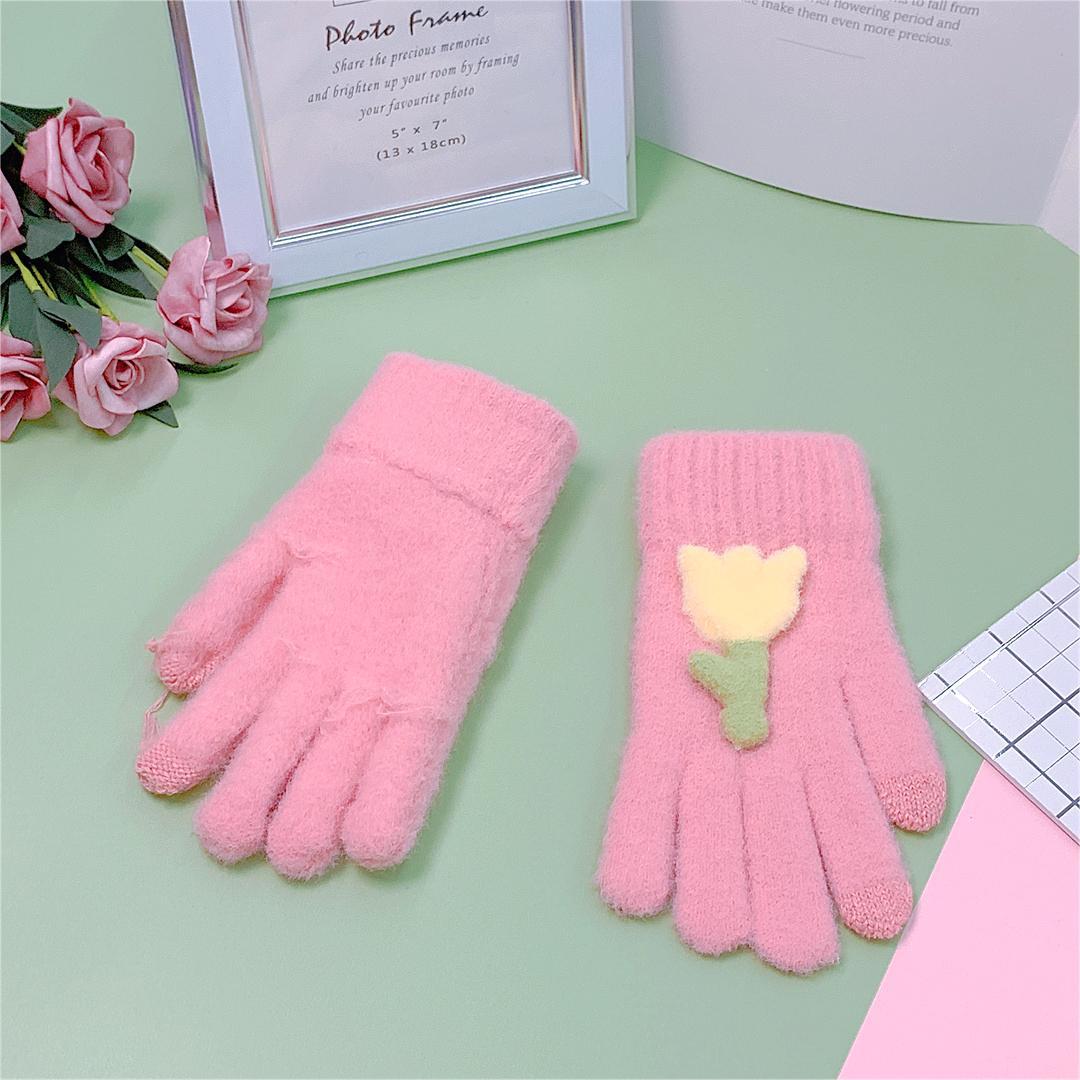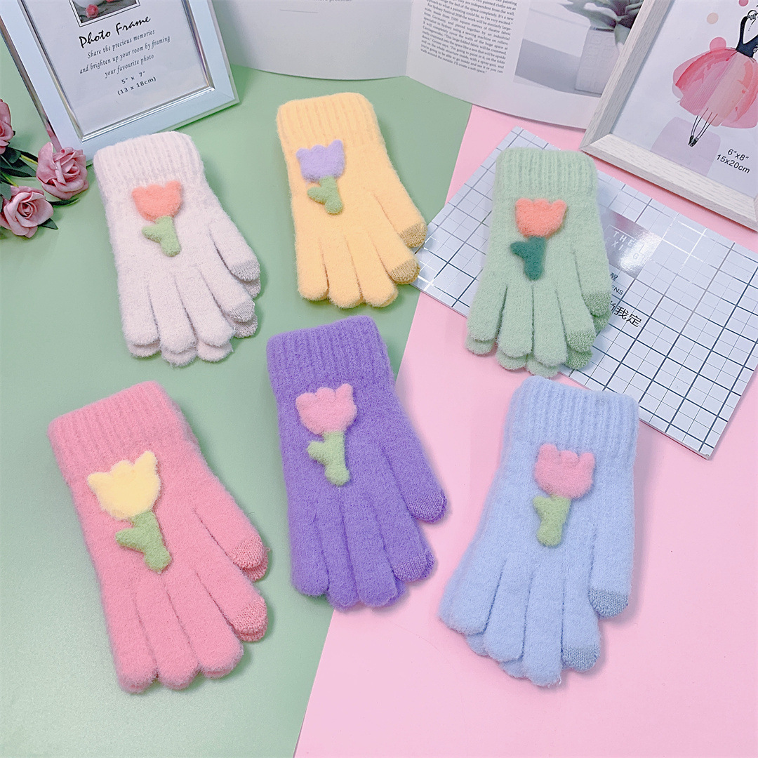 가을과 겨울 새로운 여성 성인 기모 작은 신선한 터치 스크린 튤립 다섯 손가락 장갑 도매 야외 따뜻한