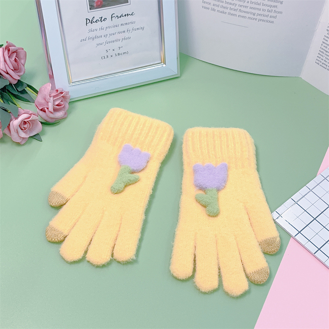 가을과 겨울 새로운 여성 성인 기모 작은 신선한 터치 스크린 튤립 다섯 손가락 장갑 도매 야외 따뜻한스토어 가기