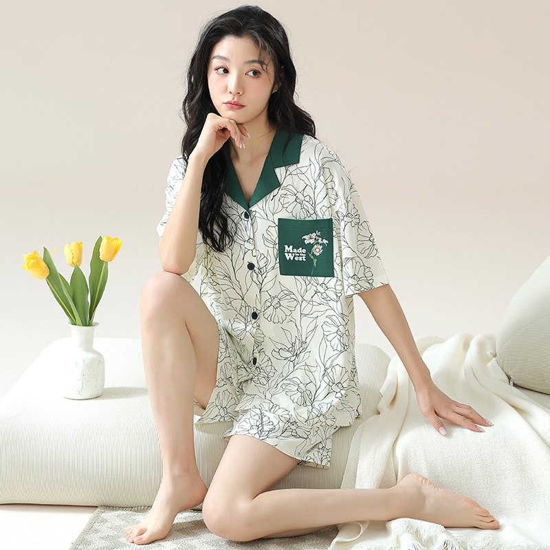 모달 쿨 옷깃 카디건 파자마 여성용 봄과 여름 짧은 소매 반바지 세트 입을 수 플러스 사이즈 느슨한 캐주얼