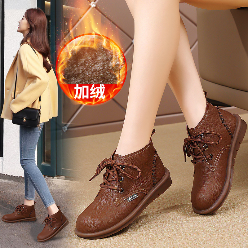 첫 번째 레이어 소가죽 레이스 업 소프트 하단 싱글 부츠 2023 가을과 겨울 새로운 빈티지 수제 플랫 바닥 짧은 부츠 편안한 부드러운 가죽 여성 신발스토어 가기