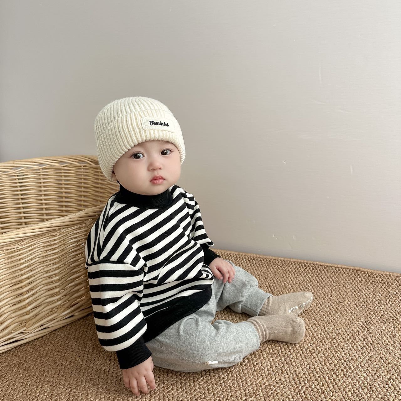 한국식 유아 스트라이프 기모 스웨터 남여공용 루즈핏 터틀넥 스웨터 베이비 탑