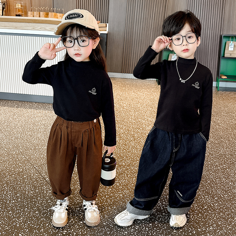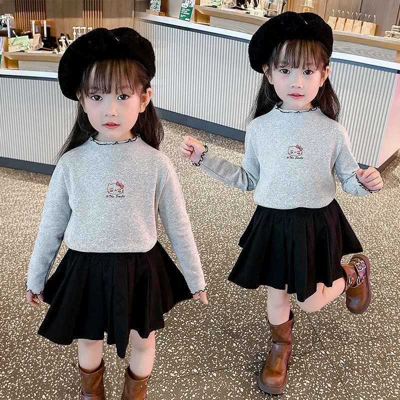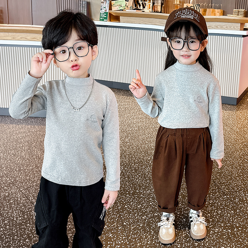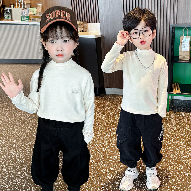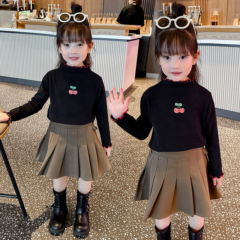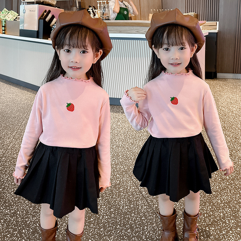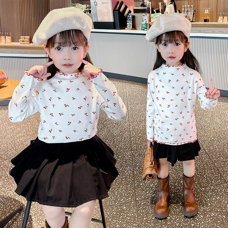 가을과 겨울 어린이 패션 세련된 하프 하이 칼라 인쇄베이스 셔츠 우드 이어 가장자리가있는 소녀의 긴팔 탑스토어 가기