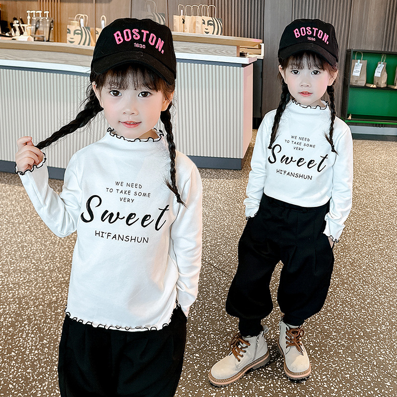 가을과 겨울 어린이 패션 세련된 하프 하이 칼라 인쇄베이스 셔츠 우드 이어 가장자리가있는 소녀의 긴팔 탑