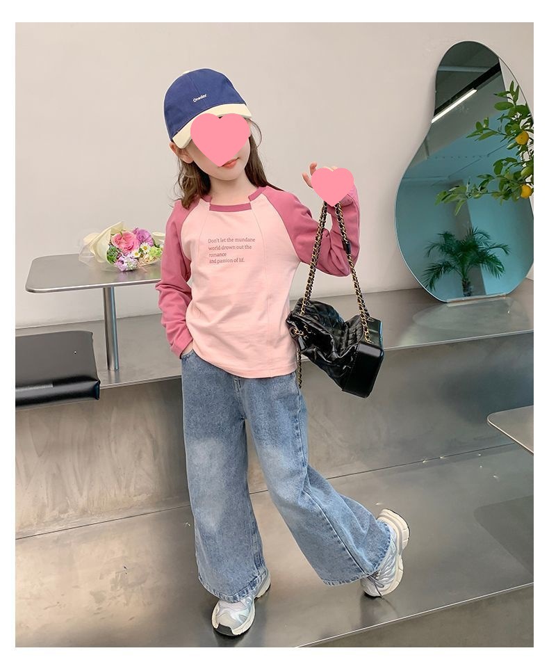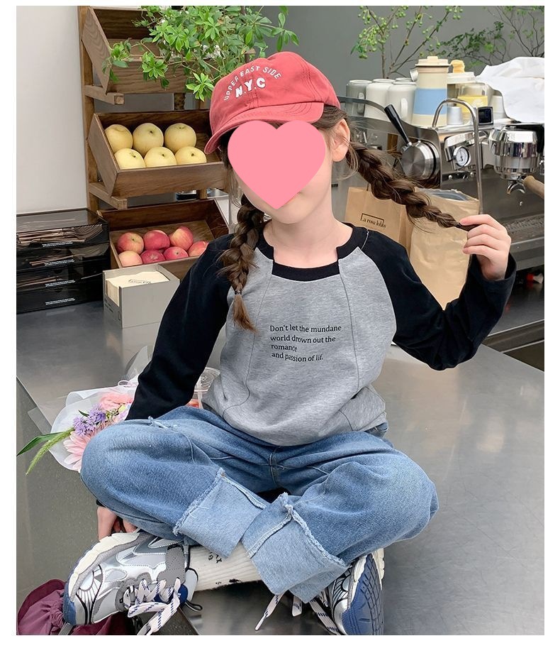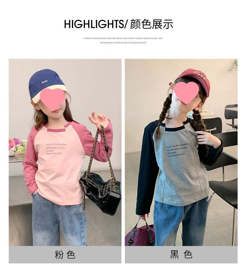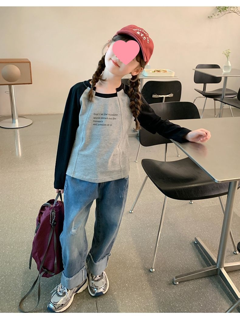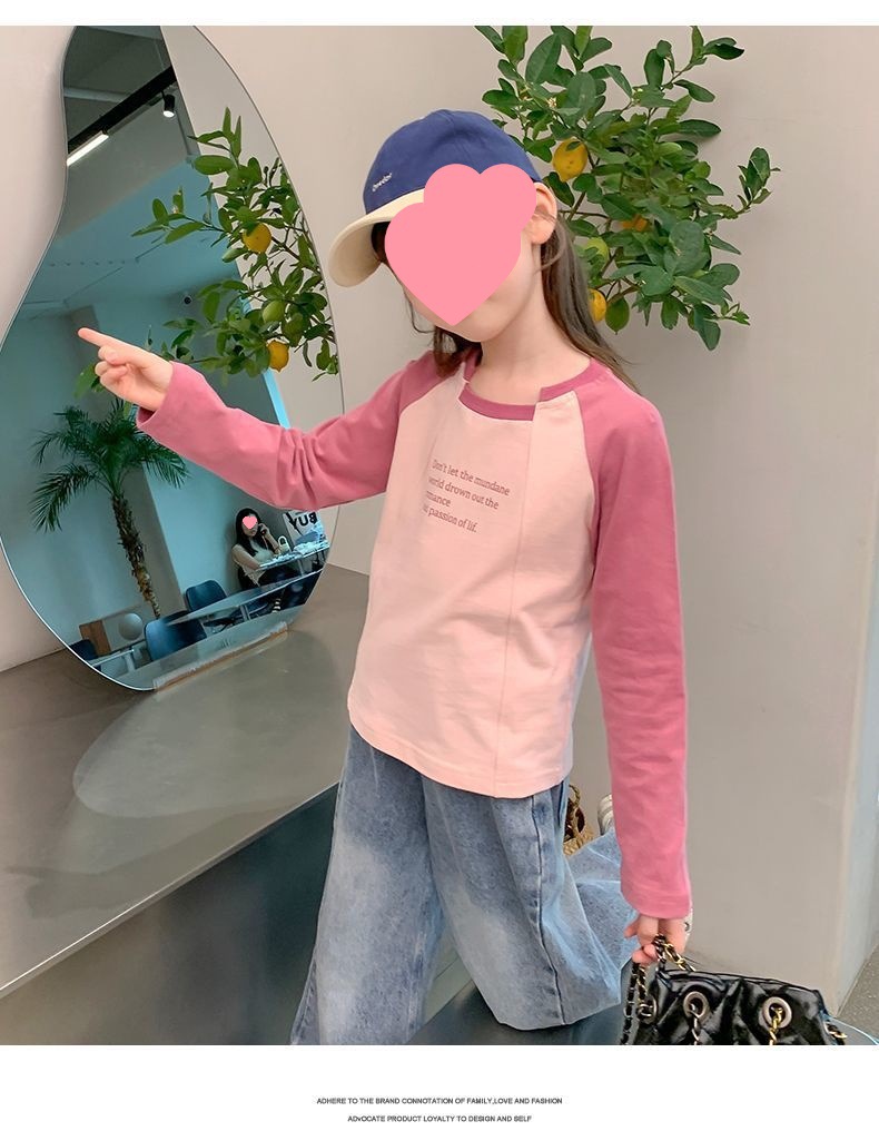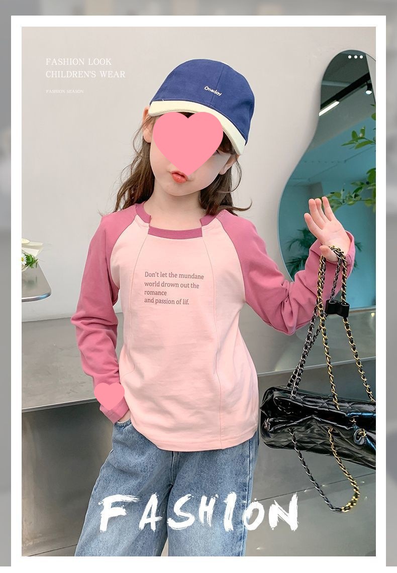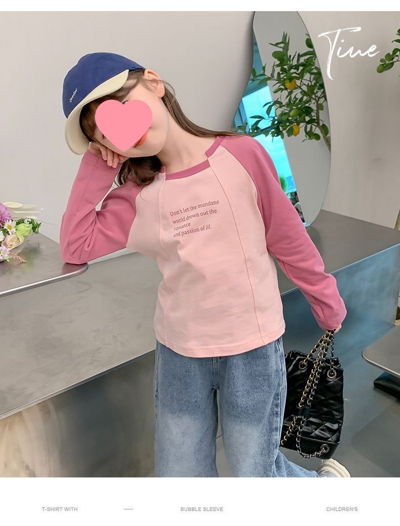 여아용 한국 스타일 캐주얼 만능 상의 긴팔 2024 봄 가을 신상 패션 배색 스타일리시 레터링 이너웨어 트렌디스토어 가기