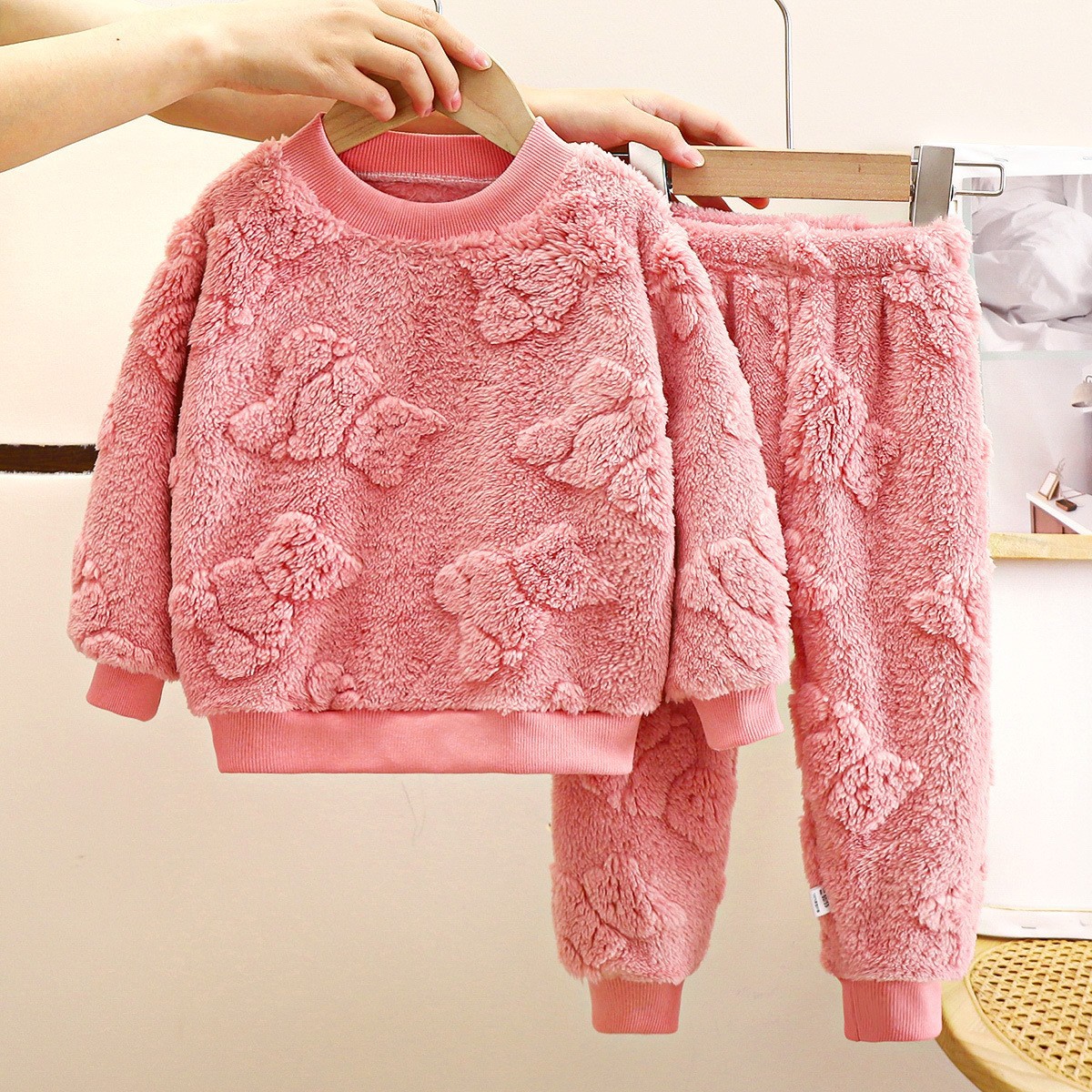 어린이 플란넬 잠옷 세트 2023 새 옷을 입고 집에서 기모 소년 소녀 2 피스 겨울 옷