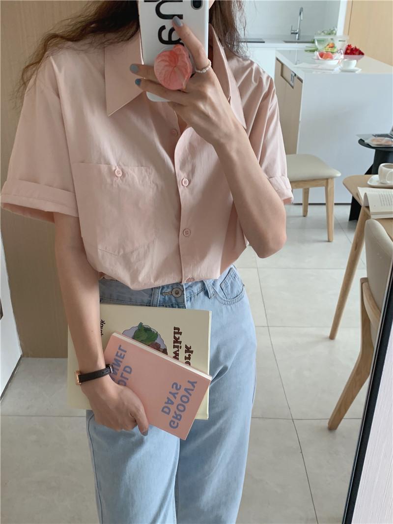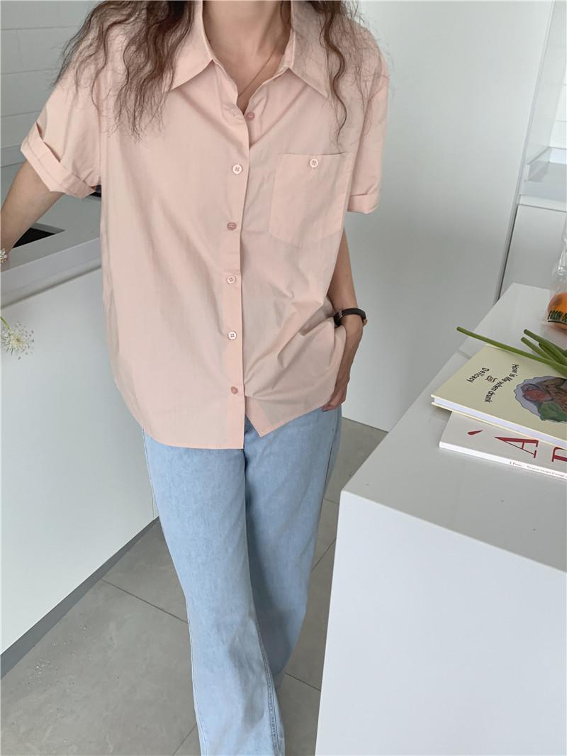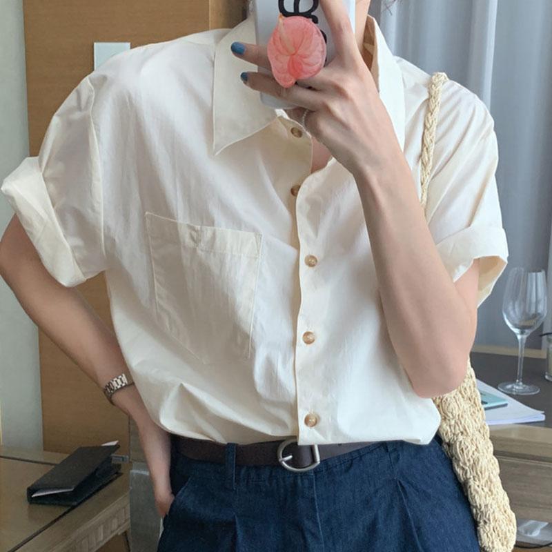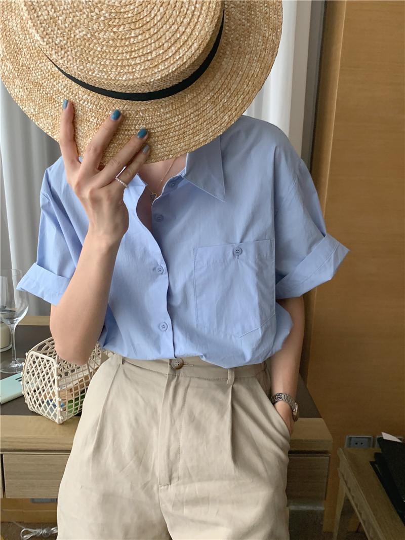 한국 프렌치 스타일 밀크 블루 화이트 라셀 싱글 브레스트 포켓 디자인 느슨한 캐주얼 반팔 셔츠 탑 여성스토어 가기