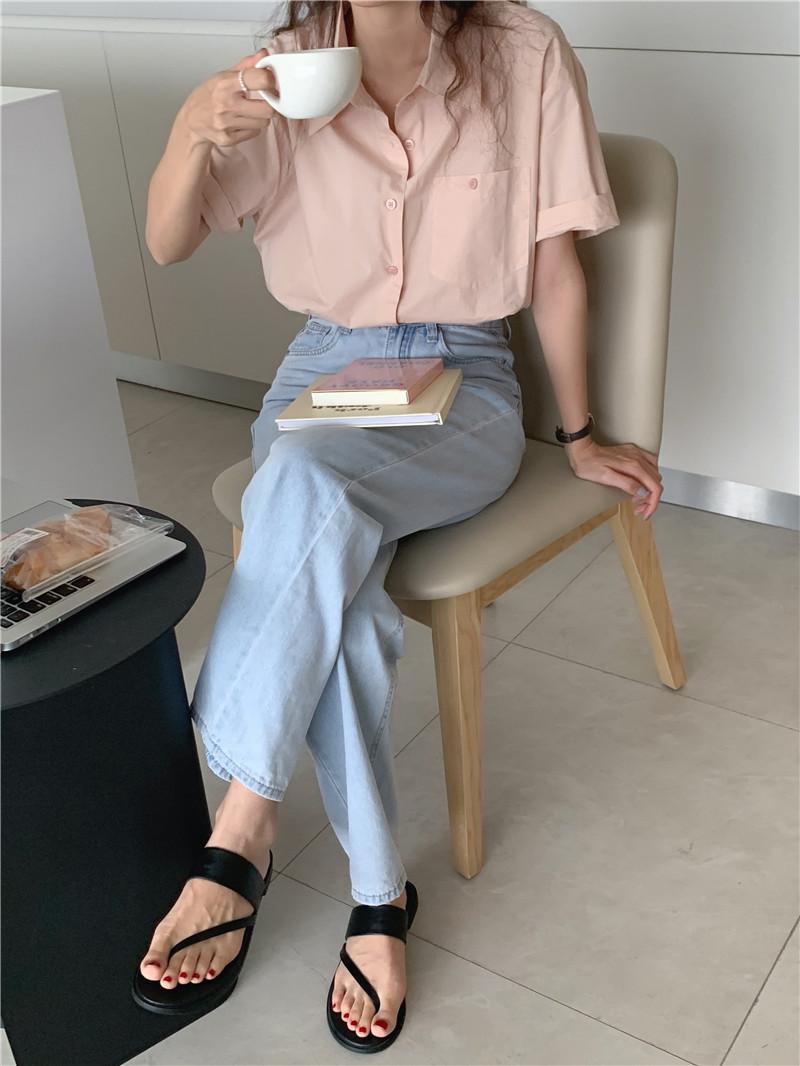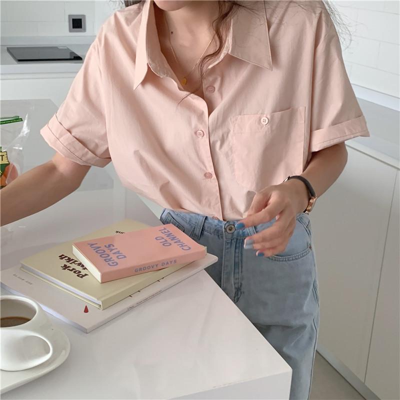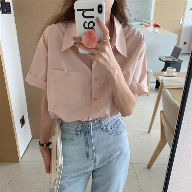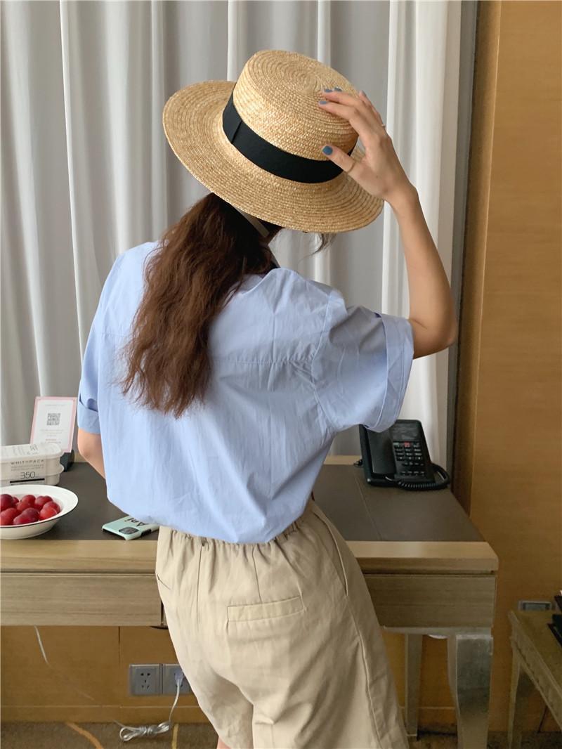 한국 프렌치 스타일 밀크 블루 화이트 라셀 싱글 브레스트 포켓 디자인 느슨한 캐주얼 반팔 셔츠 탑 여성스토어 가기