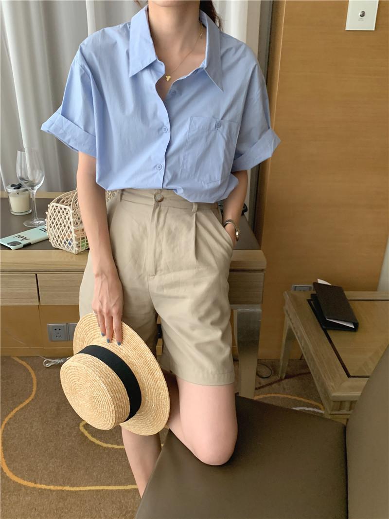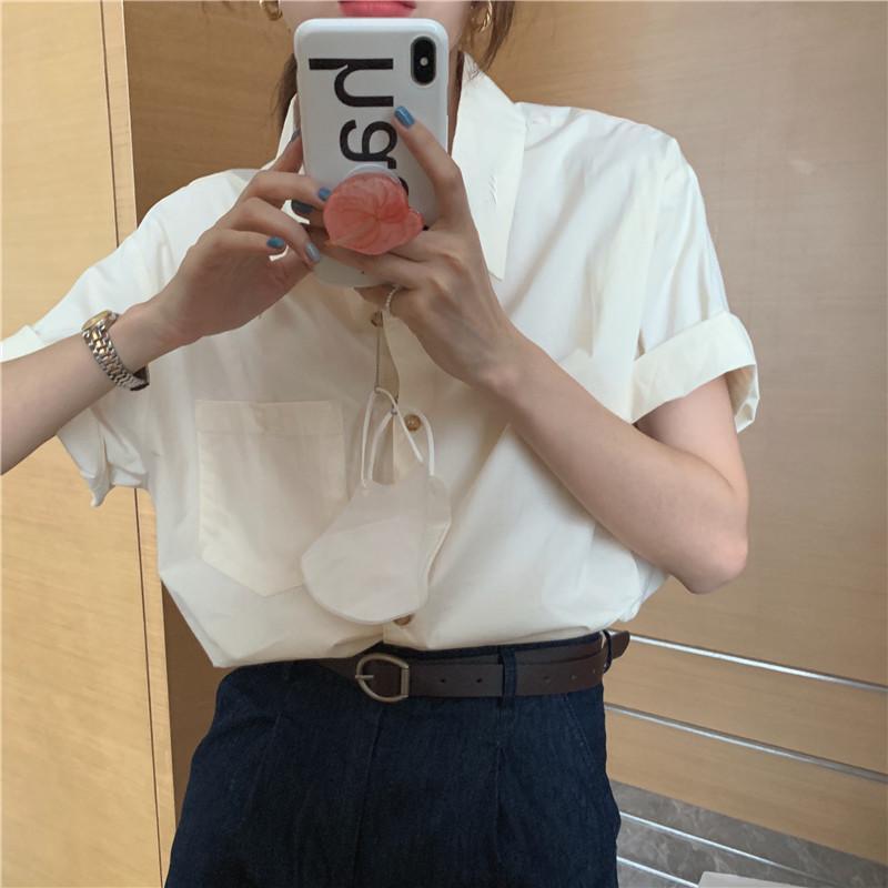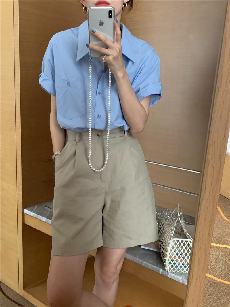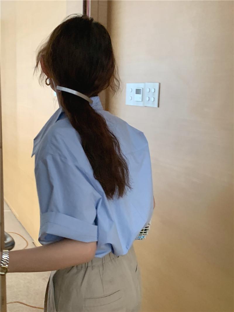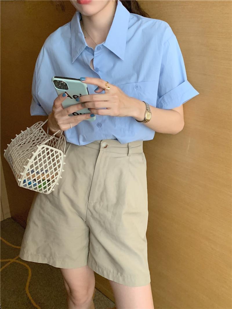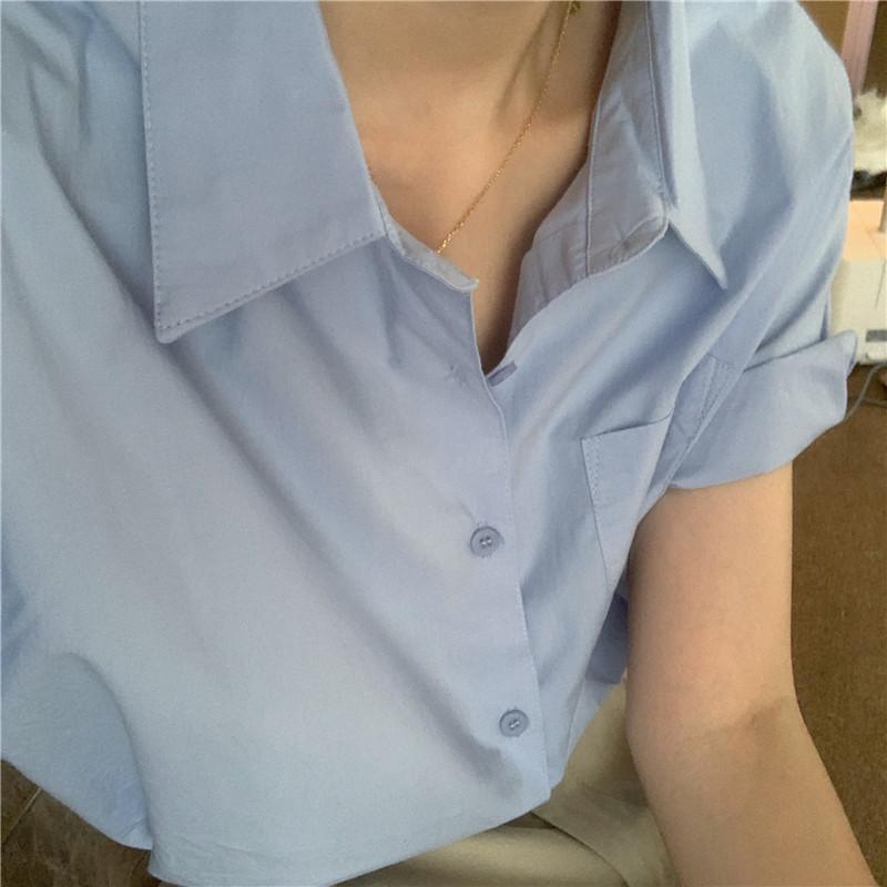 한국 프렌치 스타일 밀크 블루 화이트 라셀 싱글 브레스트 포켓 디자인 느슨한 캐주얼 반팔 셔츠 탑 여성
