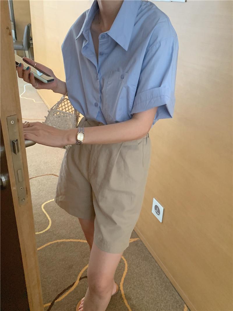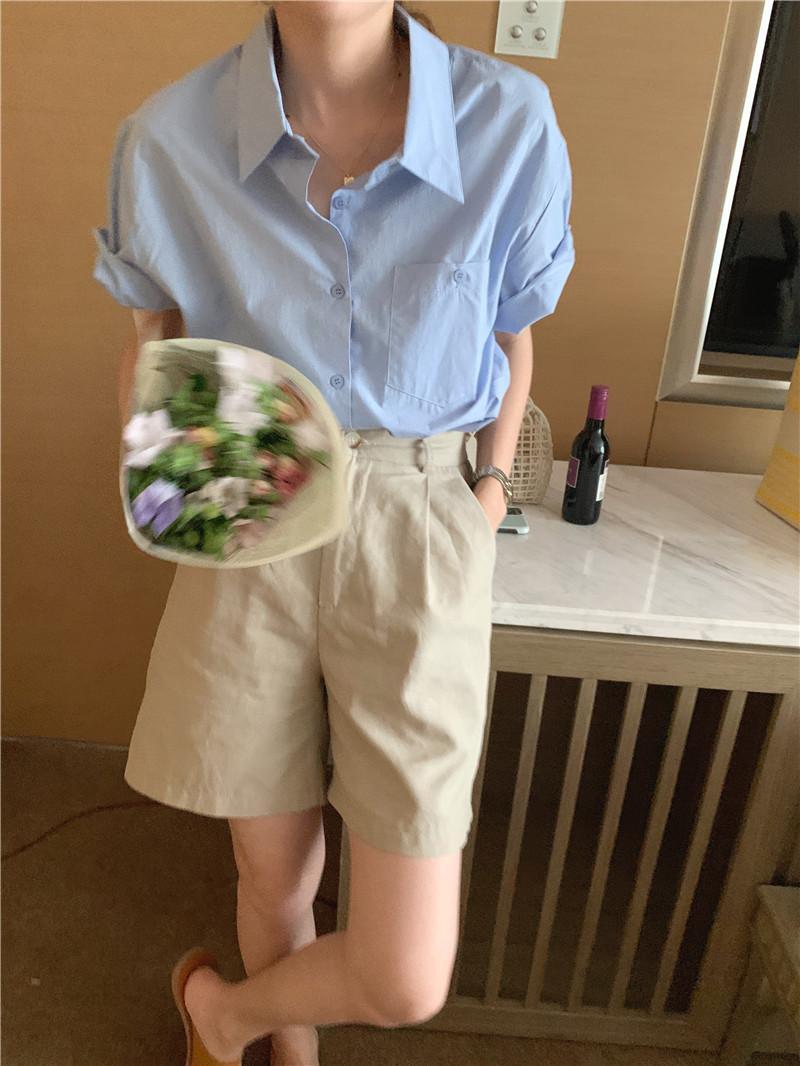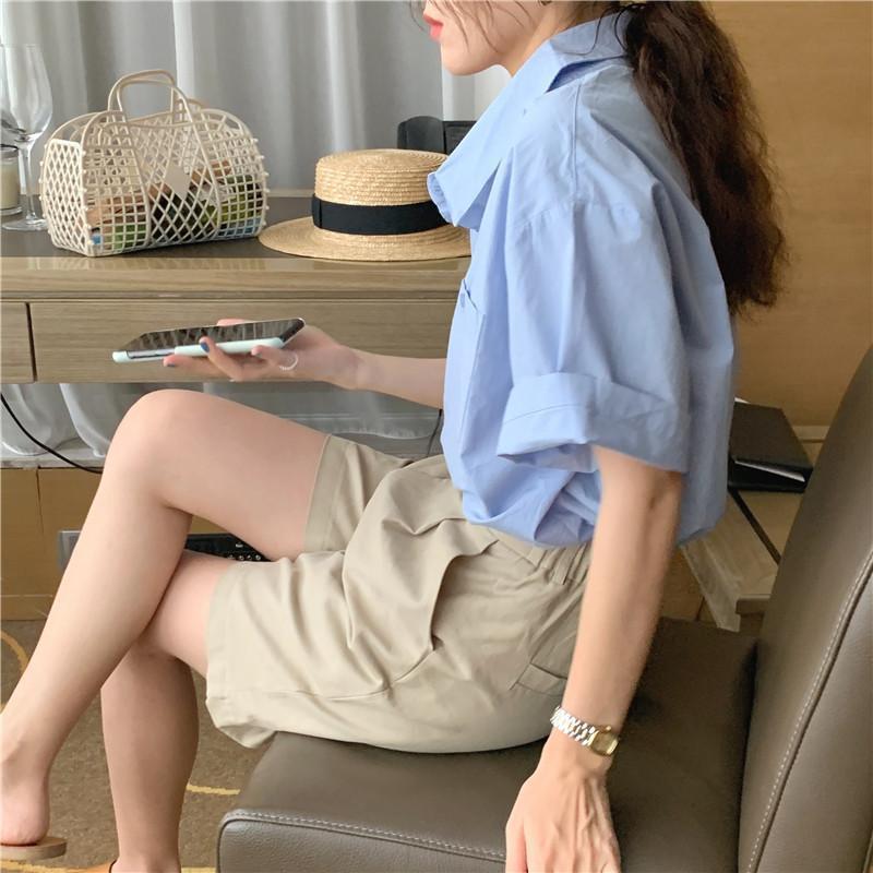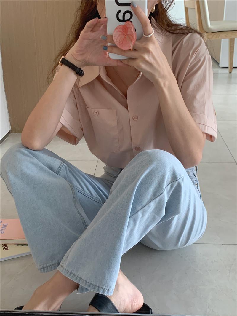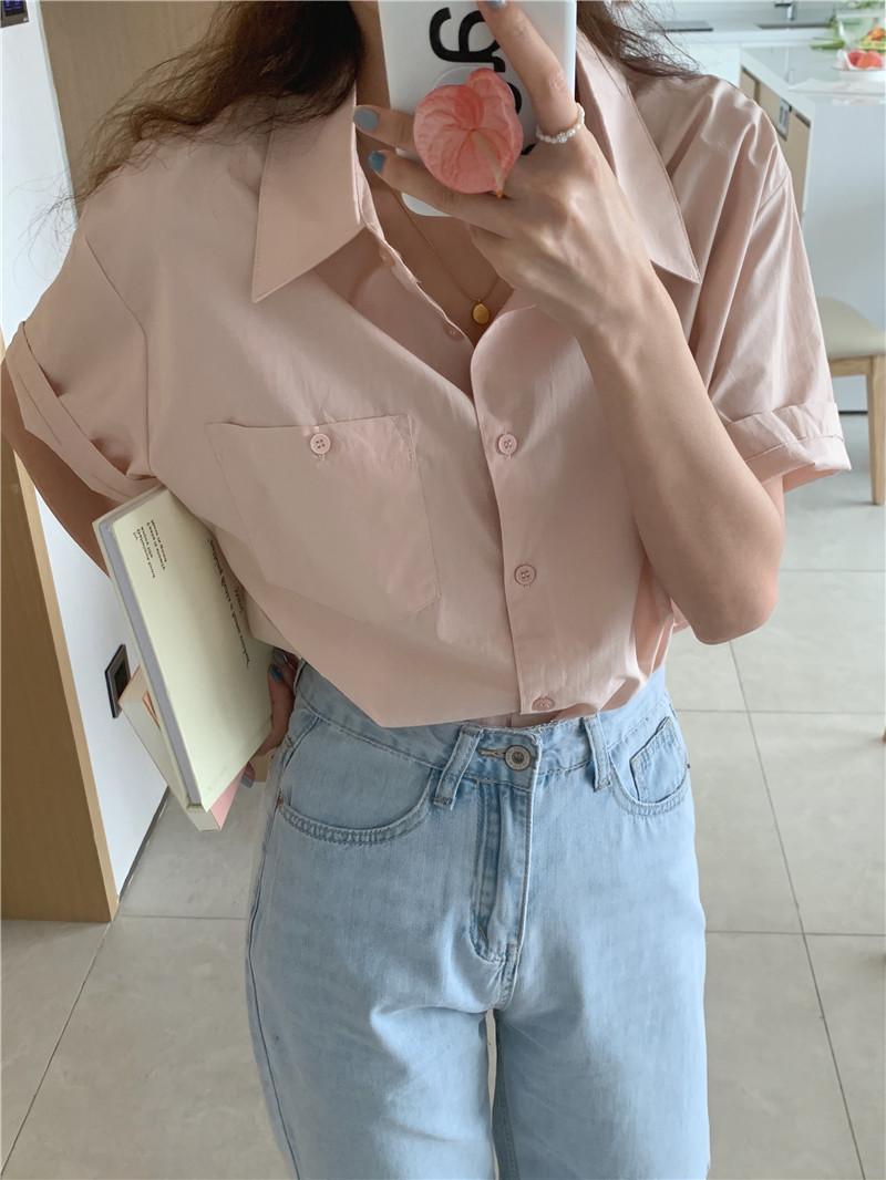 한국 프렌치 스타일 밀크 블루 화이트 라셀 싱글 브레스트 포켓 디자인 느슨한 캐주얼 반팔 셔츠 탑 여성