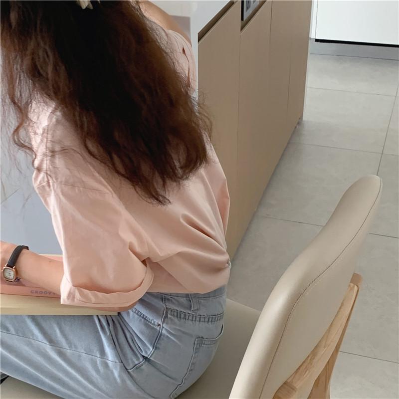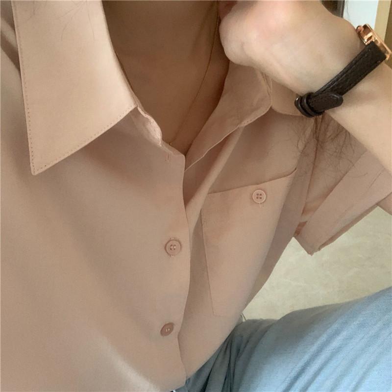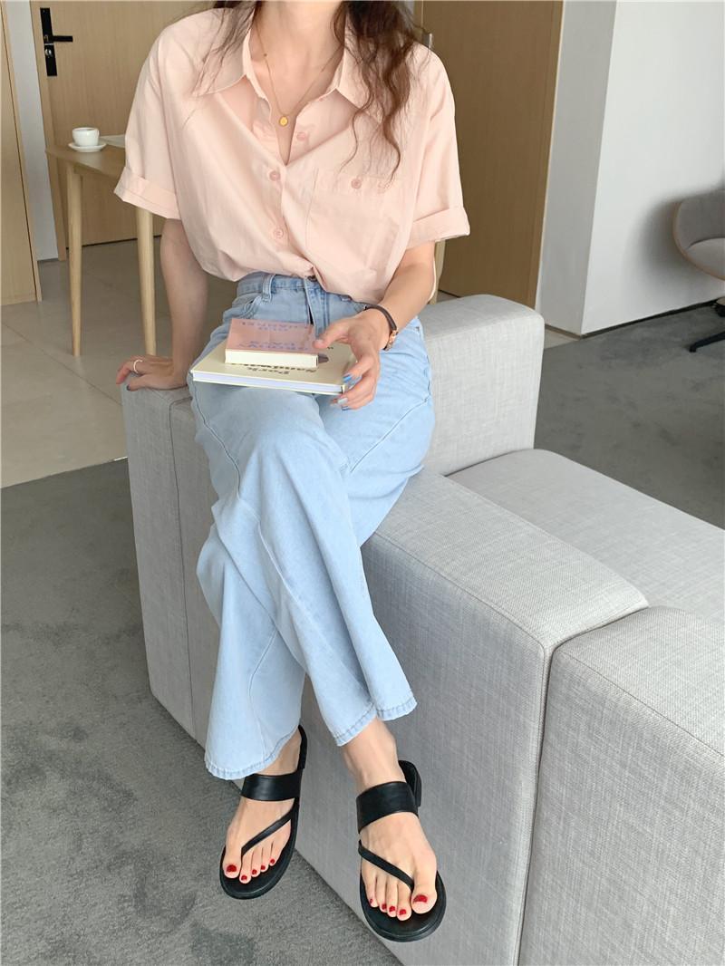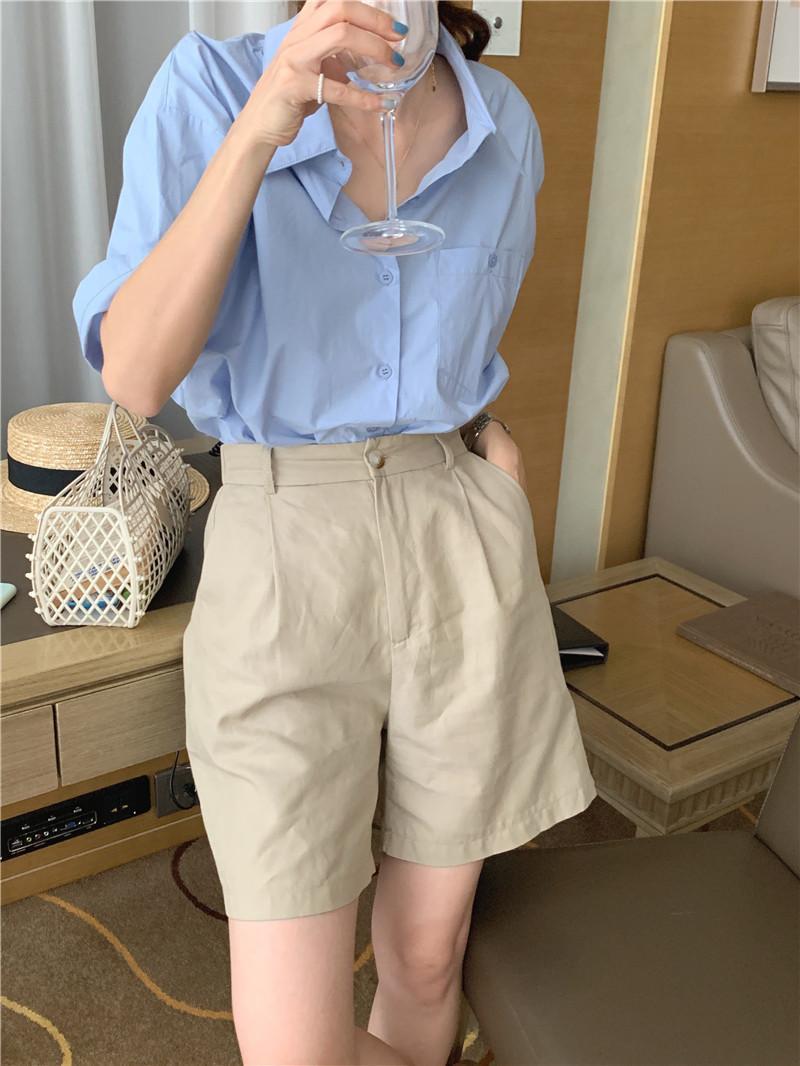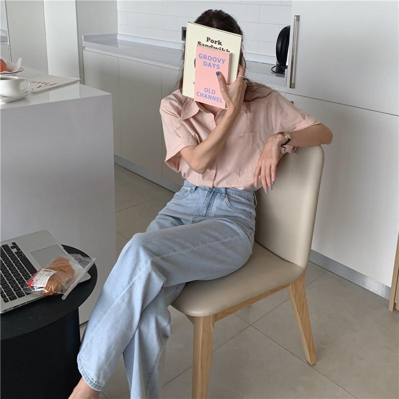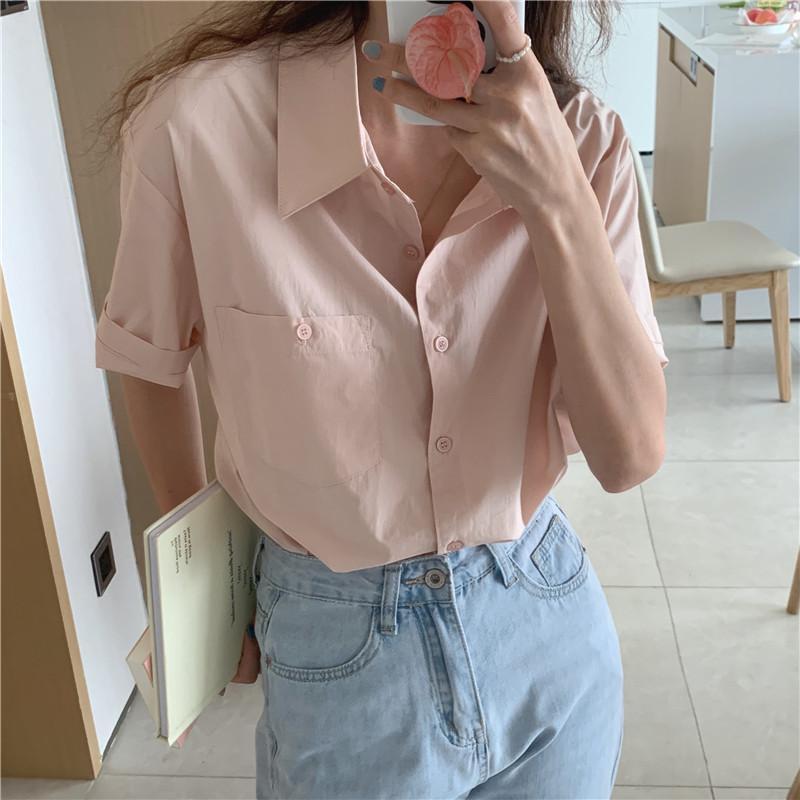 한국 프렌치 스타일 밀크 블루 화이트 라셀 싱글 브레스트 포켓 디자인 느슨한 캐주얼 반팔 셔츠 탑 여성