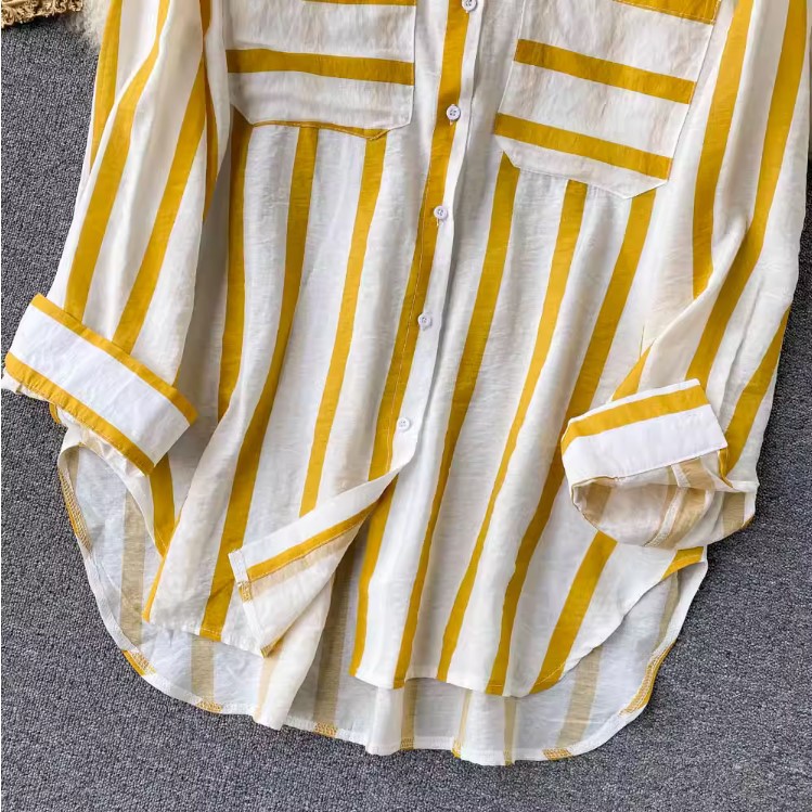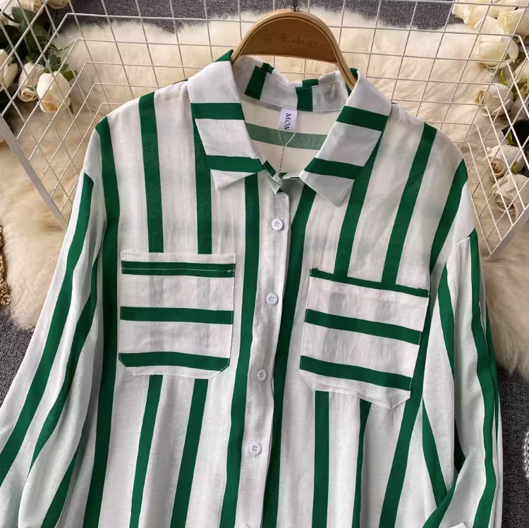 2025 크로스보더 여름과 봄 인기 TikTok 중간 길이 세로 줄무늬 멀티 컬러 셔츠 여성 캐주얼 루즈 긴팔 탑스토어 가기