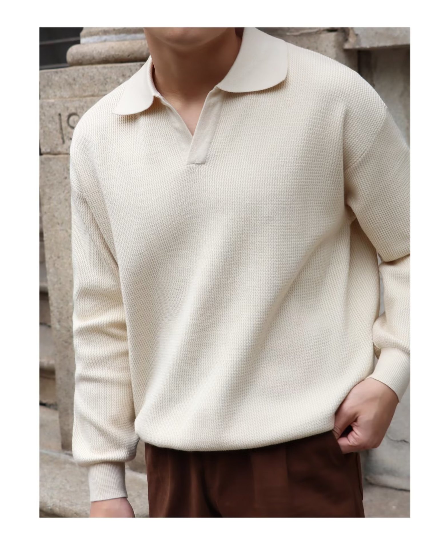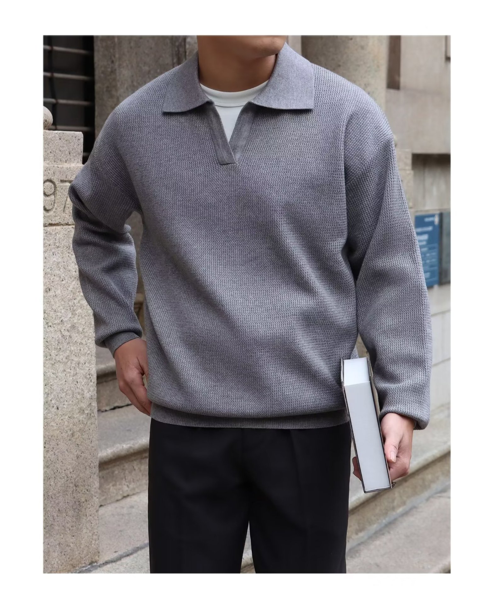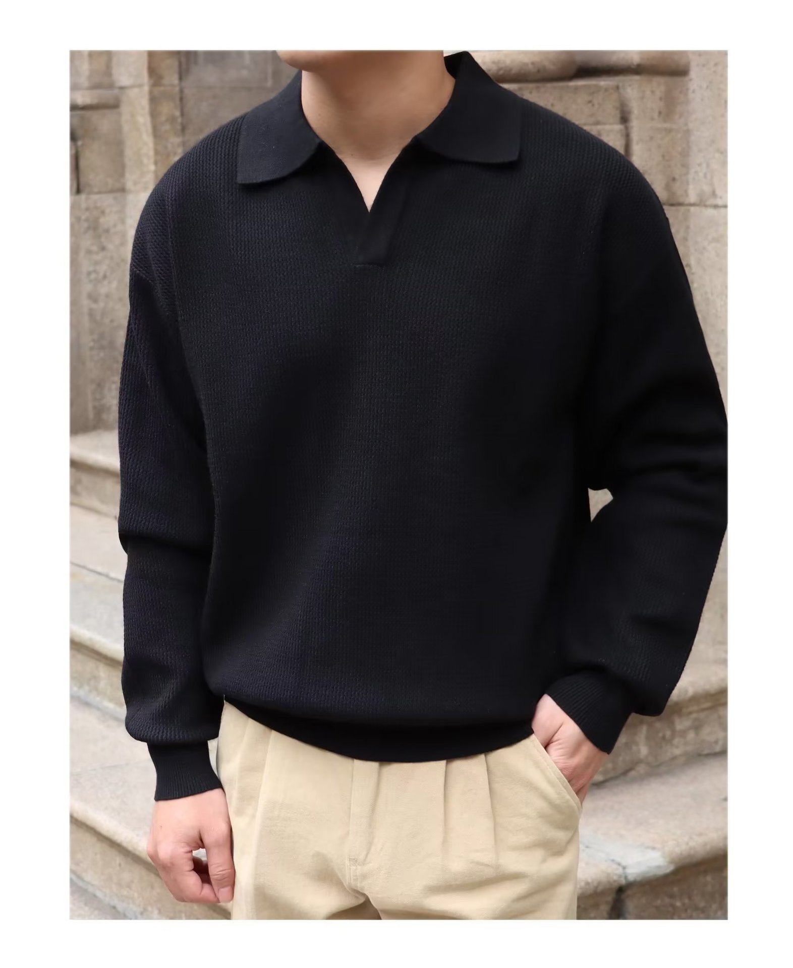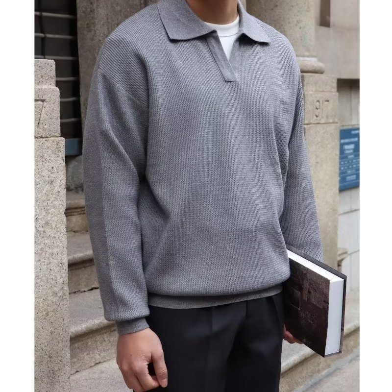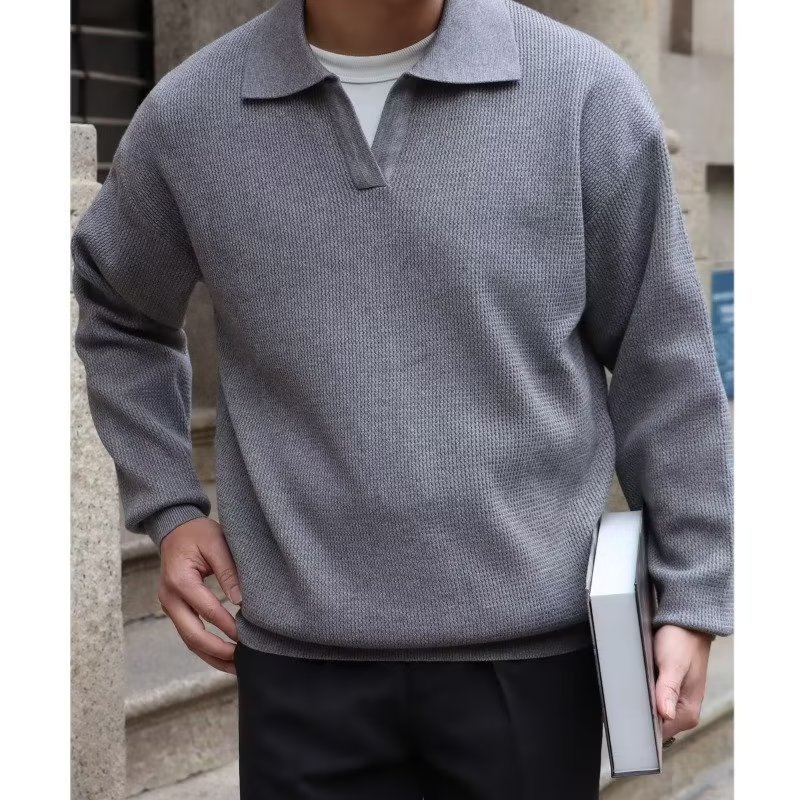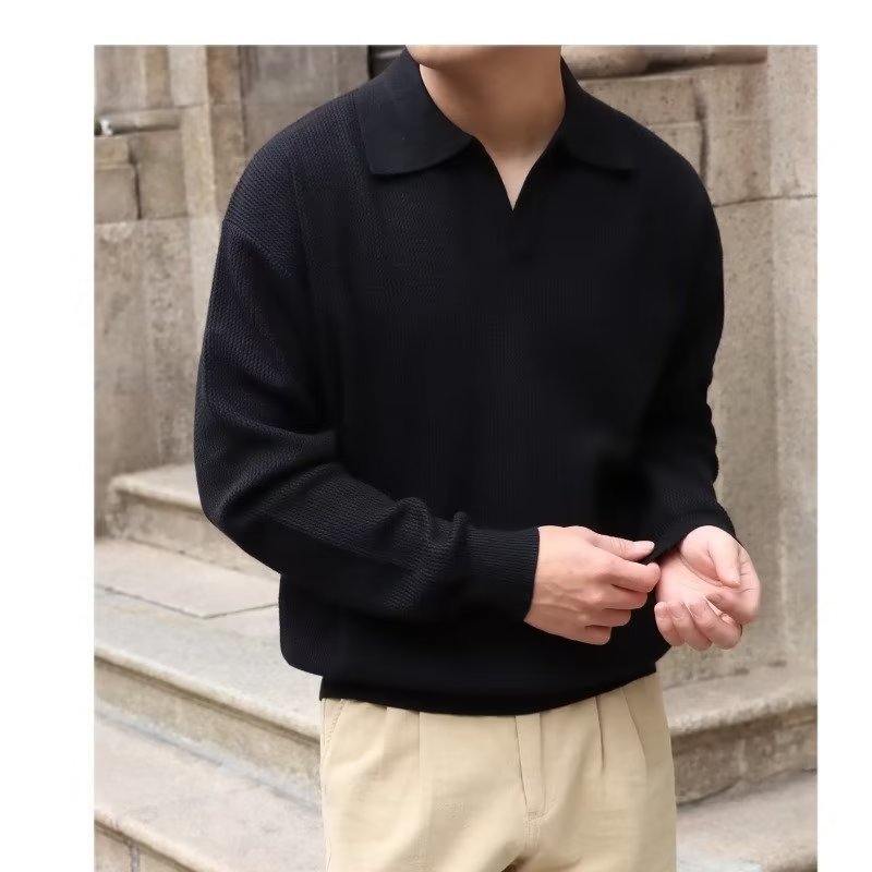 단색 셔츠 칼라 남성용 긴팔 겉옷 가을 탑 유행 가짜 투피스 니트 스웨터 남성용 한국식 슬림핏스토어 가기