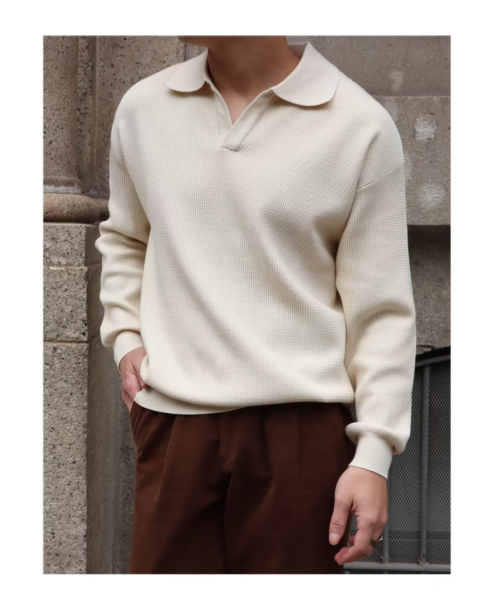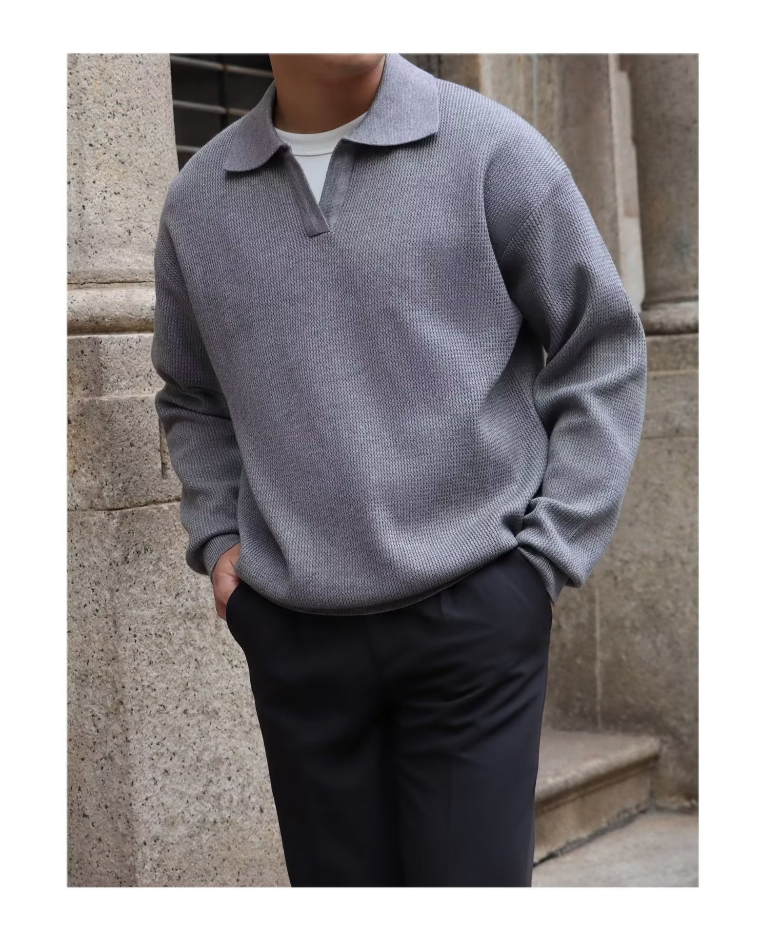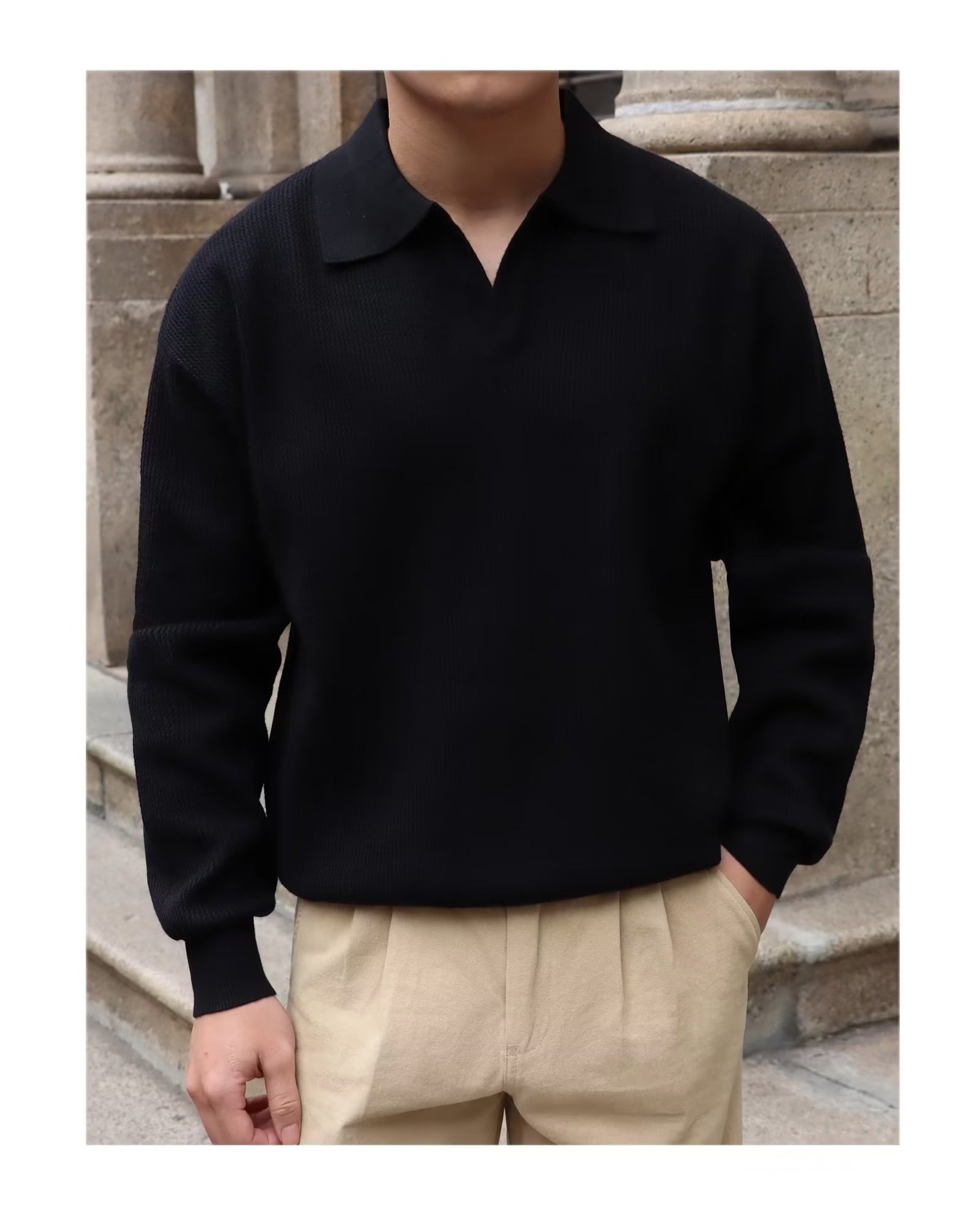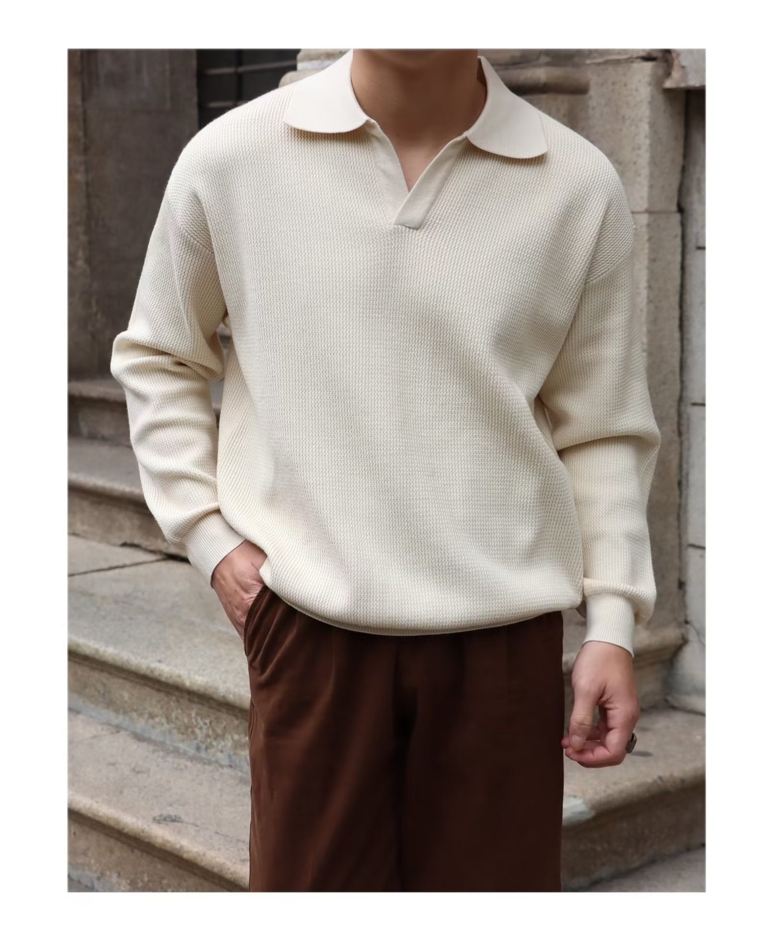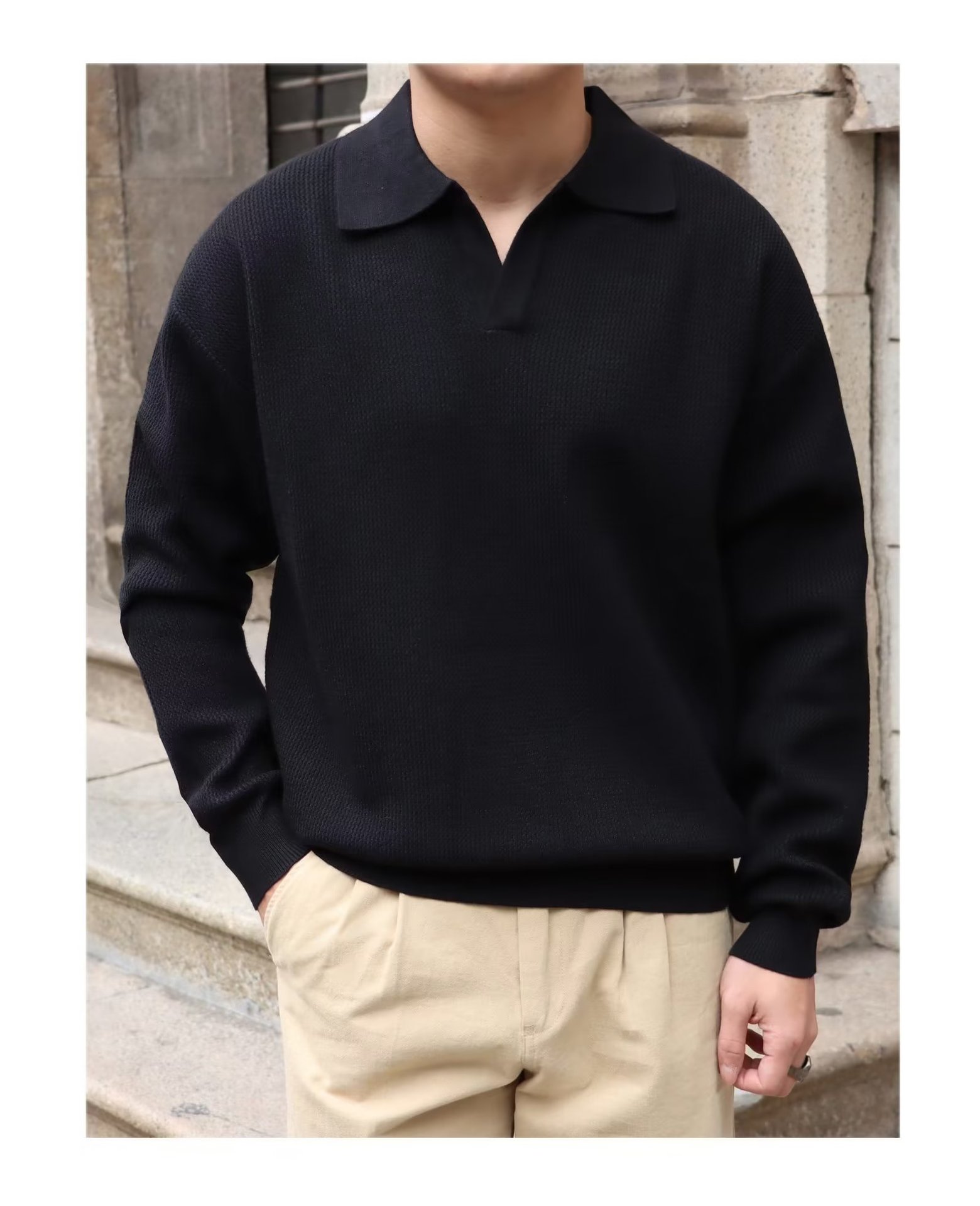 단색 셔츠 칼라 남성용 긴팔 겉옷 가을 탑 유행 가짜 투피스 니트 스웨터 남성용 한국식 슬림핏스토어 가기