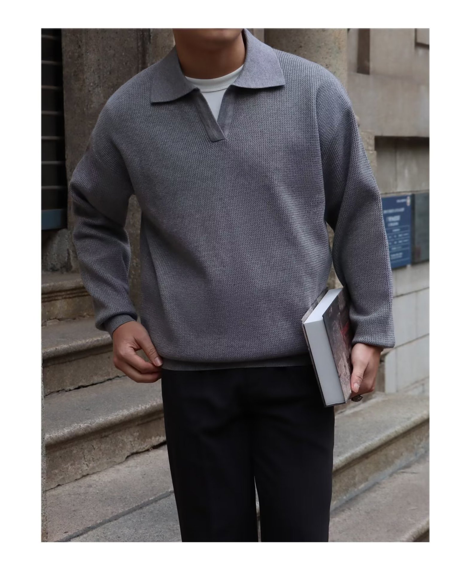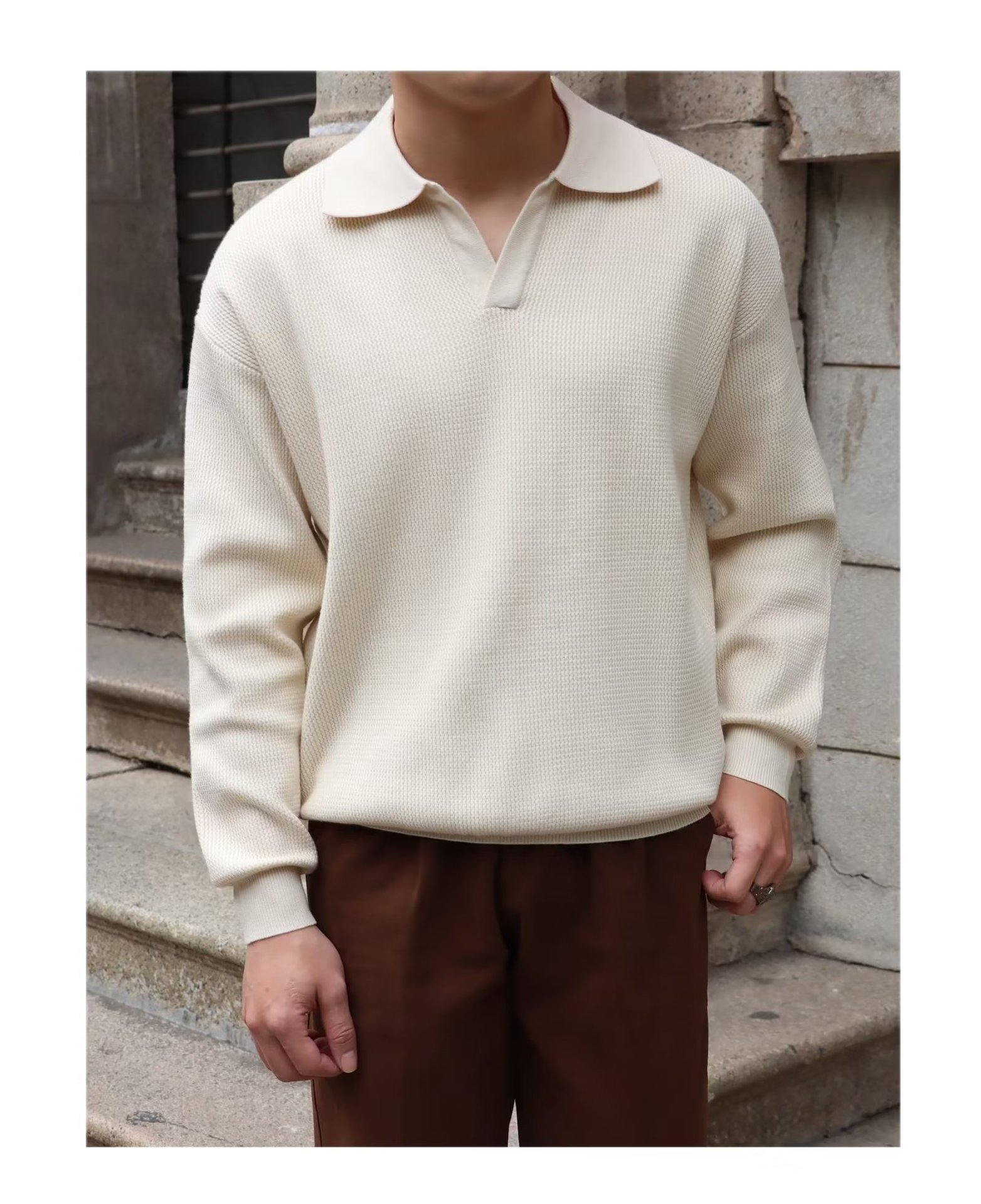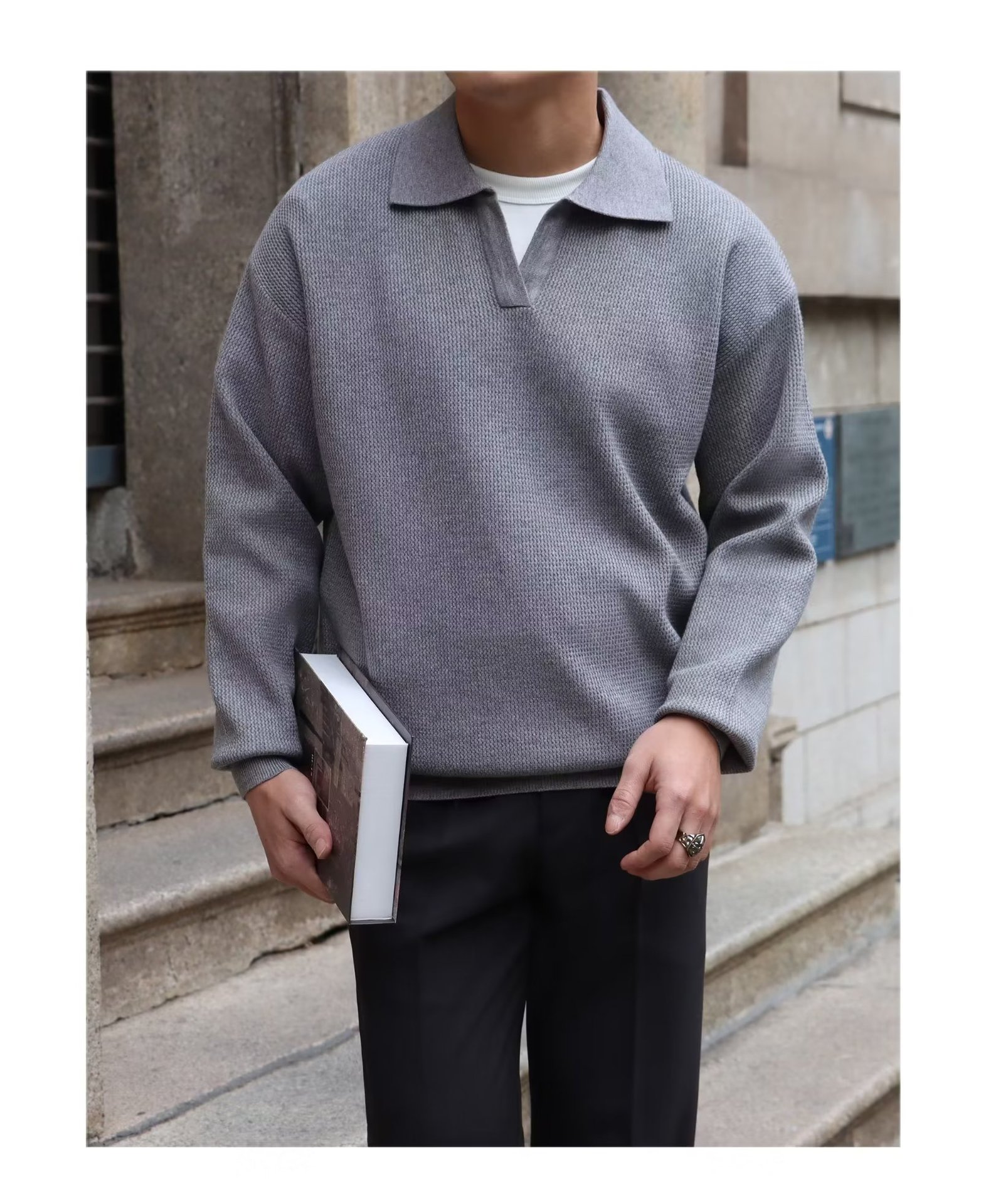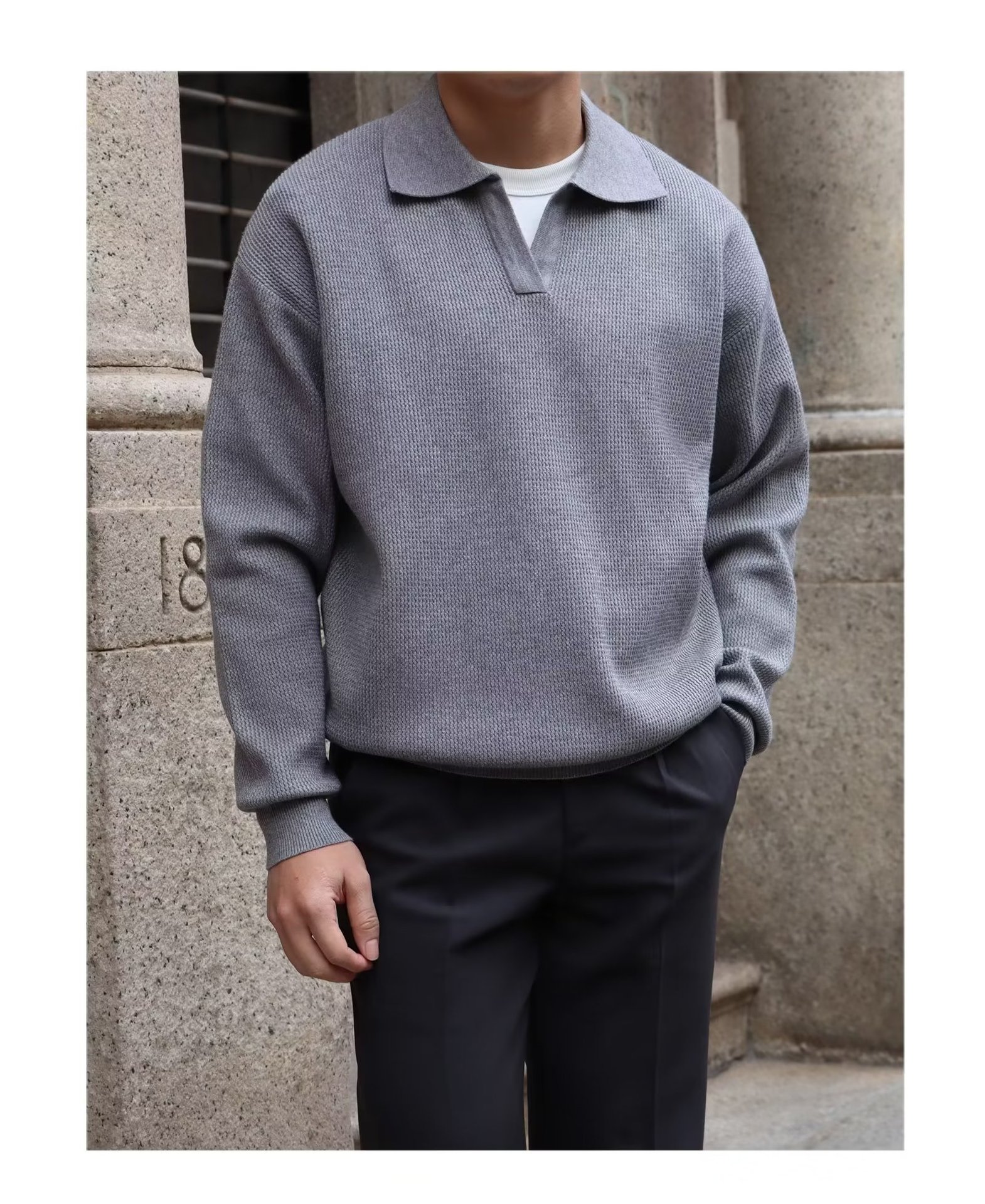 단색 셔츠 칼라 남성용 긴팔 겉옷 가을 탑 유행 가짜 투피스 니트 스웨터 남성용 한국식 슬림핏스토어 가기