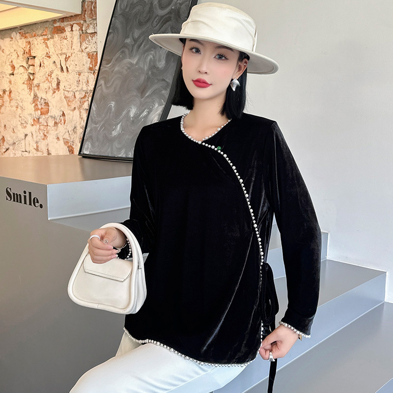 리얼 샷 블랙 벨벳 중국 탑 레트로 여성 2023 가을 새로운 패션 서양식 긴 소매 페르시 셔츠