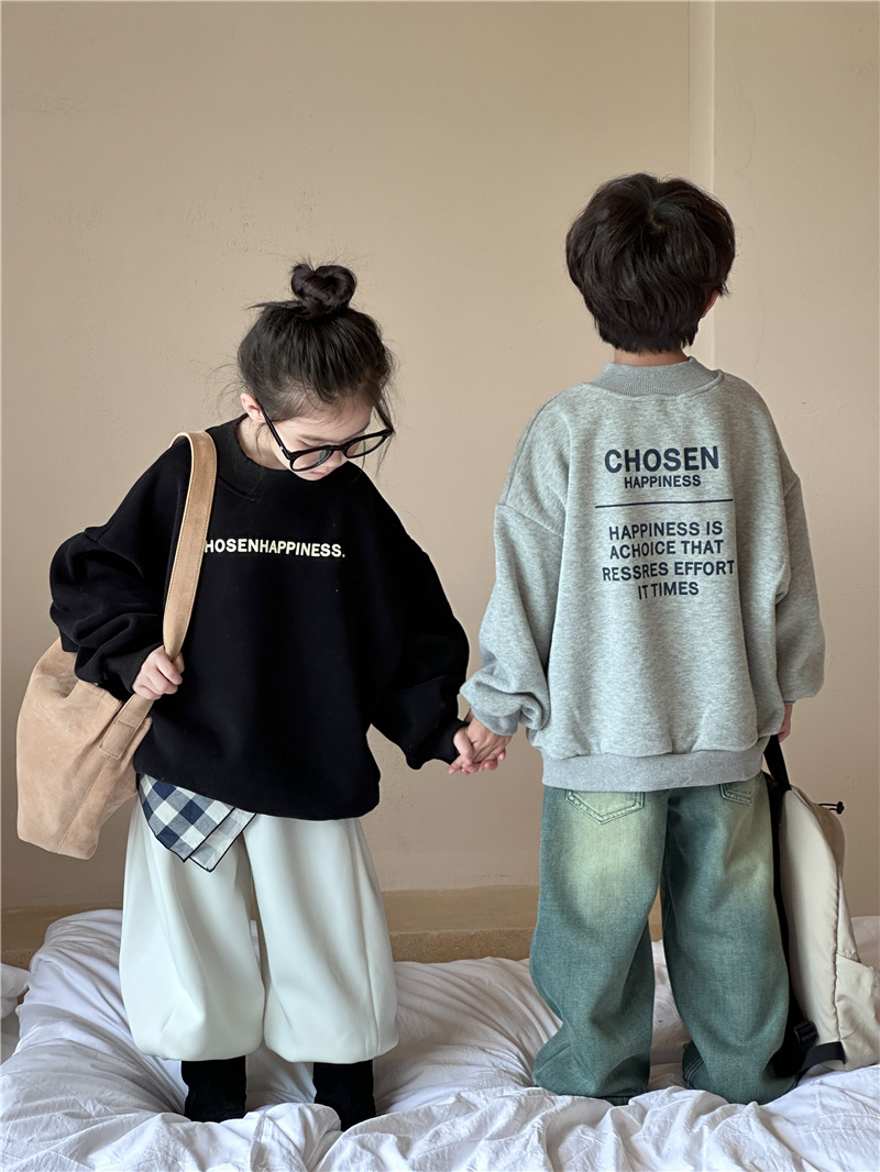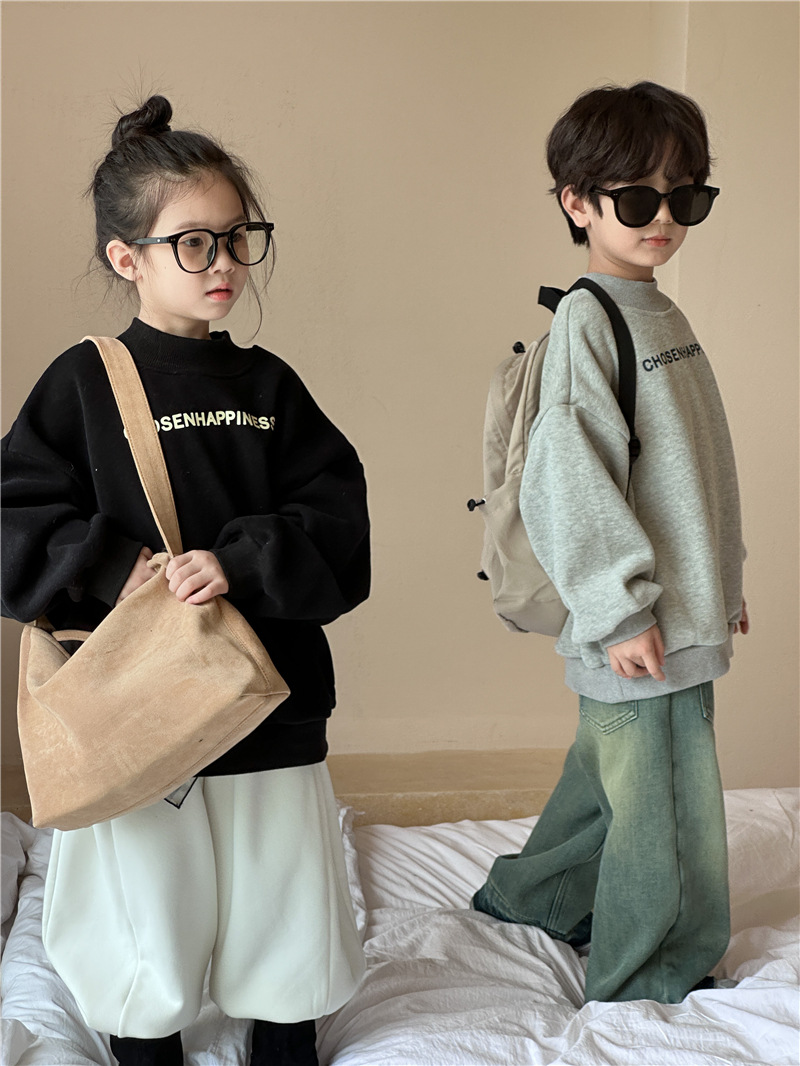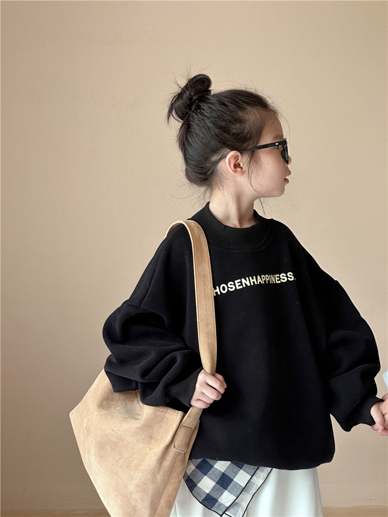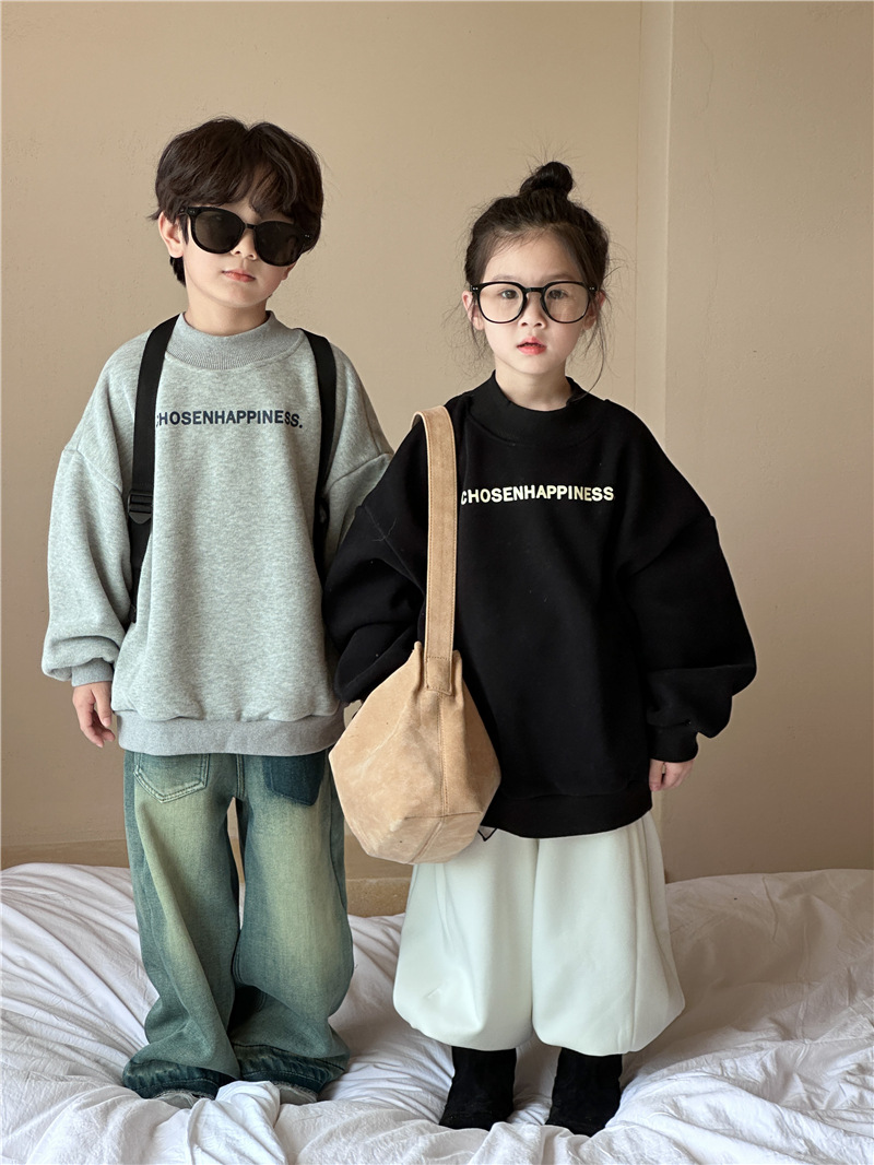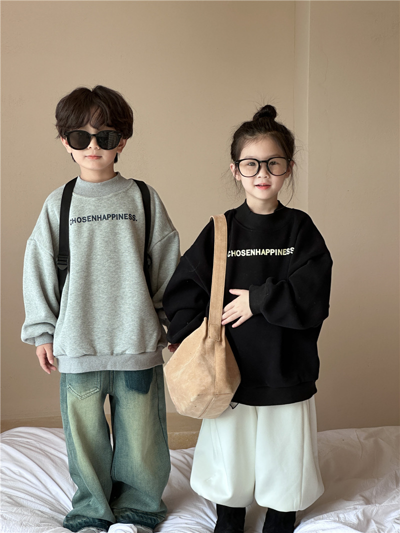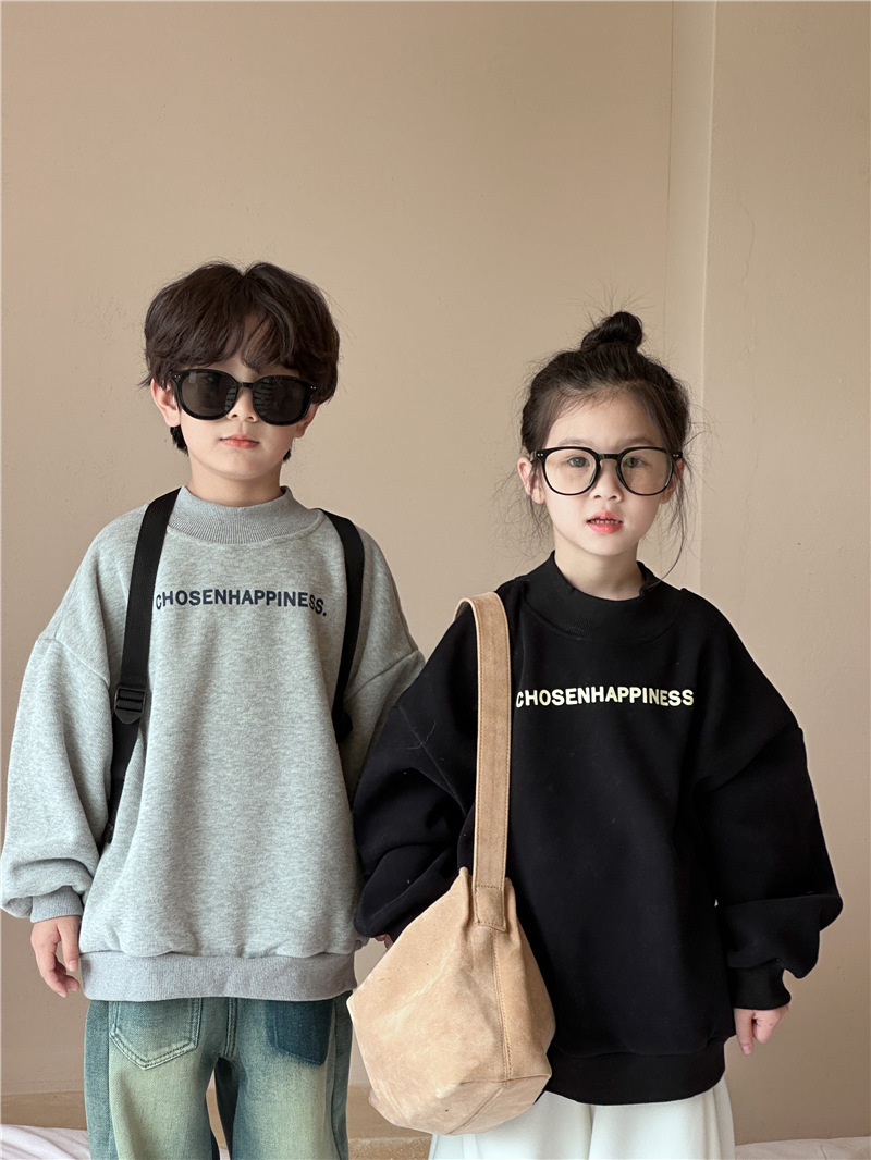 2025 겨울 신상 아동복 한국 스타일 아동용 플리스 스웨트셔츠 남녀공용 앞뒤 레터링 반하이넥 풀오버 상의