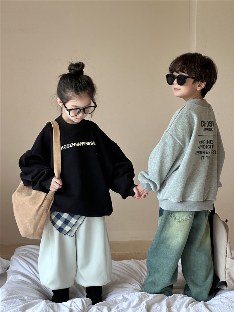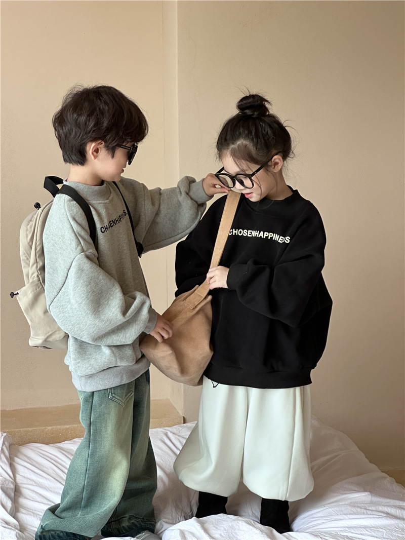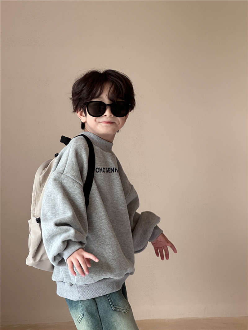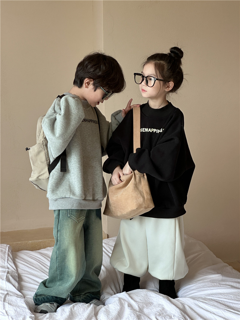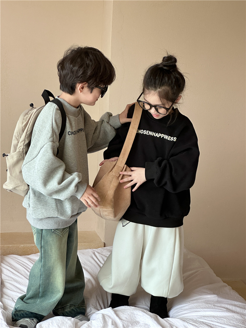 2025 겨울 신상 아동복 한국 스타일 아동용 플리스 스웨트셔츠 남녀공용 앞뒤 레터링 반하이넥 풀오버 상의