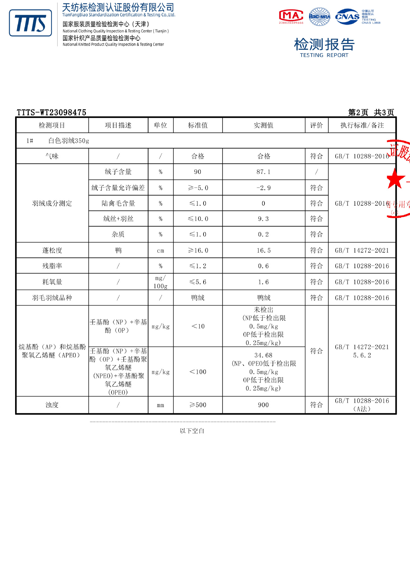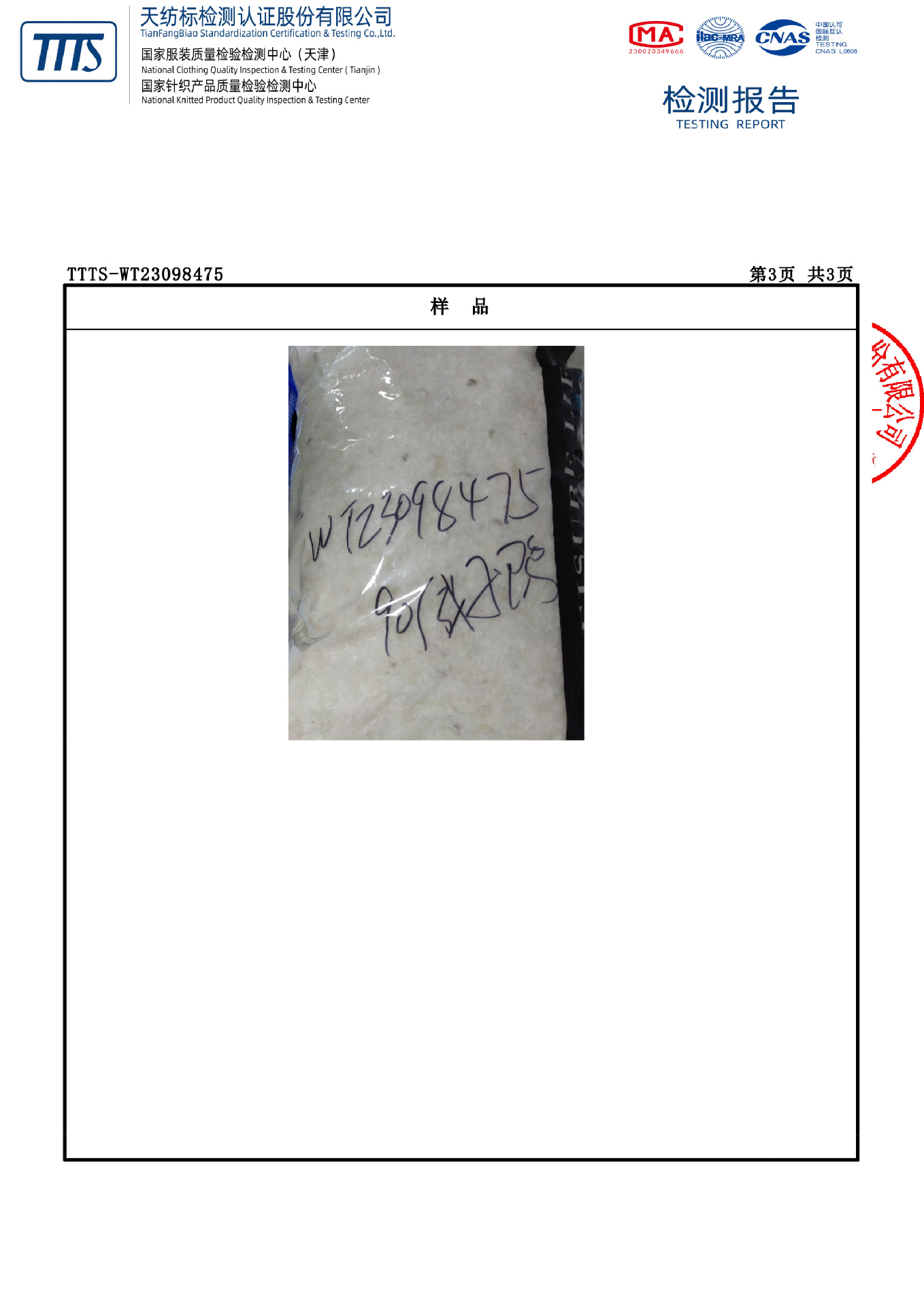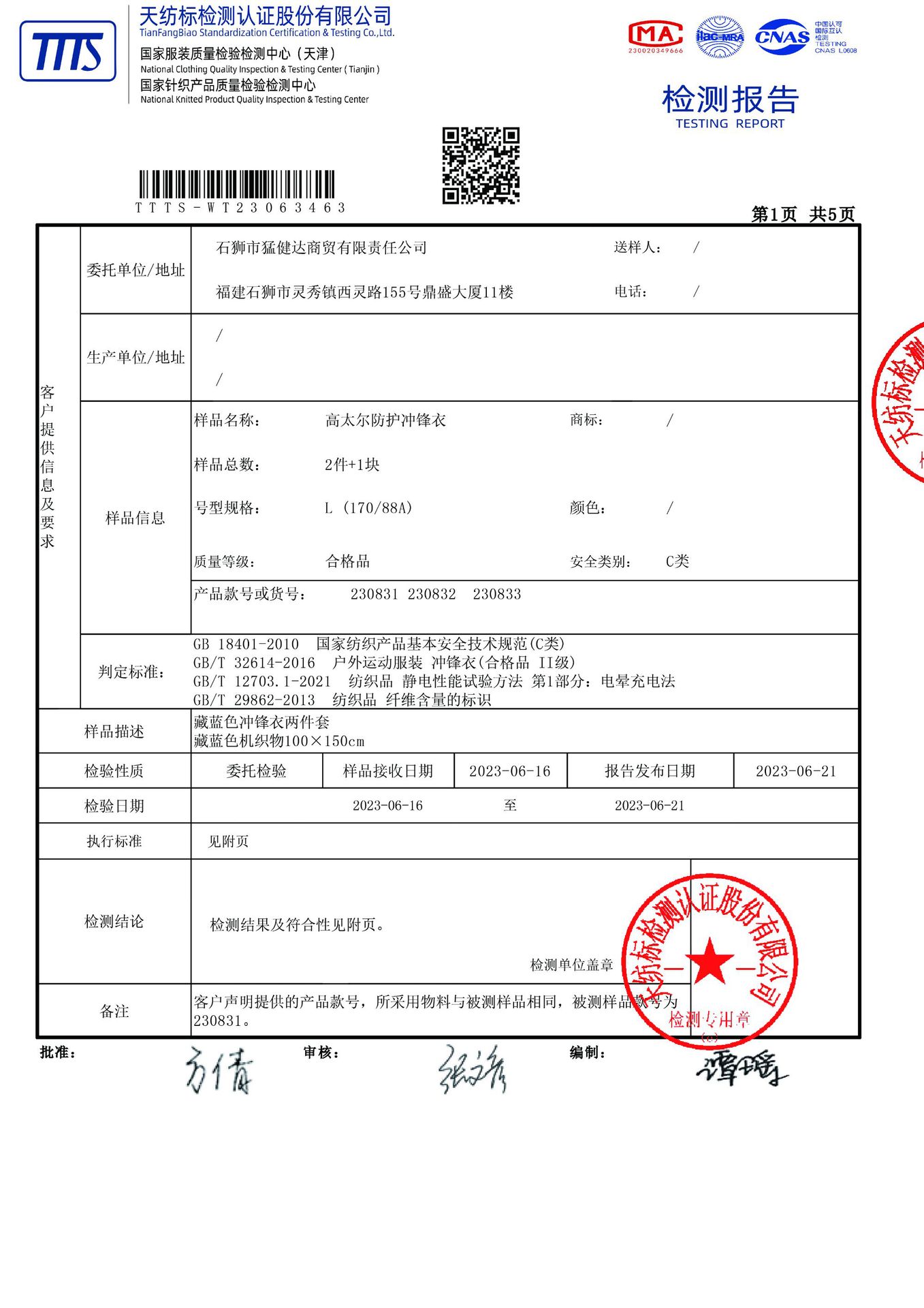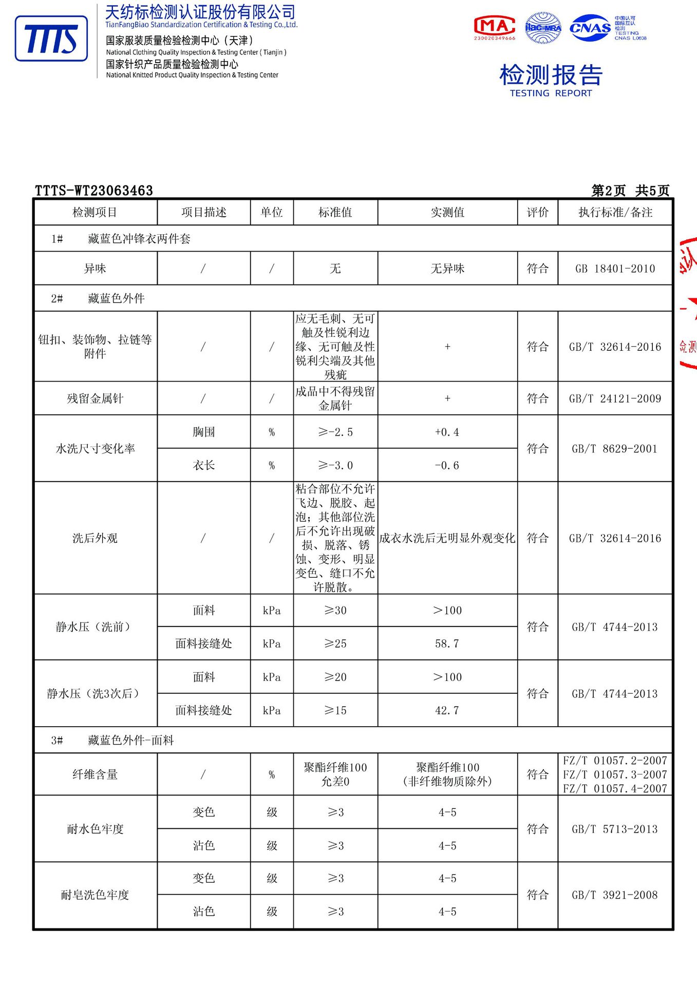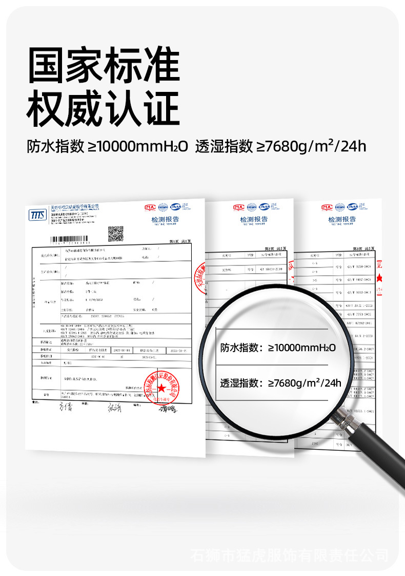 本款送检编号T T T S - W T 2 3 0 6 3 4 6 3,防水≥10000mm,透湿≥7600g/(㎡·24h),吊牌标注5000为最低达标值,非实测值,请放心穿着。