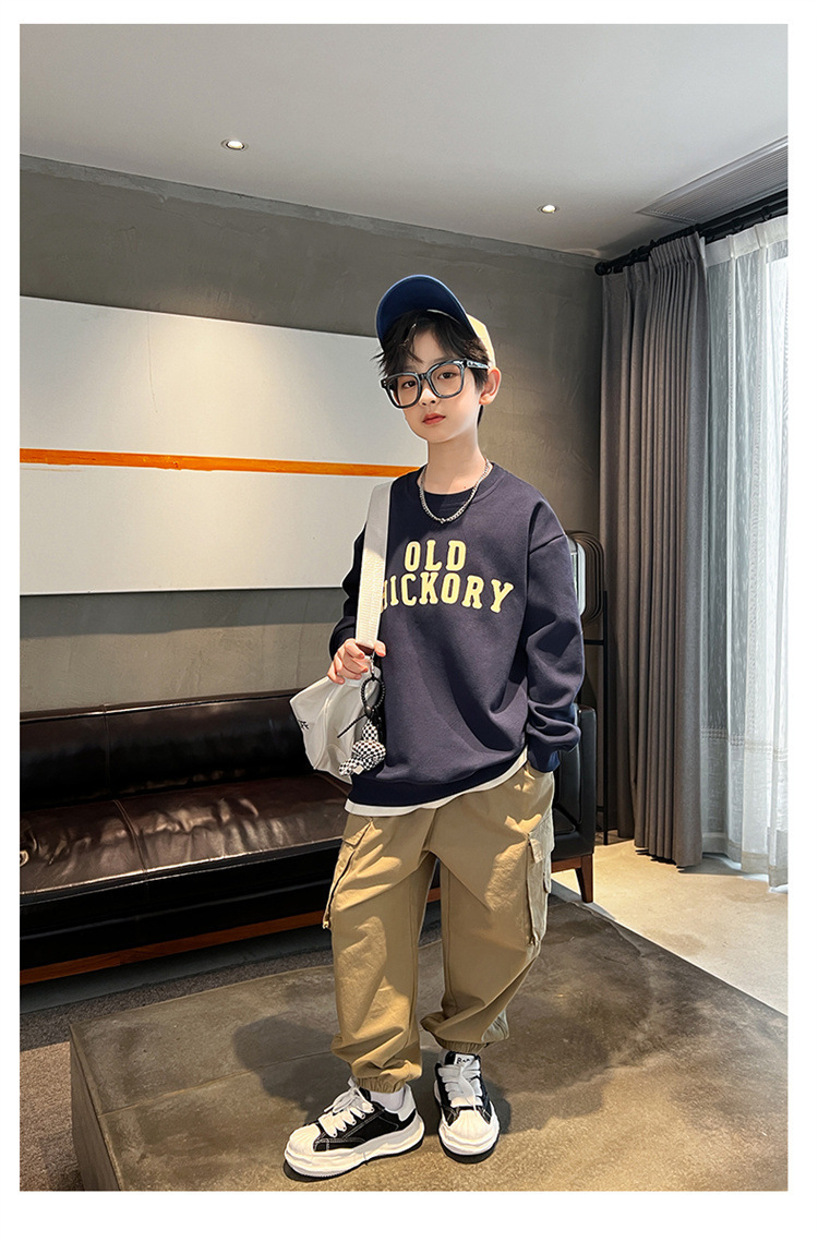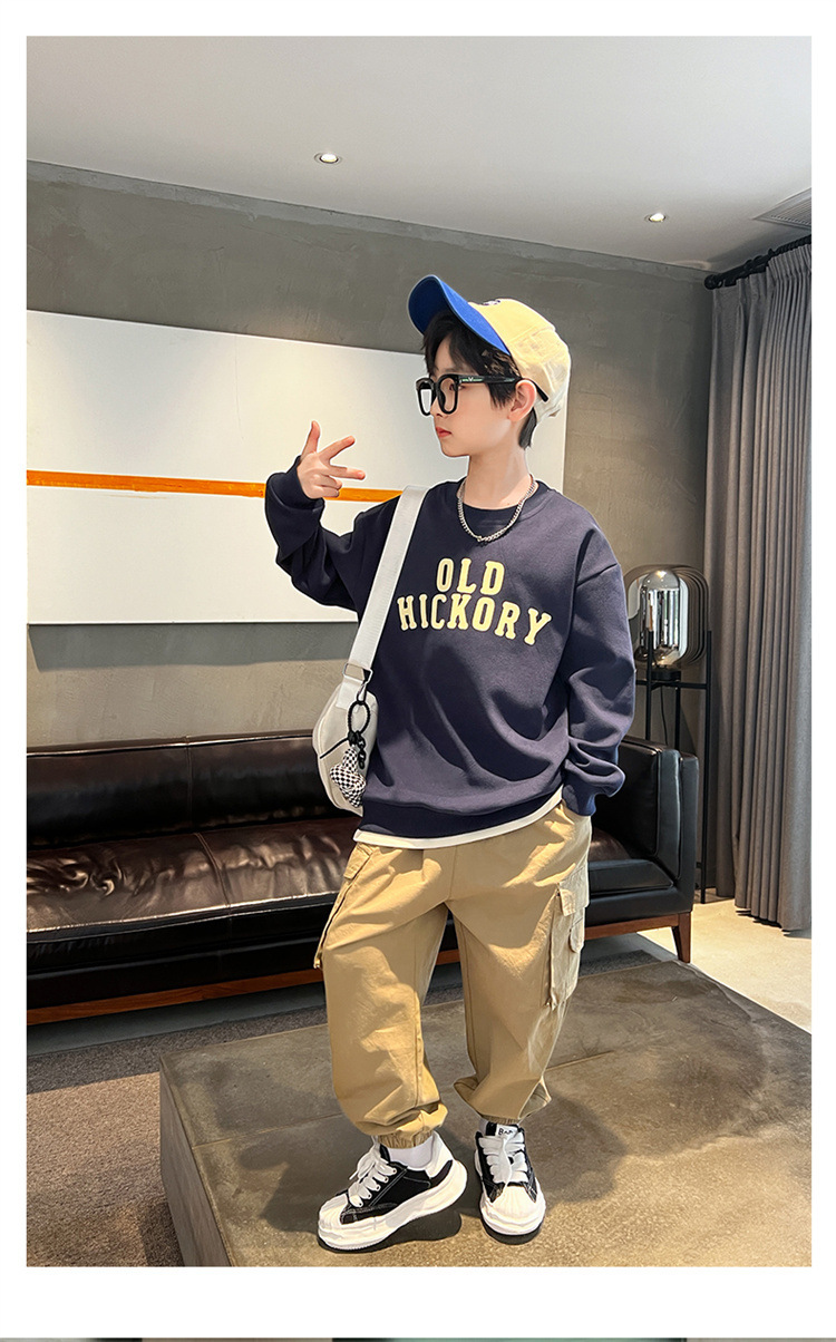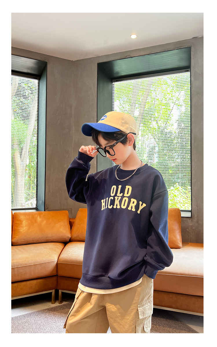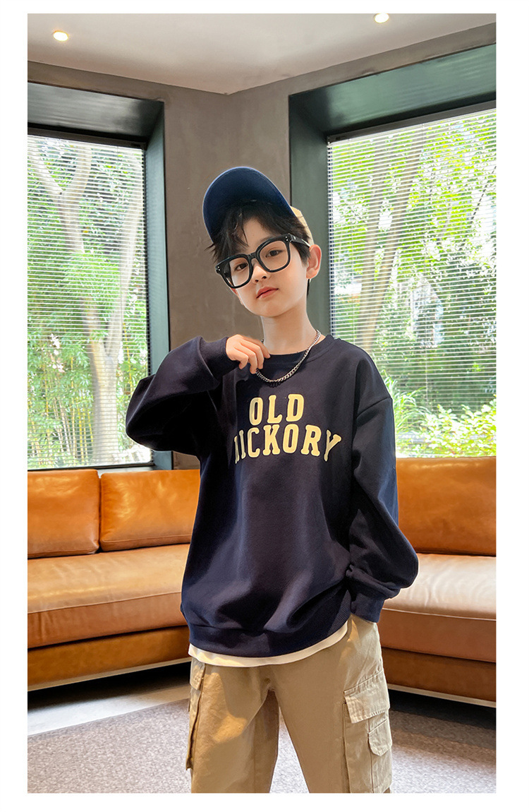 어린이 소년 크루넥 풀오버 스웨터 2023 새로운 봄과 가을 잘 생긴 소년의 큰 소년의 튀김 스트리트 탑