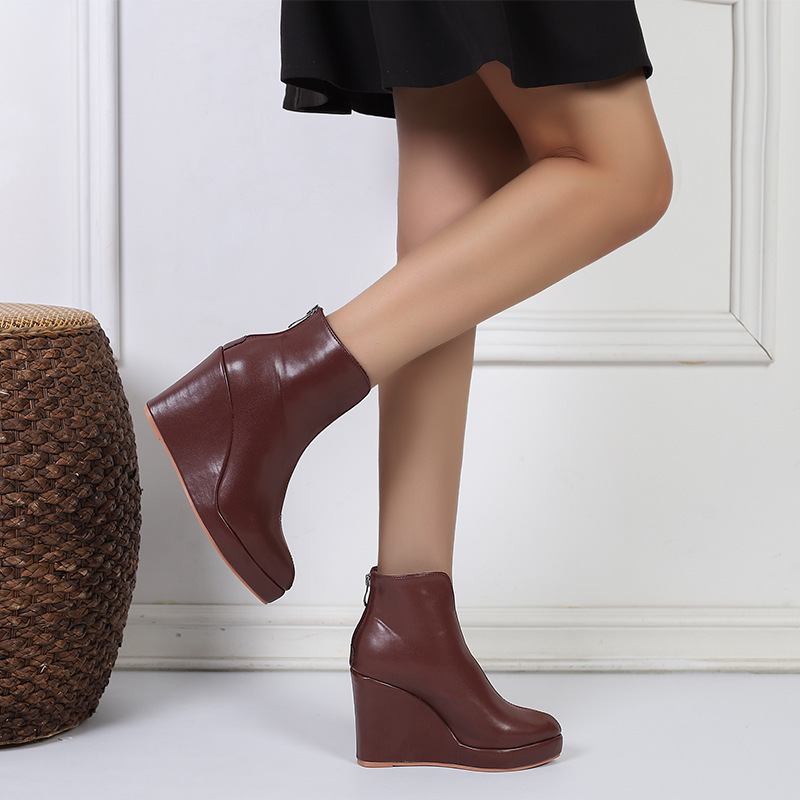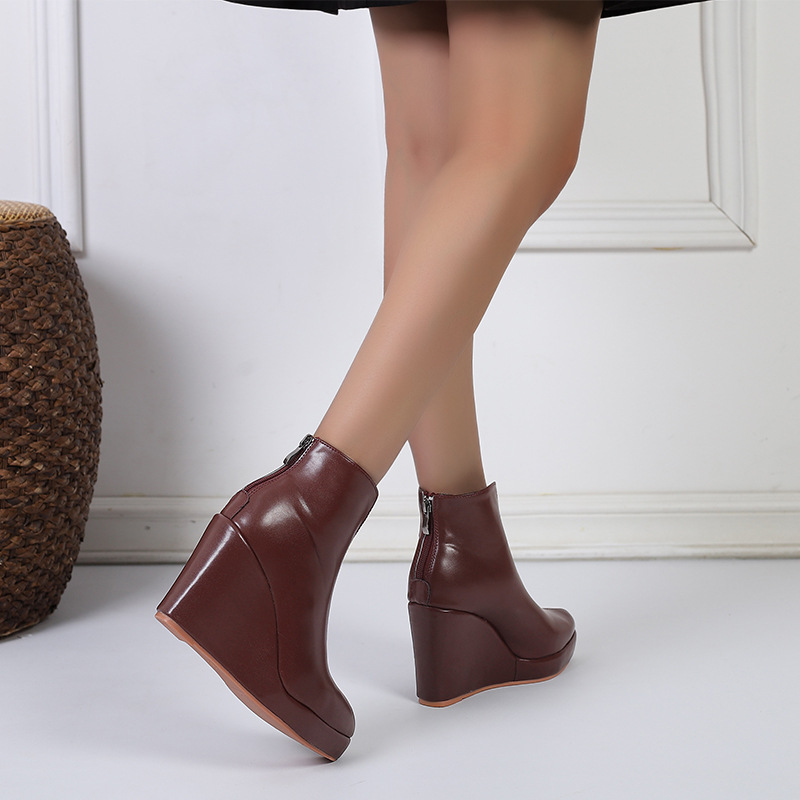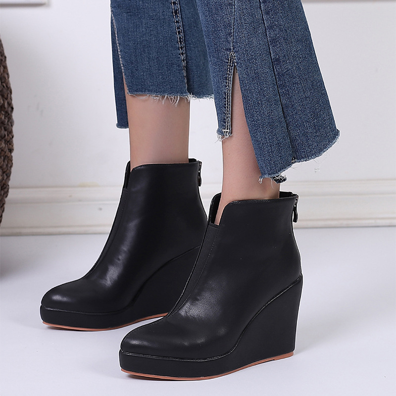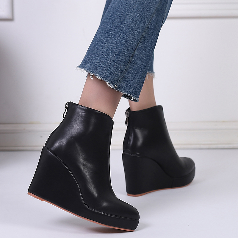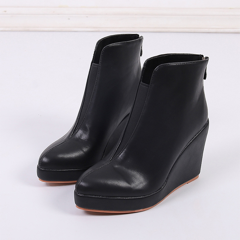 아마존 가을과 겨울 웨지 두꺼운 바닥 하이힐 뾰족한 패션 부츠 블랙 백 지퍼 AliExpress 국경 간 대외 무역